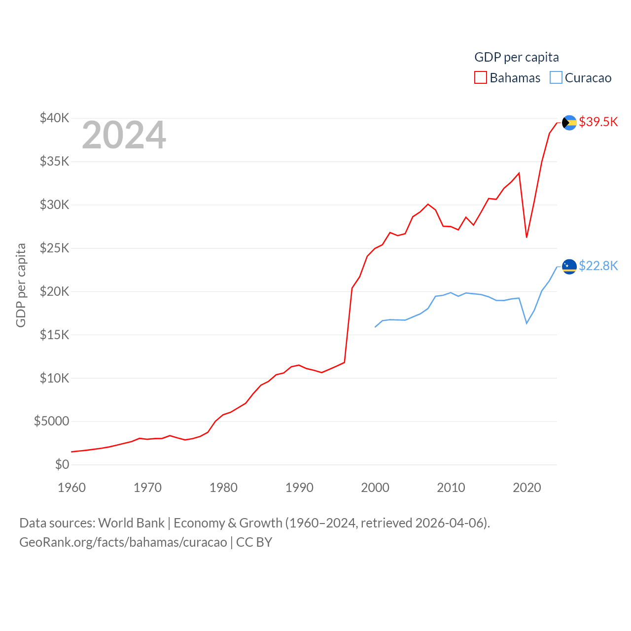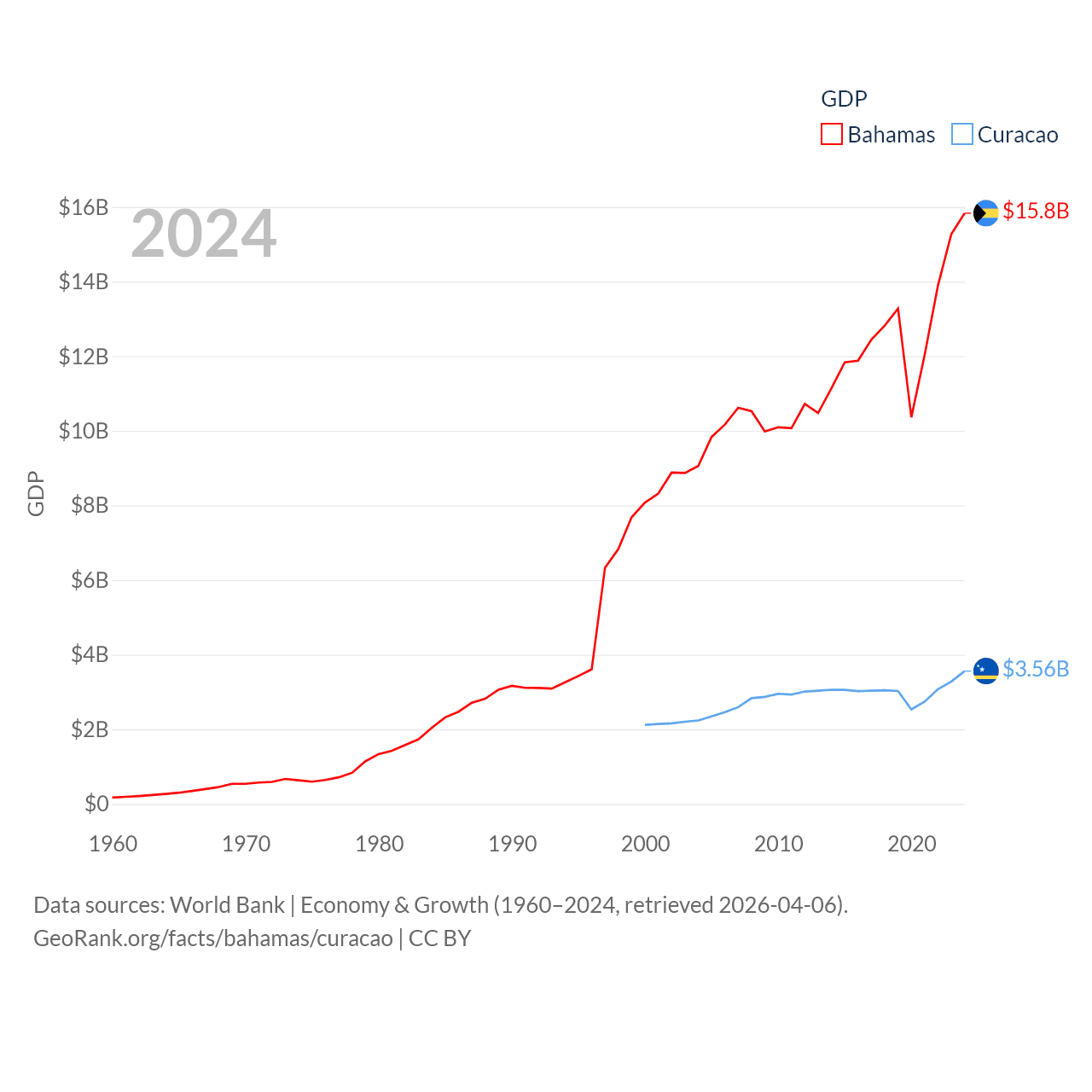 By GDP, The Bahamas ranks 140/197 ($15.8B) and Curacao ranks 167/197 ($3.56B). By GDP per capita, The Bahamas ranks 30/197 ($39,455), while Curacao ranks 56/197 ($22,833).