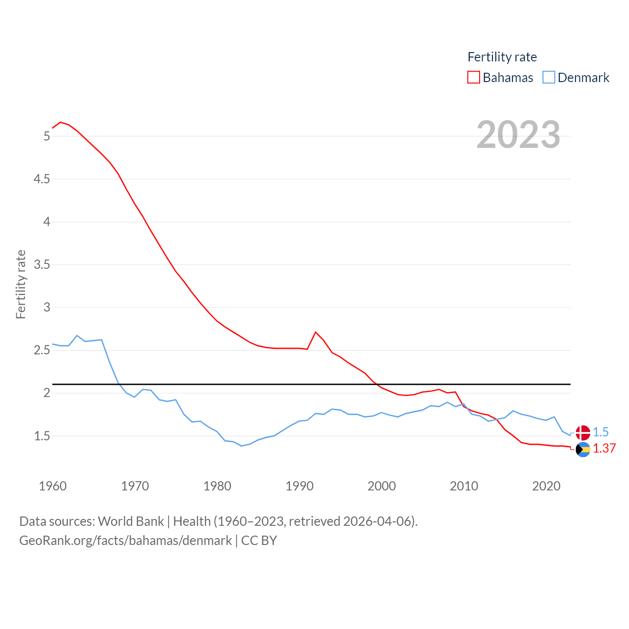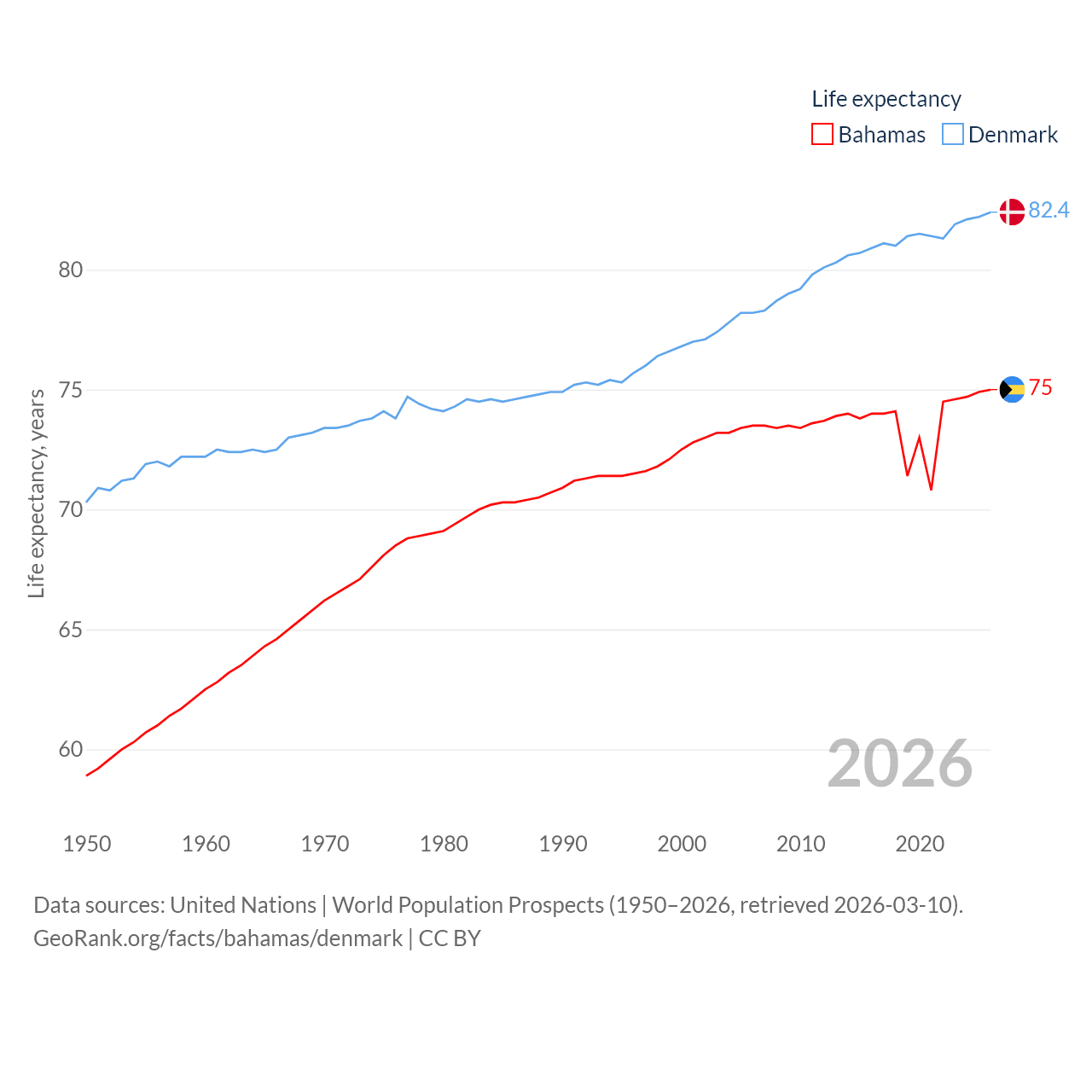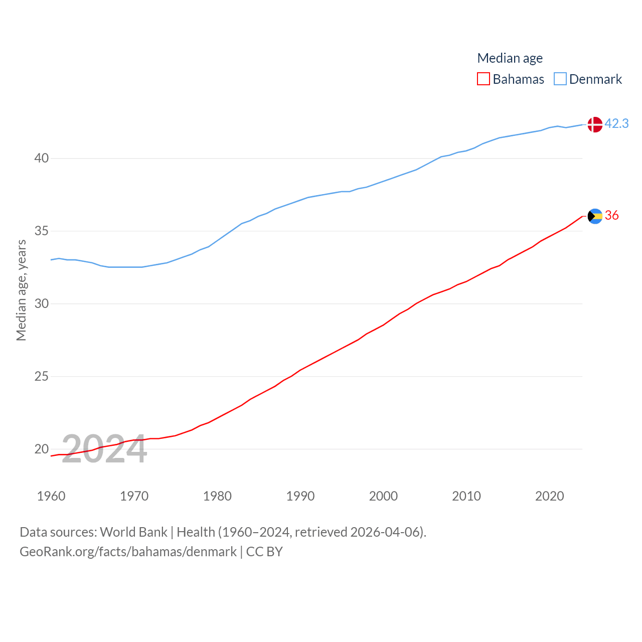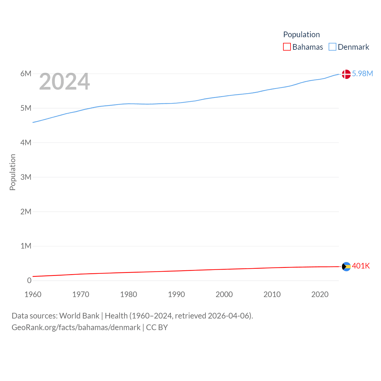 The Bahamas has a population of 401K (ranked 172/197), compared with 5.98M in Denmark (ranked 114/197). The Bahamas' land area is 3,865 sq mi versus 15,444 sq mi for Denmark (ranked 162nd vs. 130th).