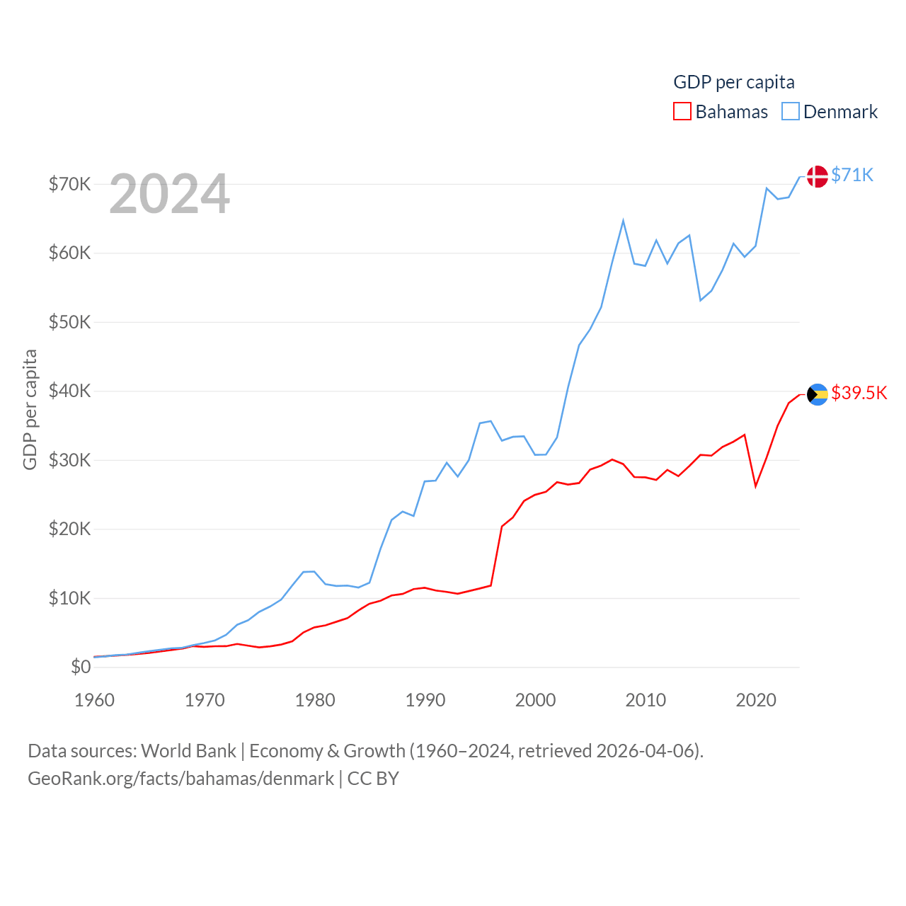 By GDP, The Bahamas ranks 140/197 ($15.8B) and Denmark ranks 37/197 ($425B). By GDP per capita, The Bahamas ranks 30/197 ($39,455), while Denmark ranks 12/197 ($71,026).