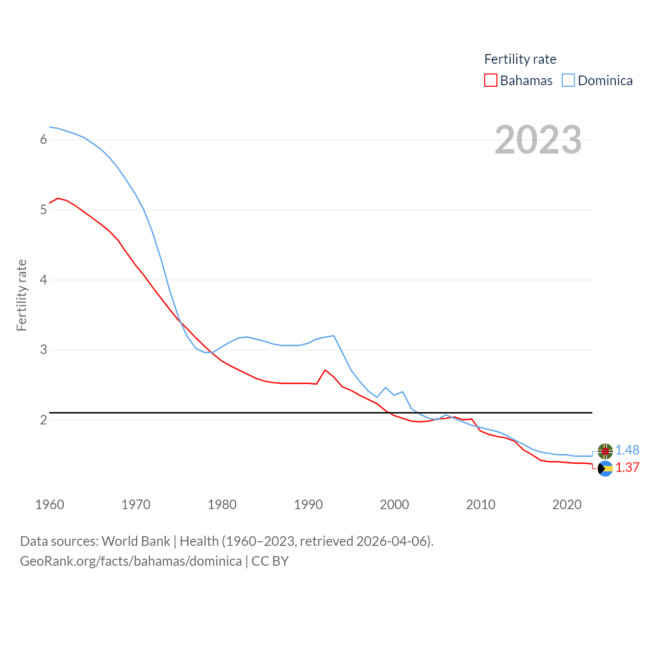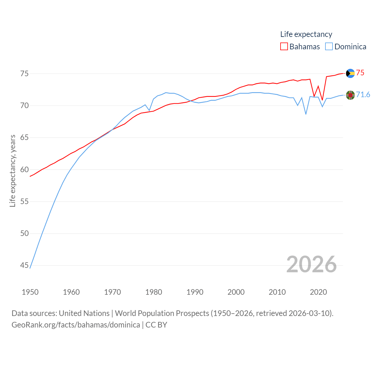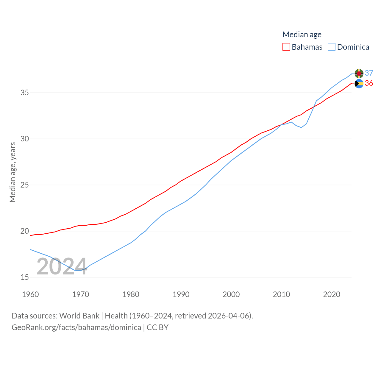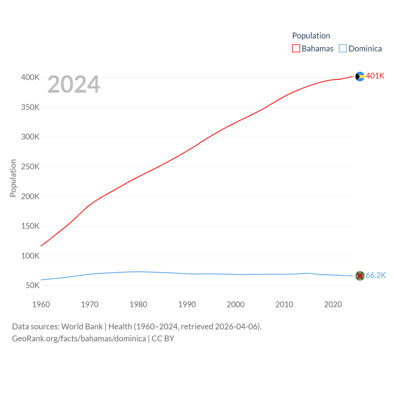 The Bahamas has a population of 401K (ranked 172/197), compared with 66.2K in Dominica (ranked 188/197). The Bahamas' land area is 3,865 sq mi versus 289.6 sq mi for Dominica (ranked 162nd vs. 175th).