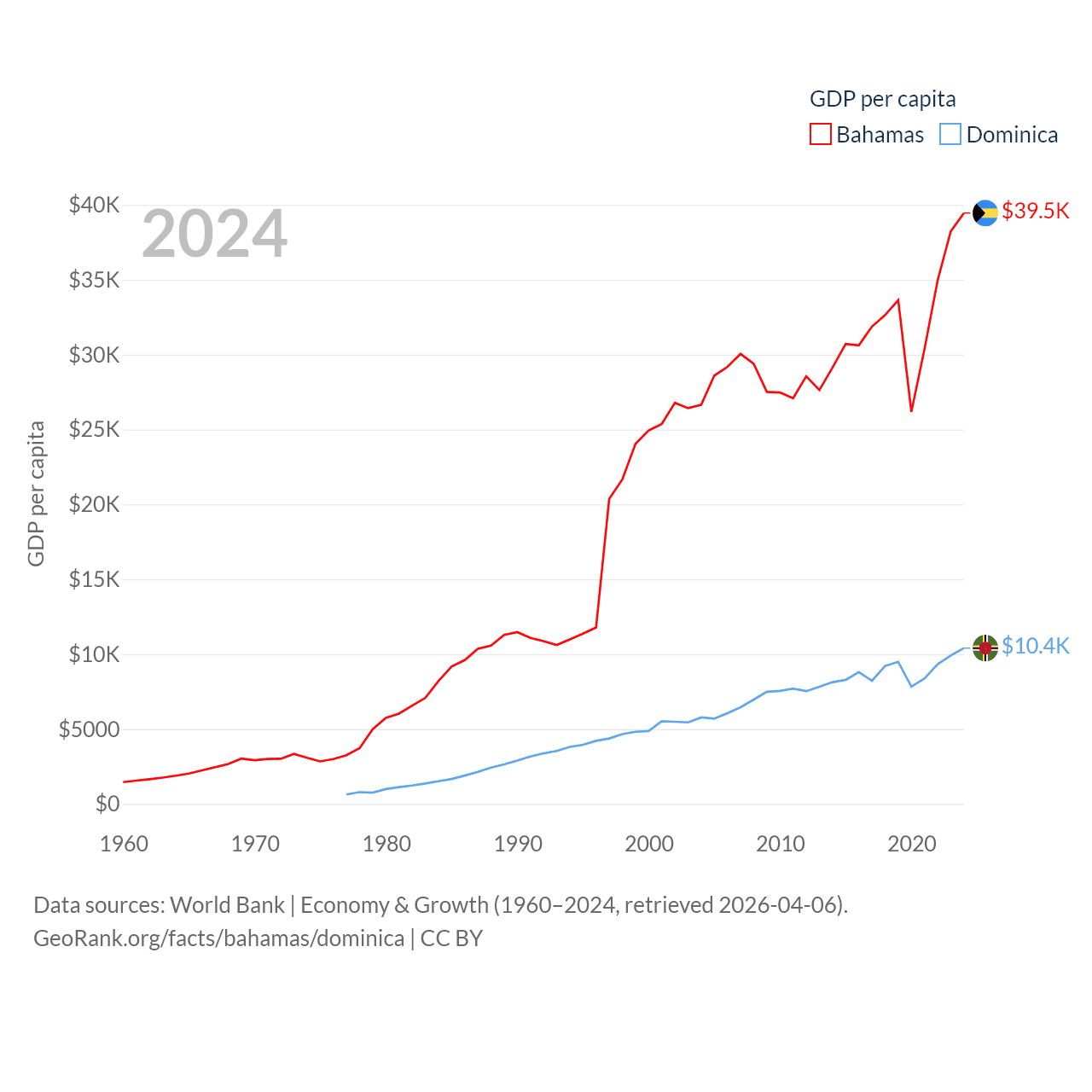 By GDP, The Bahamas ranks 140/197 ($15.8B) and Dominica ranks 190/197 ($689M). By GDP per capita, The Bahamas ranks 30/197 ($39,455), while Dominica ranks 84/197 ($10,405).