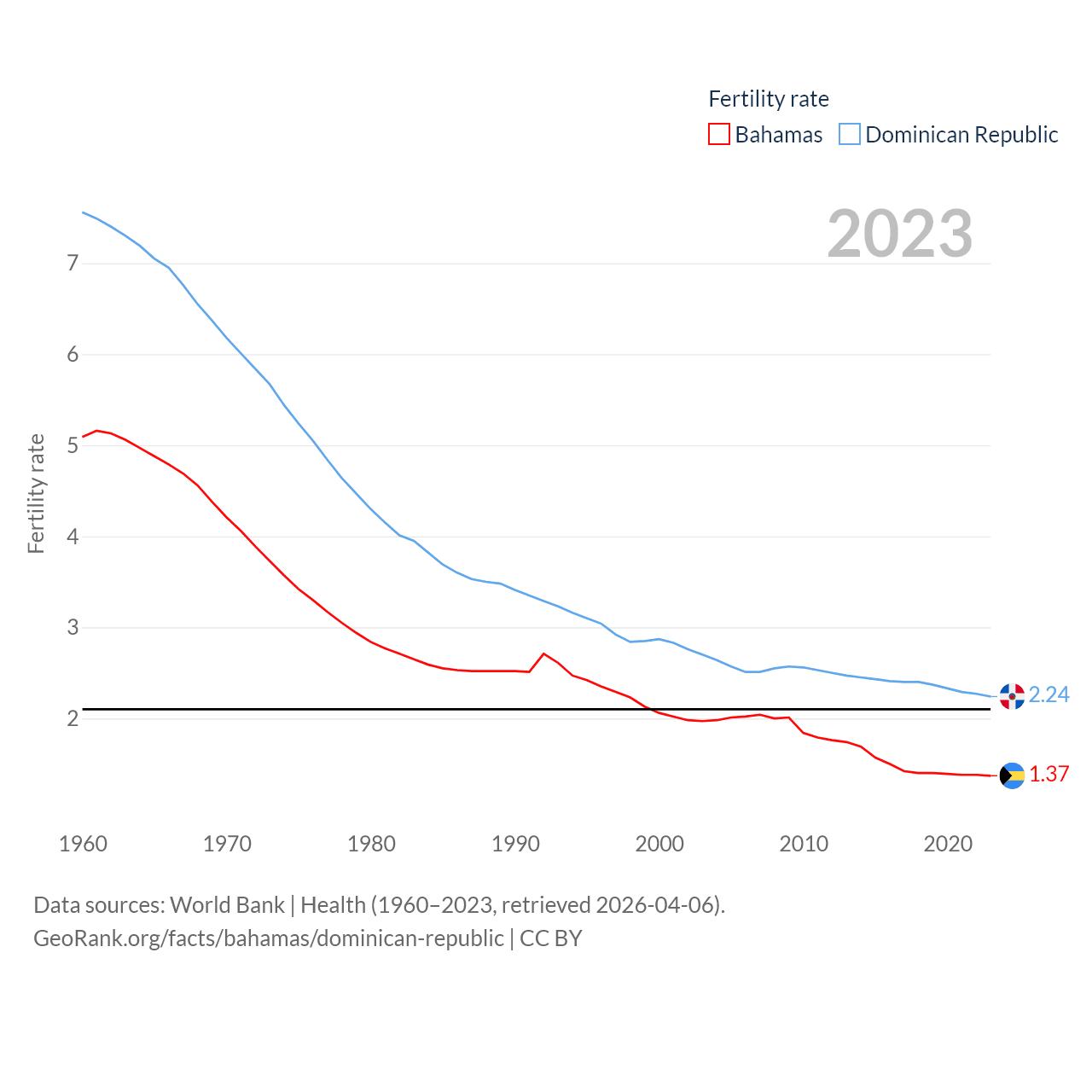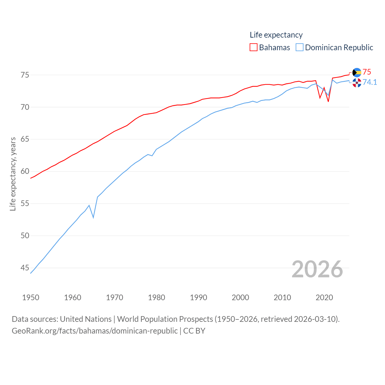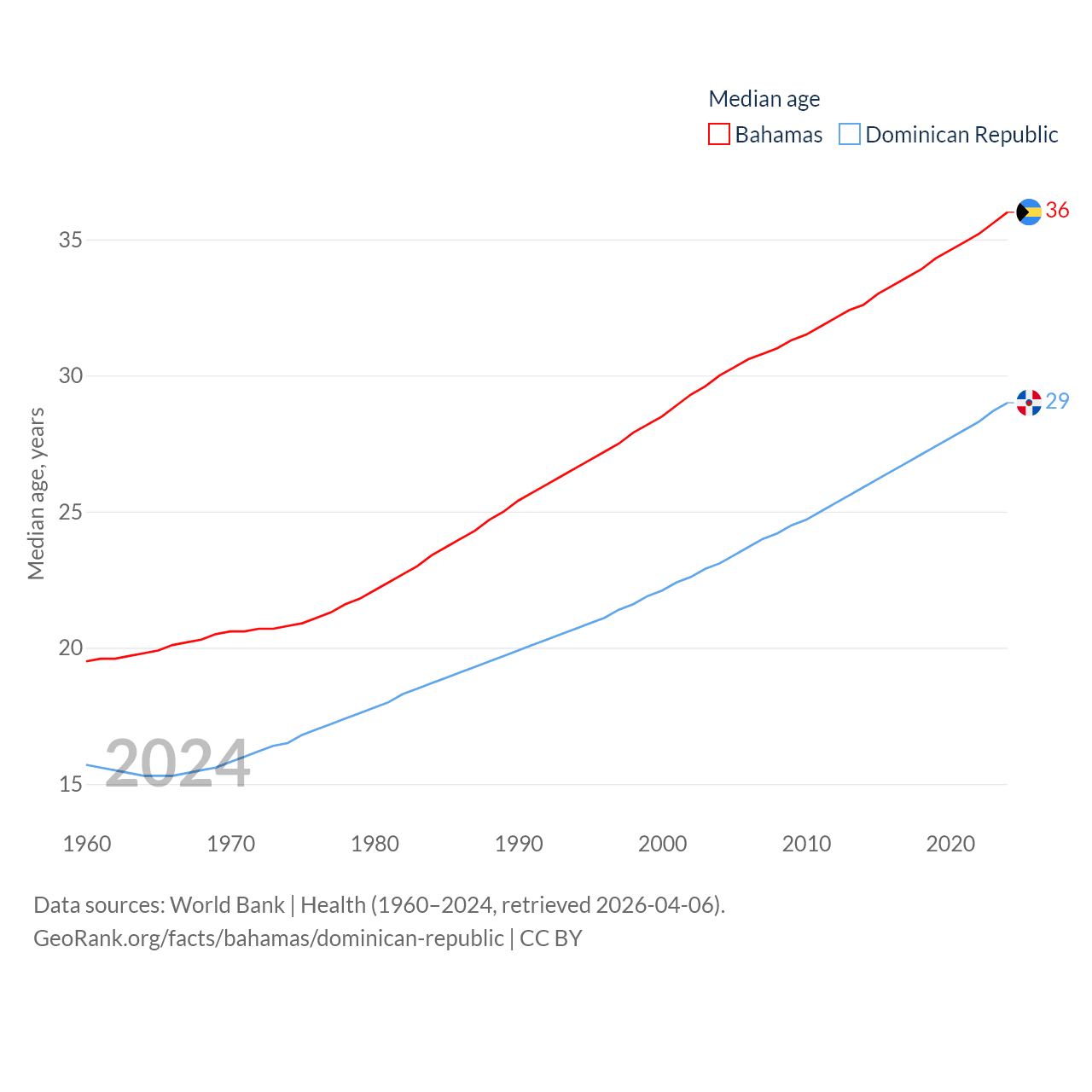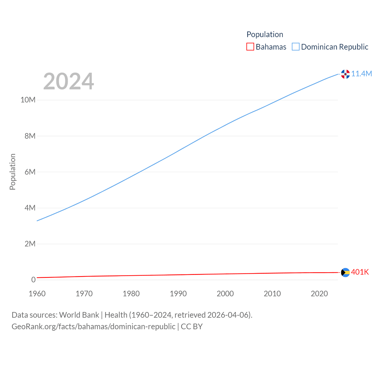 The Bahamas has a population of 401K (ranked 172/197), compared with 11.4M in The Dominican Republic (ranked 85/197). The Bahamas' land area is 3,865 sq mi versus 18,609 sq mi for The Dominican Republic (ranked 162nd vs. 127th).