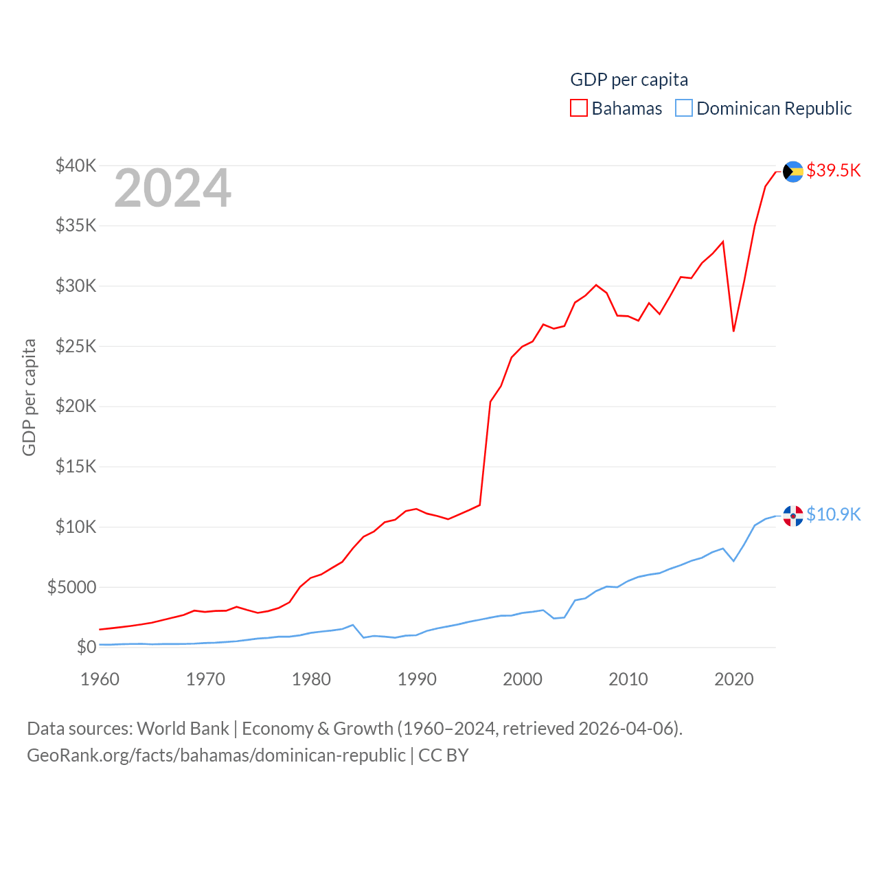 By GDP, The Bahamas ranks 140/197 ($15.8B) and The Dominican Republic ranks 63/197 ($124B). By GDP per capita, The Bahamas ranks 30/197 ($39,455), while The Dominican Republic ranks 83/197 ($10,876).
