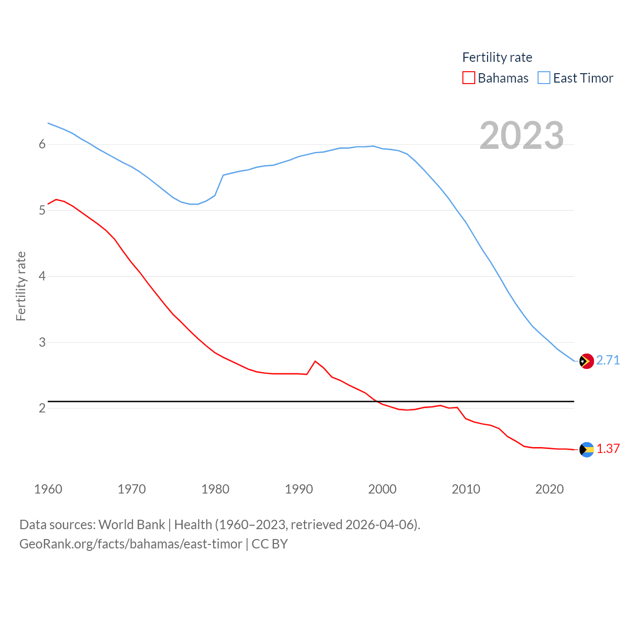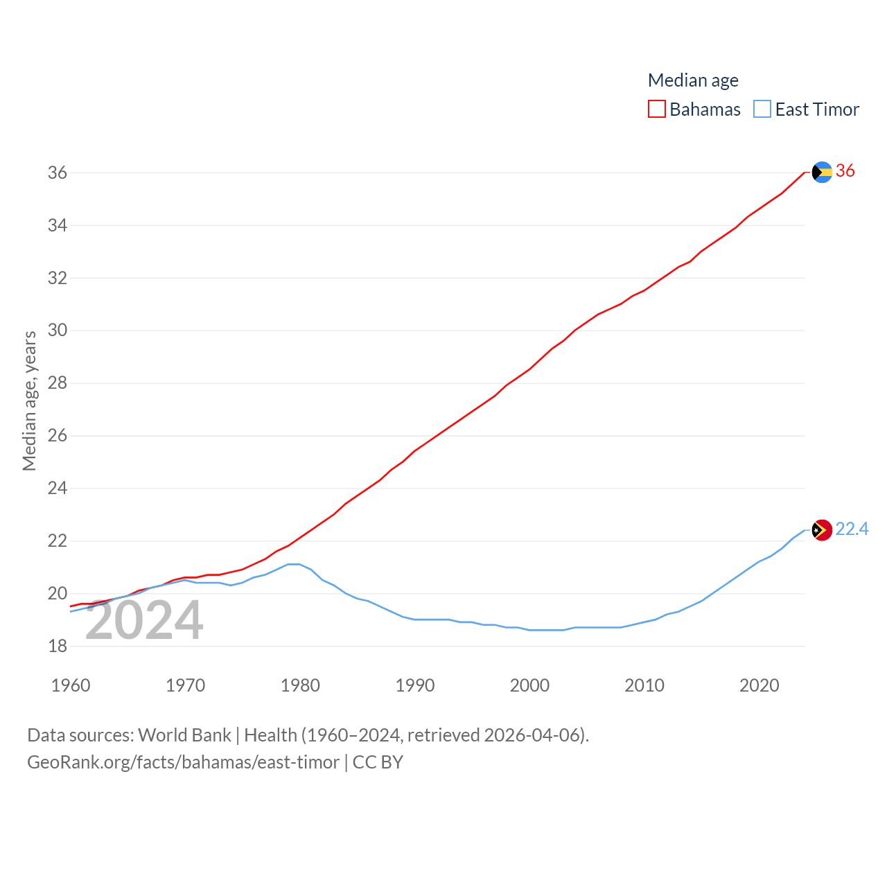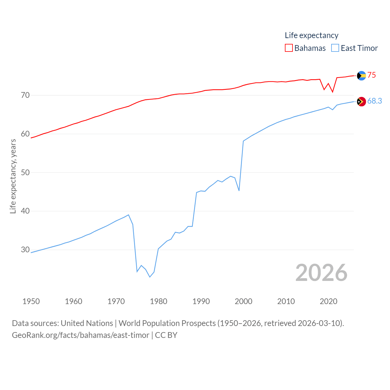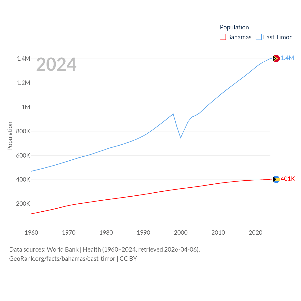 The Bahamas has a population of 401K (ranked 172/197), compared with 1.4M in East Timor (ranked 152/197). The Bahamas' land area is 3,865 sq mi versus 5,741 sq mi for East Timor (ranked 162nd vs. 155th).