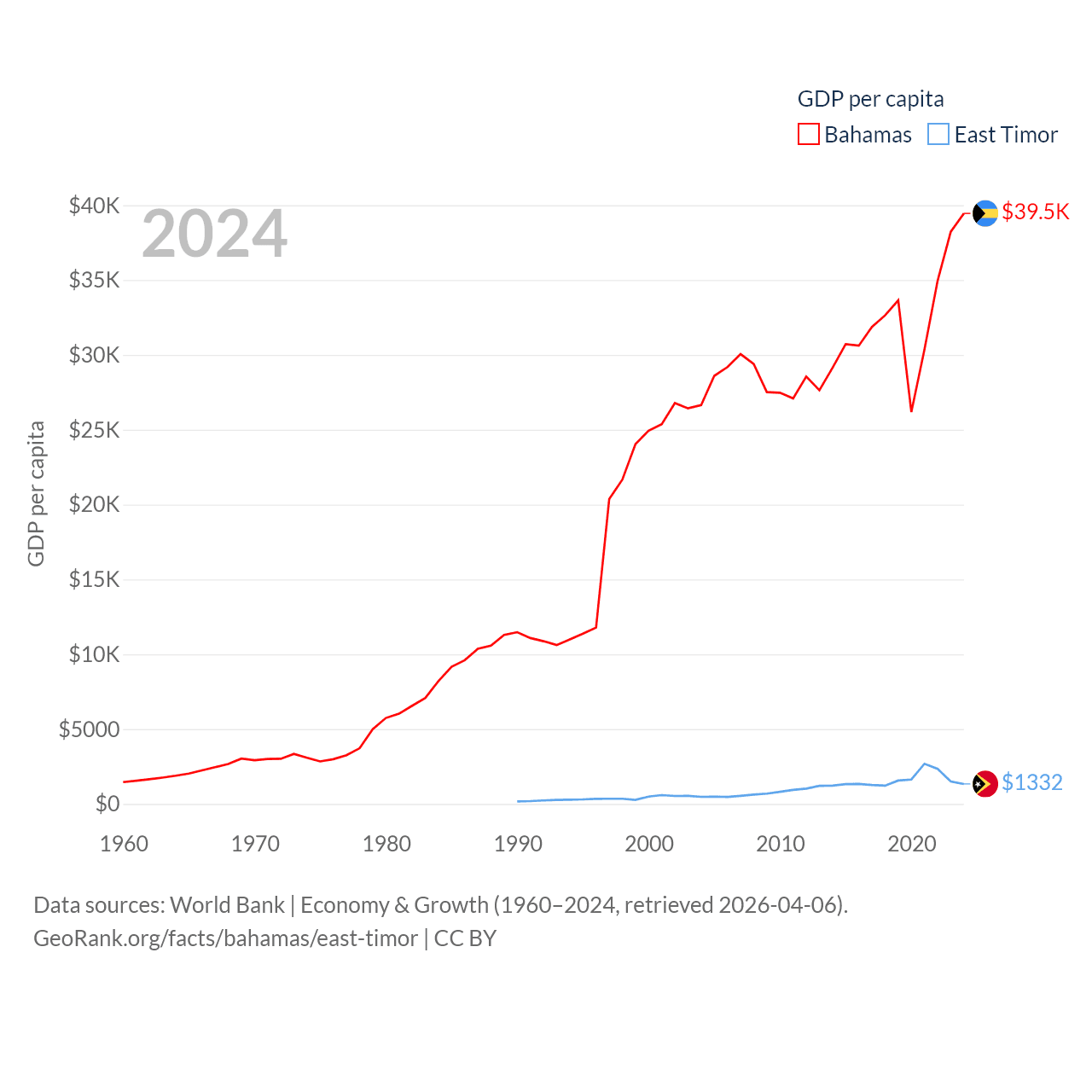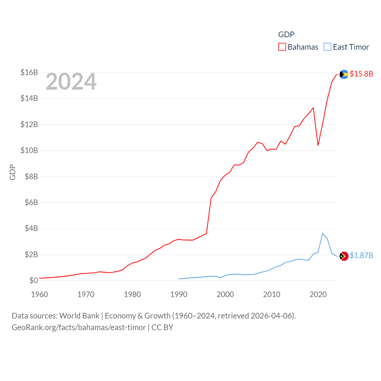 By GDP, The Bahamas ranks 140/197 ($15.8B) and East Timor ranks 181/197 ($1.87B). By GDP per capita, The Bahamas ranks 30/197 ($39,455), while East Timor ranks 167/197 ($1,332).