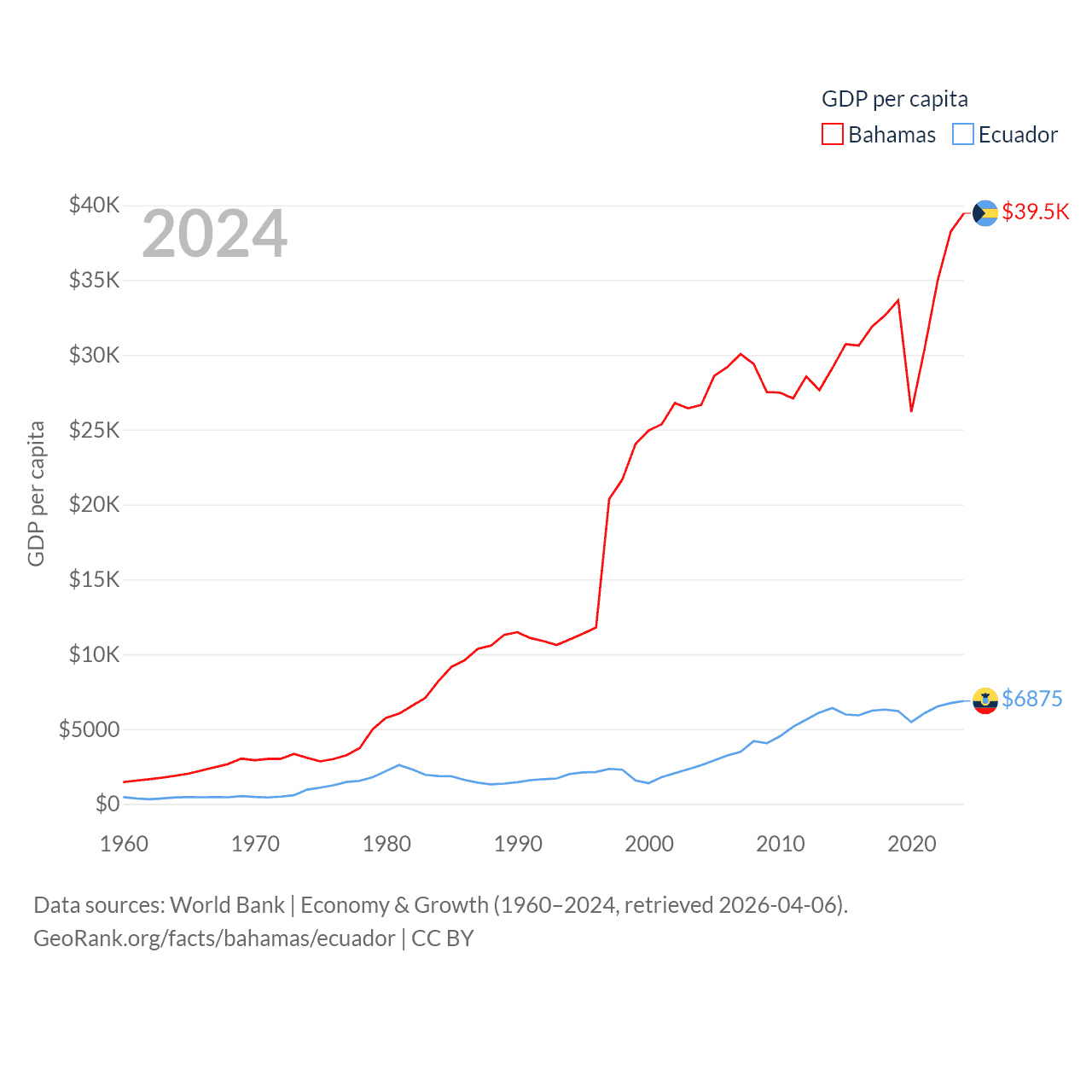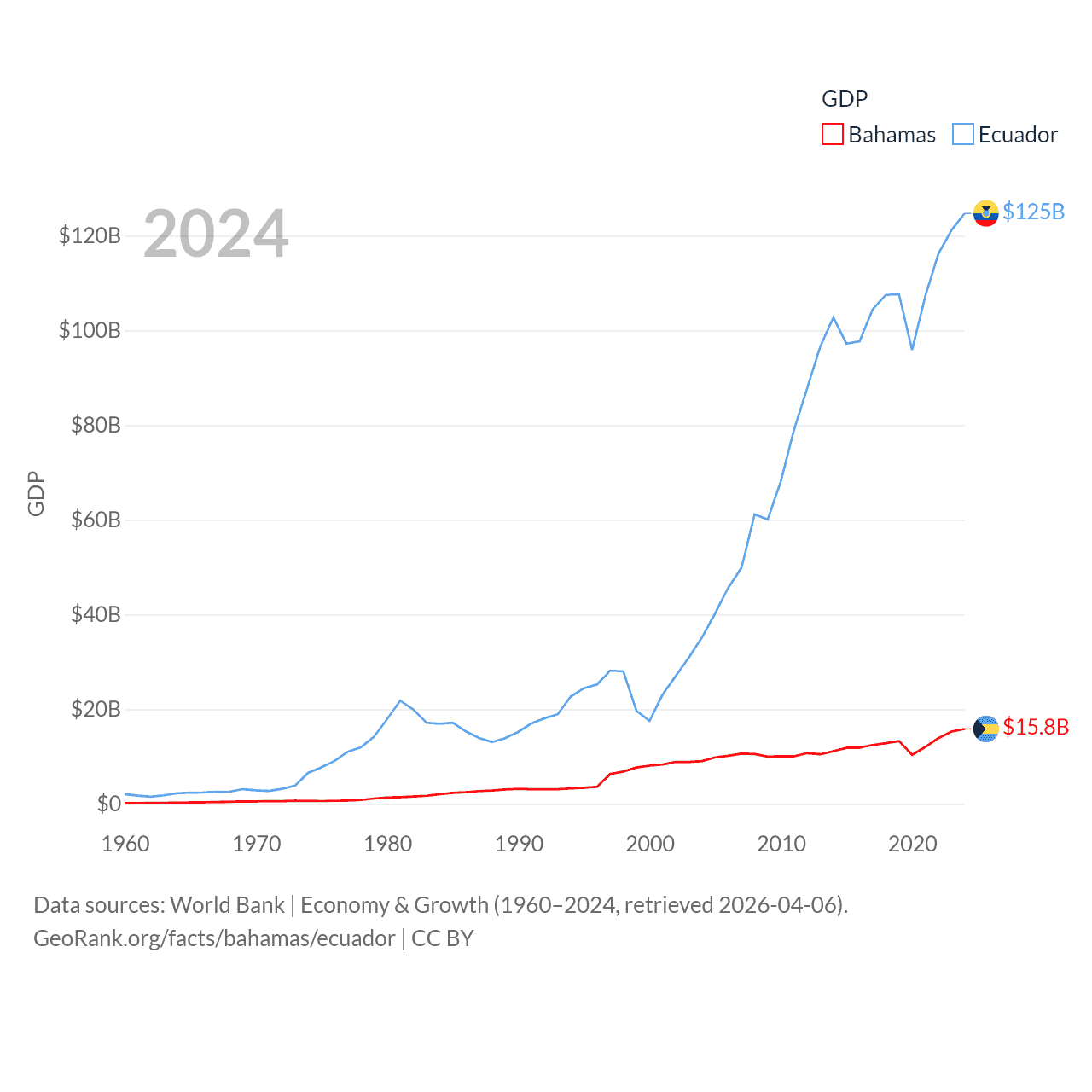 By GDP, The Bahamas ranks 140/197 ($15.8B) and Ecuador ranks 62/197 ($125B). By GDP per capita, The Bahamas ranks 30/197 ($39,455), while Ecuador ranks 103/197 ($6,875).