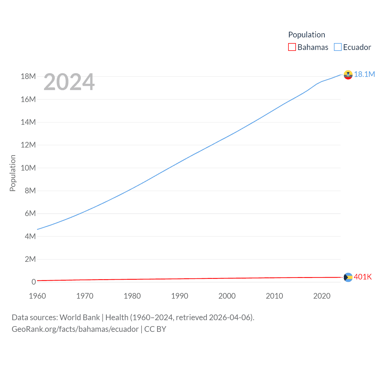 The Bahamas has a population of 401K (ranked 172/197), compared with 18.1M in Ecuador (ranked 71/197). The Bahamas' land area is 3,865 sq mi versus 95,892 sq mi for Ecuador (ranked 162nd vs. 76th).