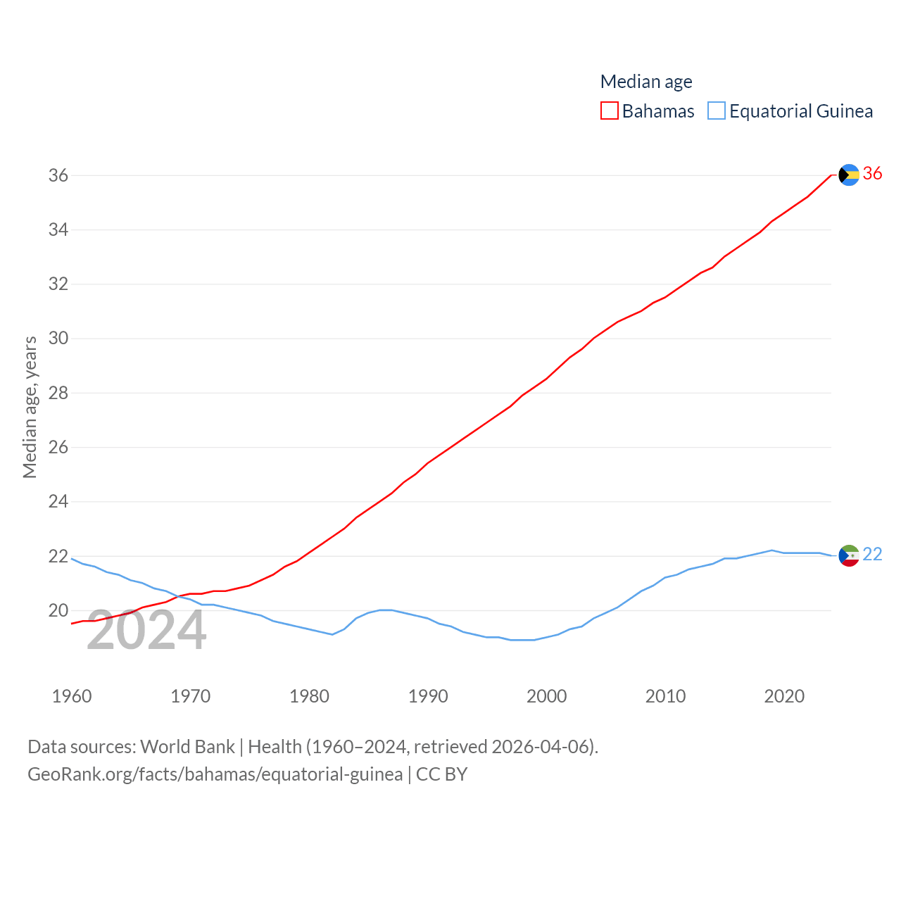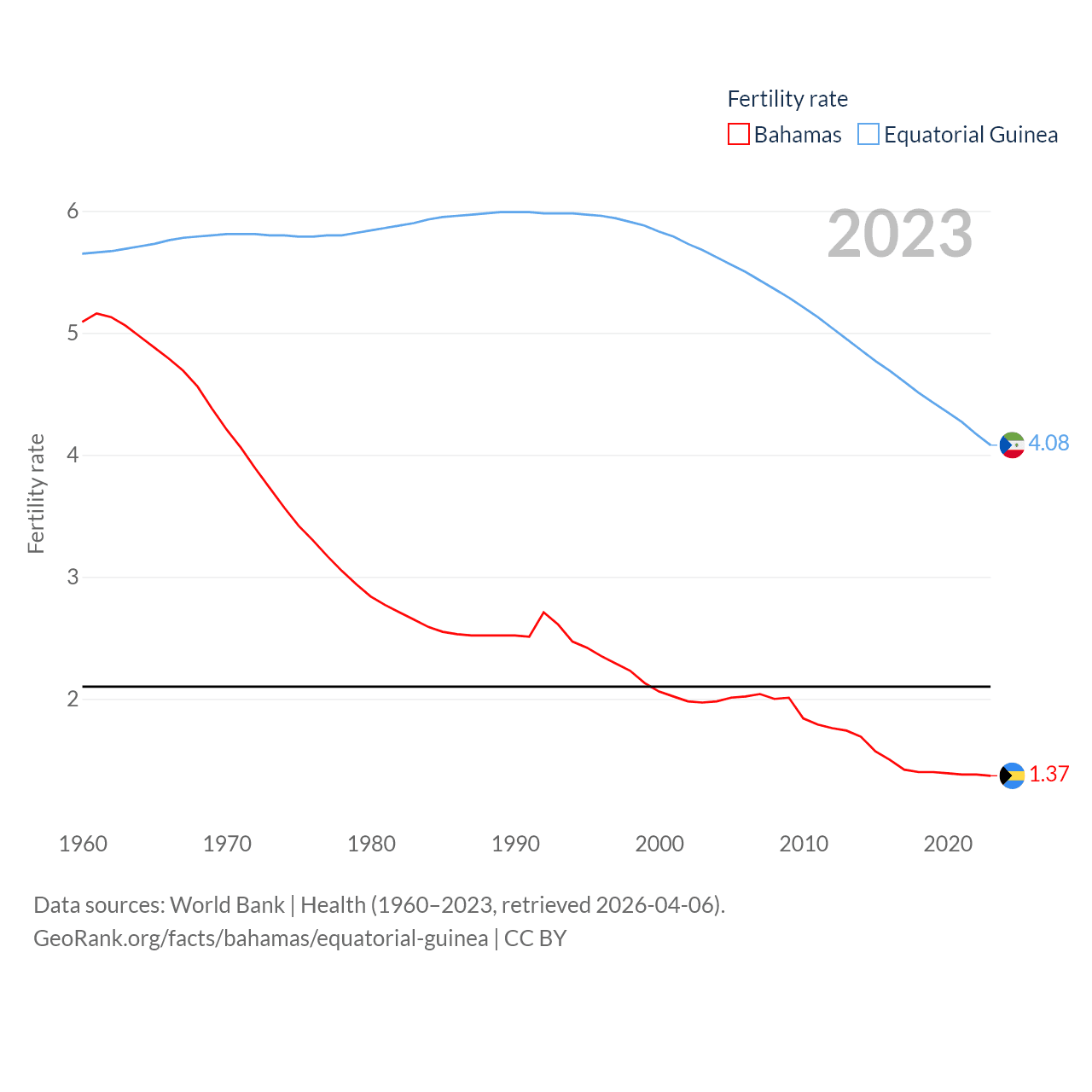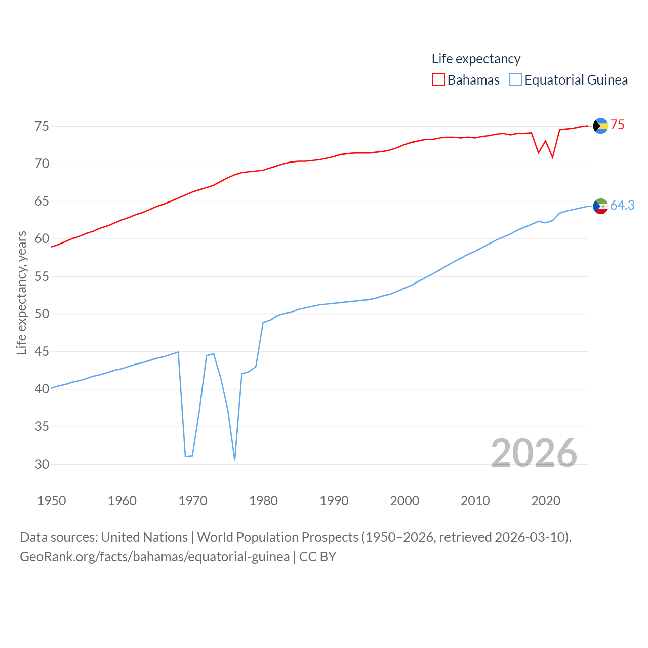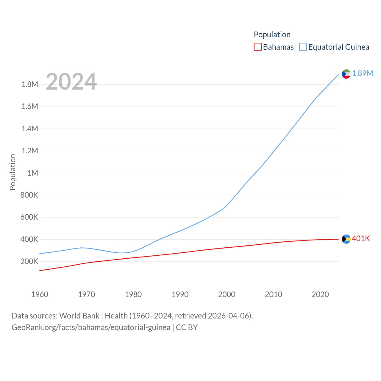 The Bahamas has a population of 401K (ranked 172/197), compared with 1.89M in Equatorial Guinea (ranked 148/197). The Bahamas' land area is 3,865 sq mi versus 10,830 sq mi for Equatorial Guinea (ranked 162nd vs. 140th).