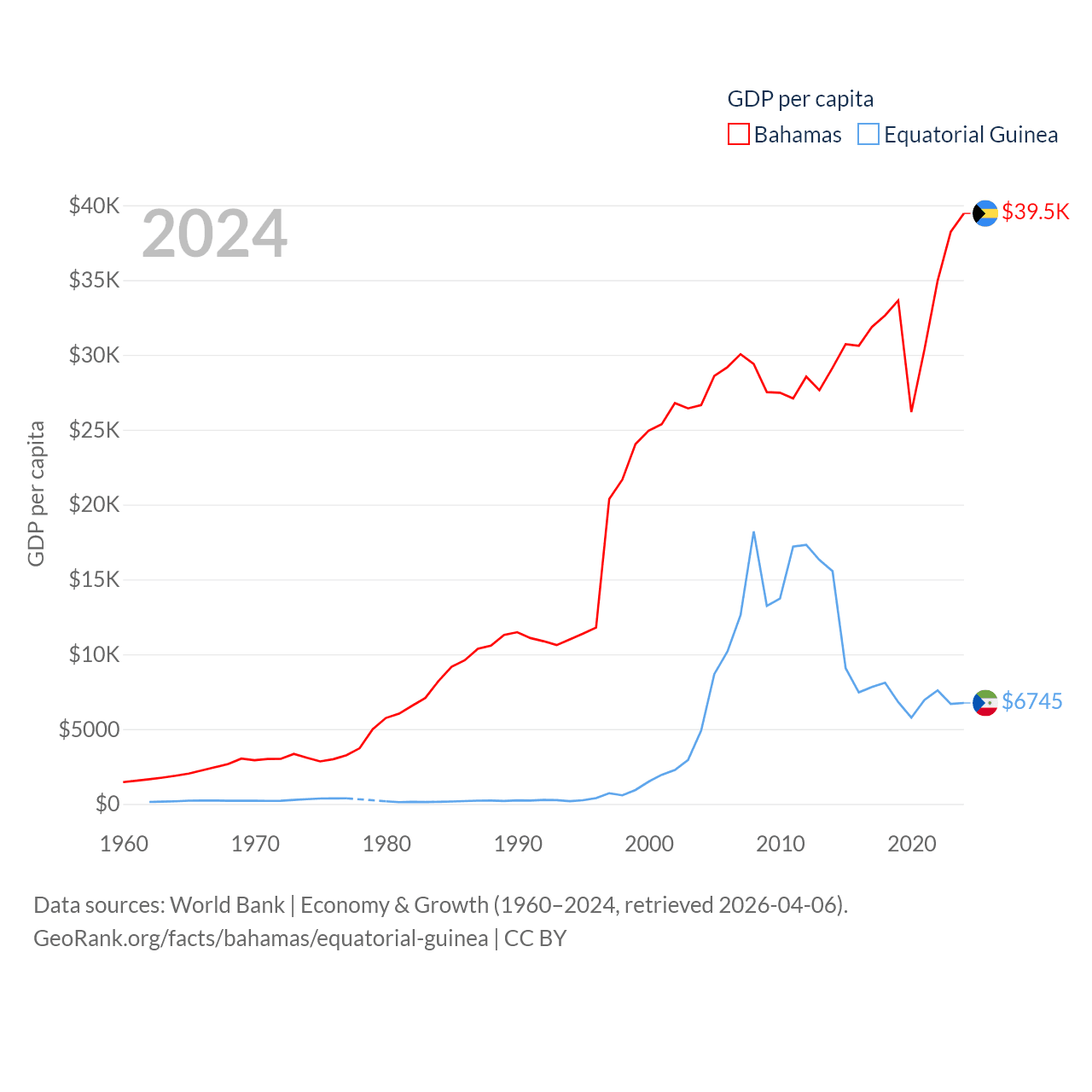 By GDP, The Bahamas ranks 140/197 ($15.8B) and Equatorial Guinea ranks 148/197 ($12.8B). By GDP per capita, The Bahamas ranks 30/197 ($39,455), while Equatorial Guinea ranks 106/197 ($6,745).