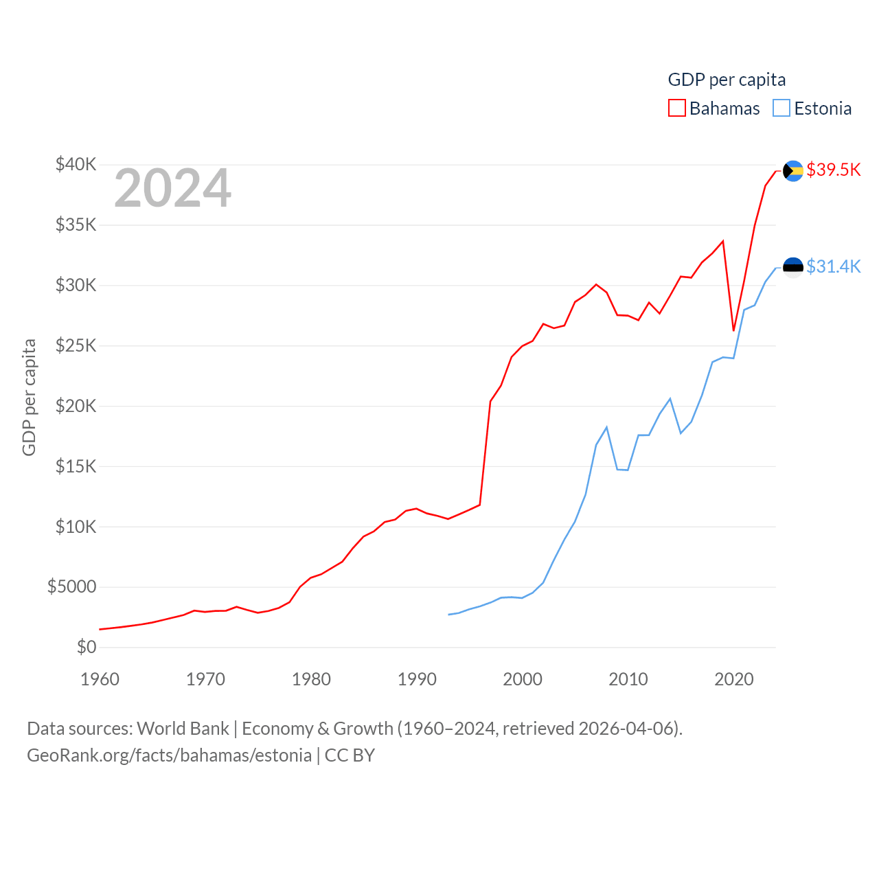 By GDP, The Bahamas ranks 140/197 ($15.8B) and Estonia ranks 100/197 ($43.1B). By GDP per capita, The Bahamas ranks 30/197 ($39,455), while Estonia ranks 40/197 ($31,428).