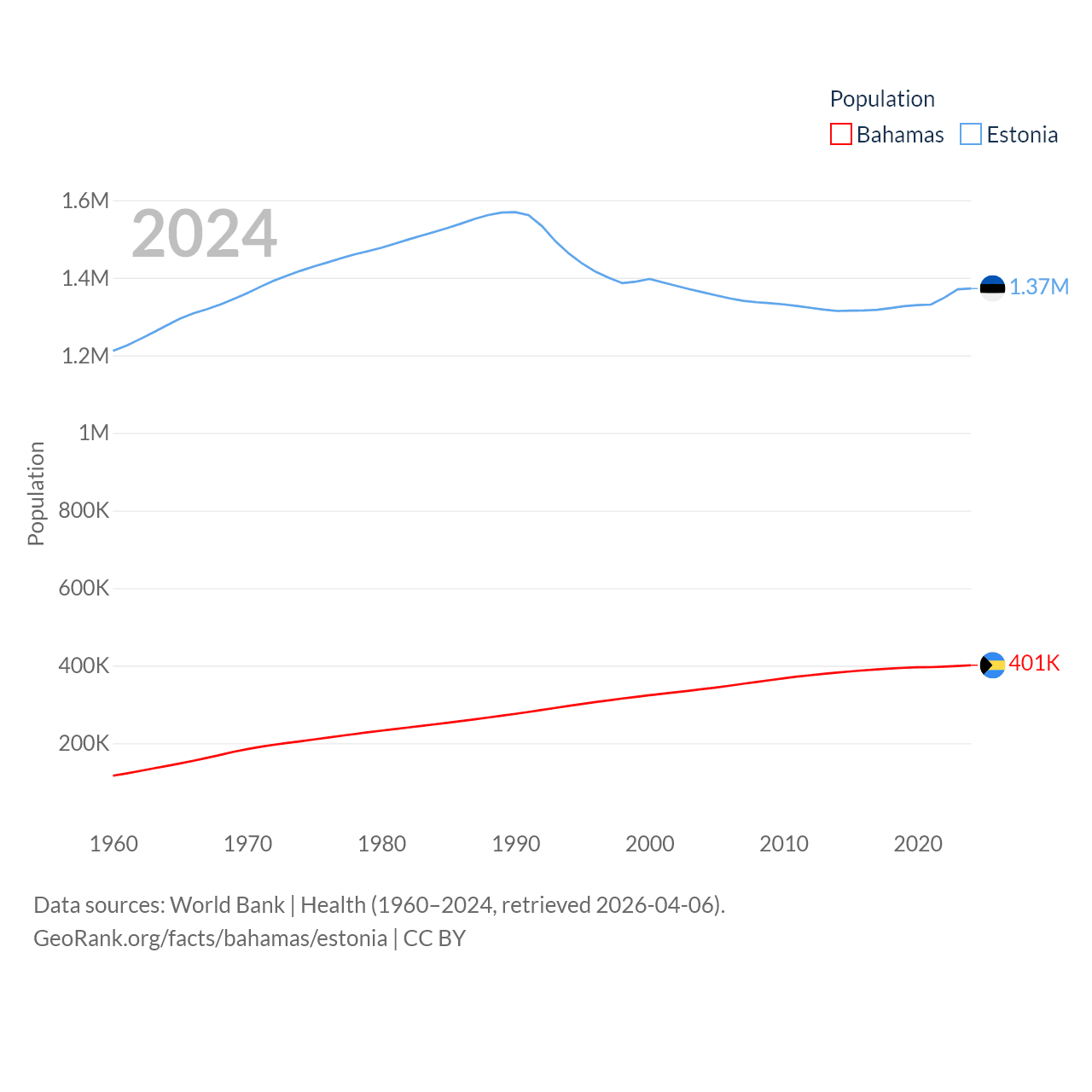 The Bahamas has a population of 401K (ranked 172/197), compared with 1.37M in Estonia (ranked 153/197). The Bahamas' land area is 3,865 sq mi versus 16,498 sq mi for Estonia (ranked 162nd vs. 129th).