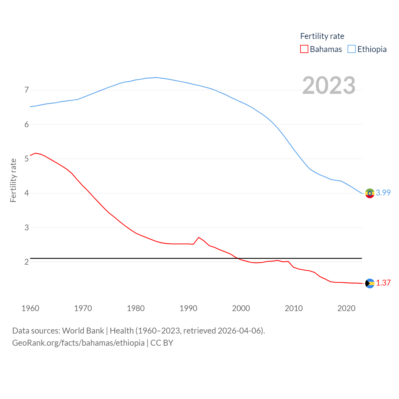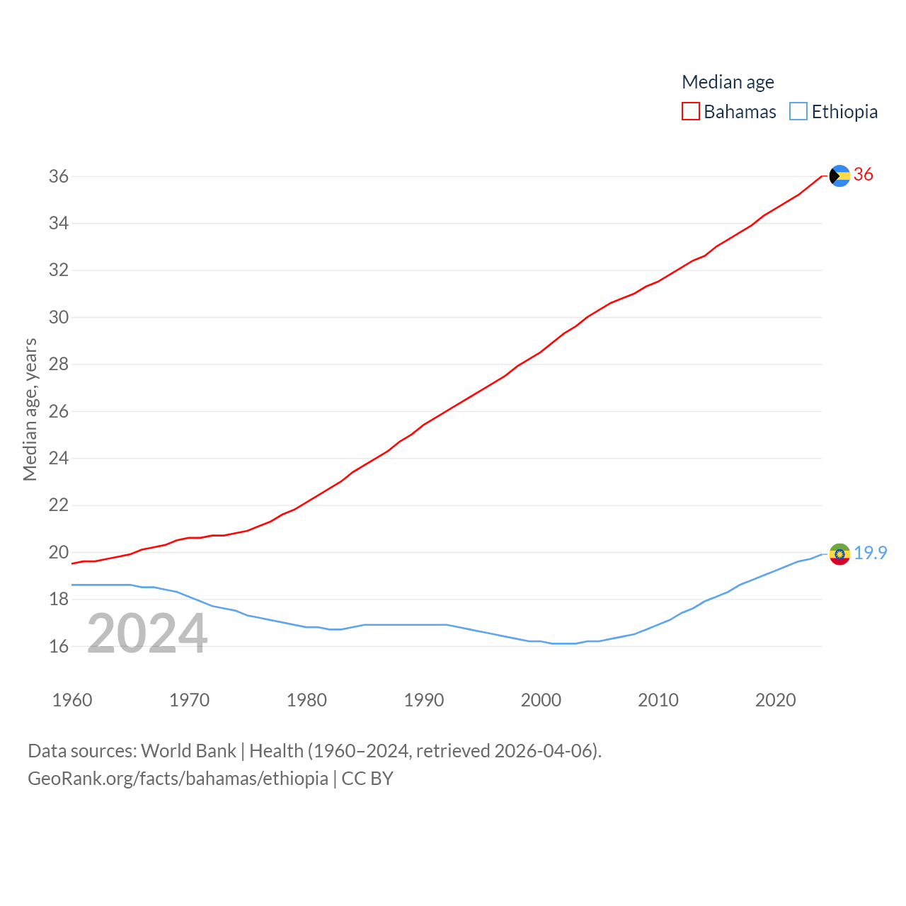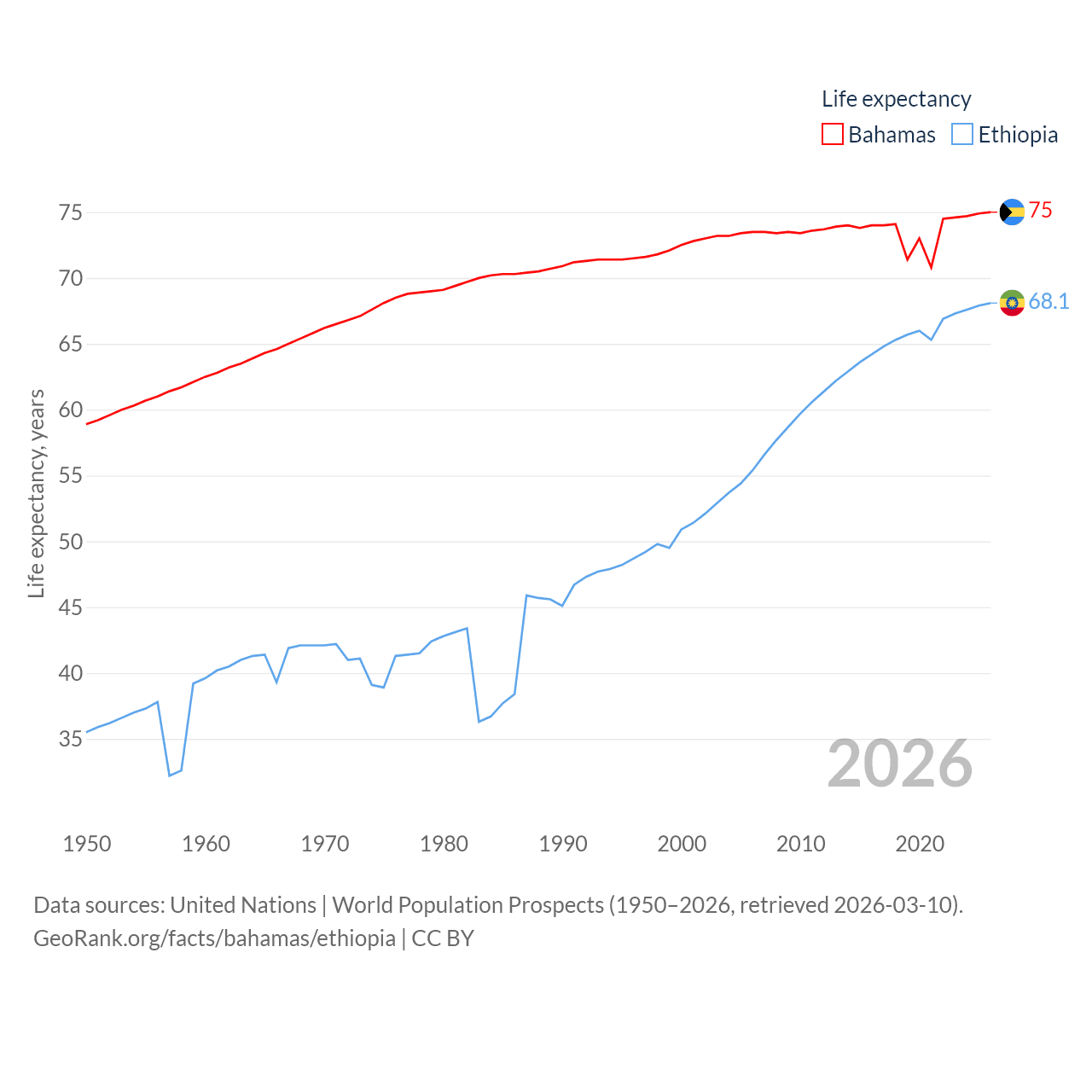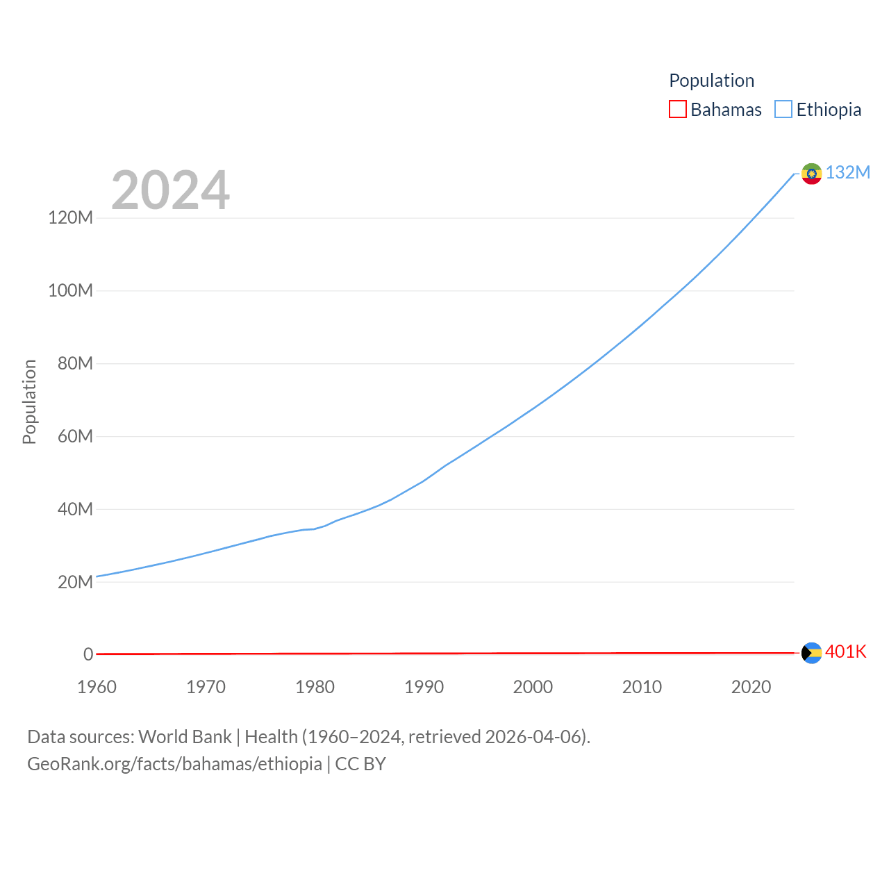The Bahamas has a population of 401K (ranked 172/197), compared with 132M in Ethiopia (ranked 10/197). The Bahamas' land area is 3,865 sq mi versus 435,716 sq mi for Ethiopia (ranked 162nd vs. 25th).