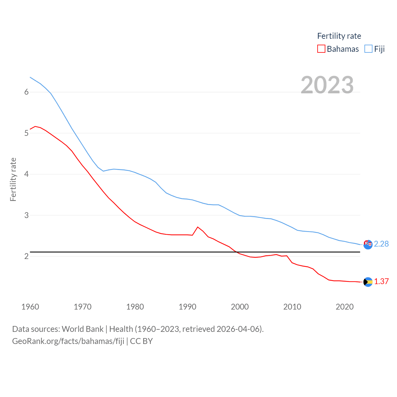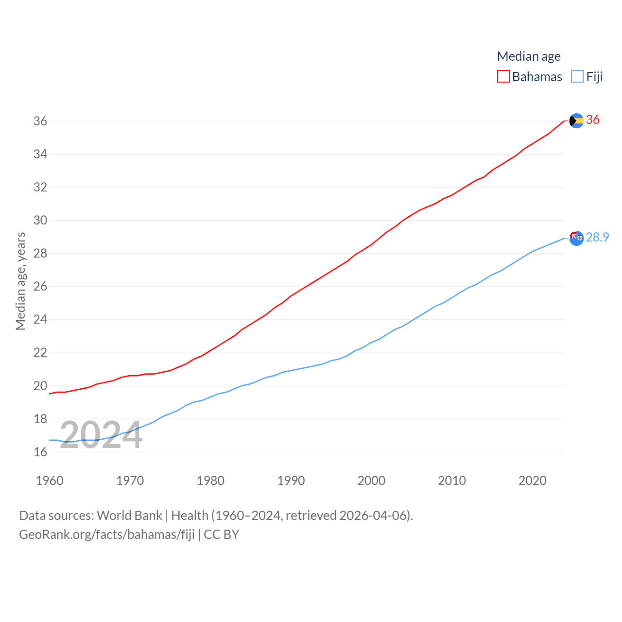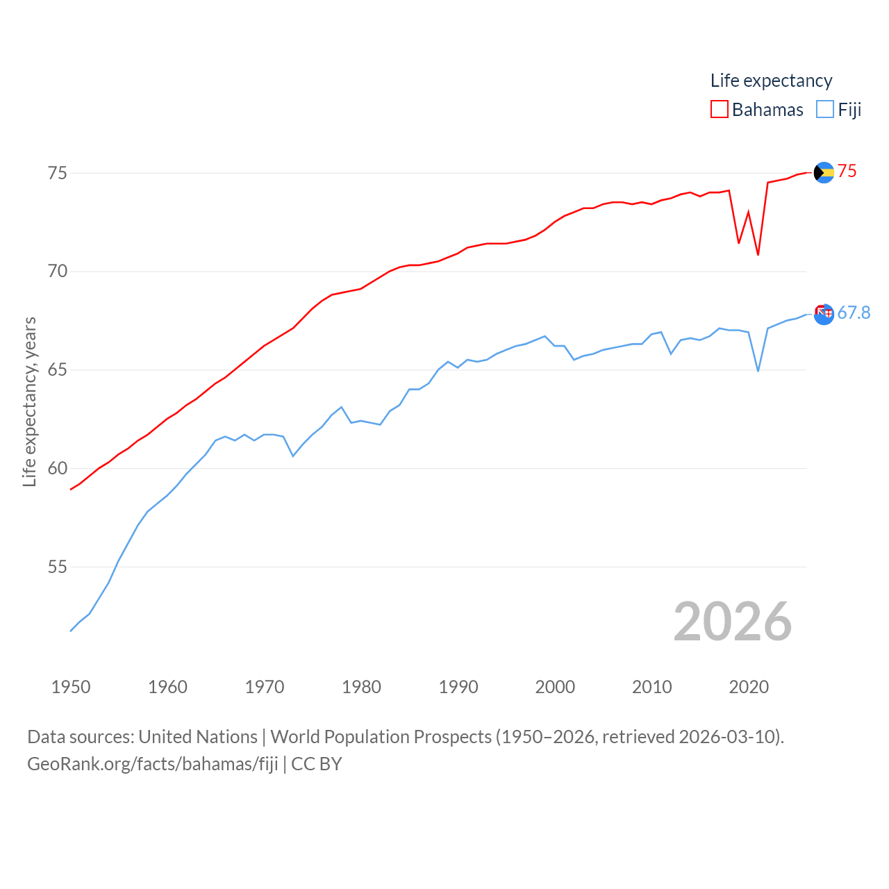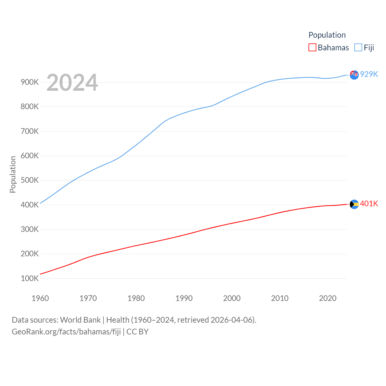 The Bahamas has a population of 401K (ranked 172/197), compared with 929K in Fiji (ranked 159/197). The Bahamas' land area is 3,865 sq mi versus 7,054 sq mi for Fiji (ranked 162nd vs. 152nd).