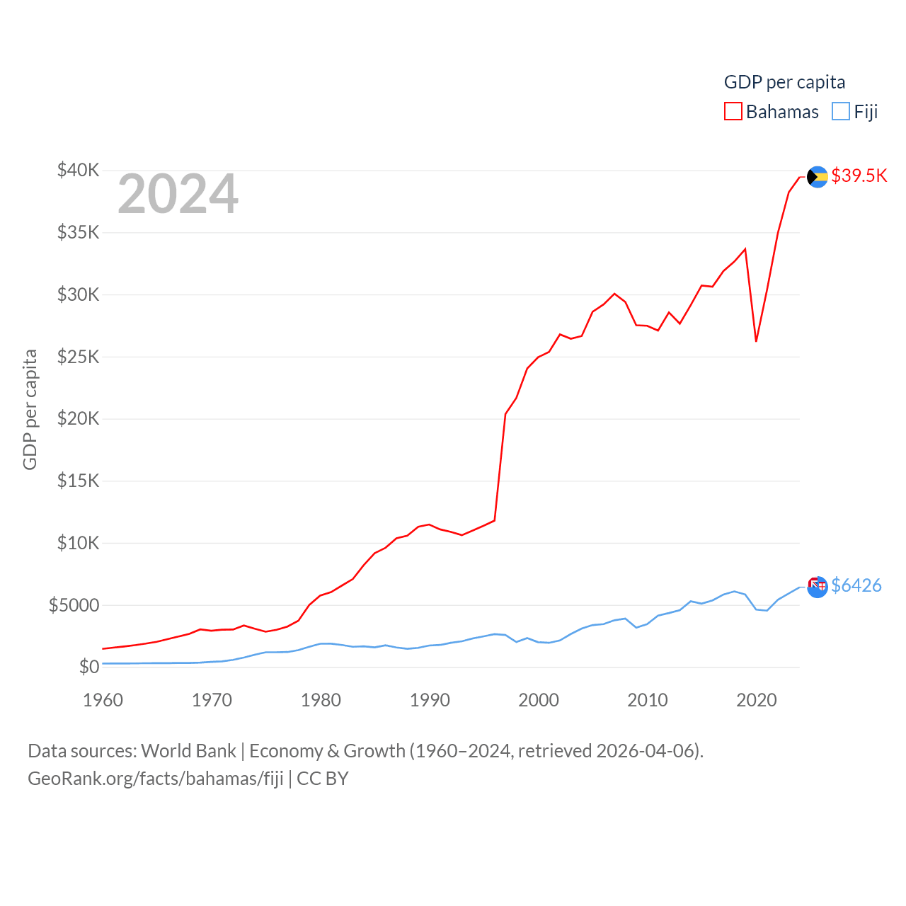 By GDP, The Bahamas ranks 140/197 ($15.8B) and Fiji ranks 161/197 ($5.97B). By GDP per capita, The Bahamas ranks 30/197 ($39,455), while Fiji ranks 108/197 ($6,426).