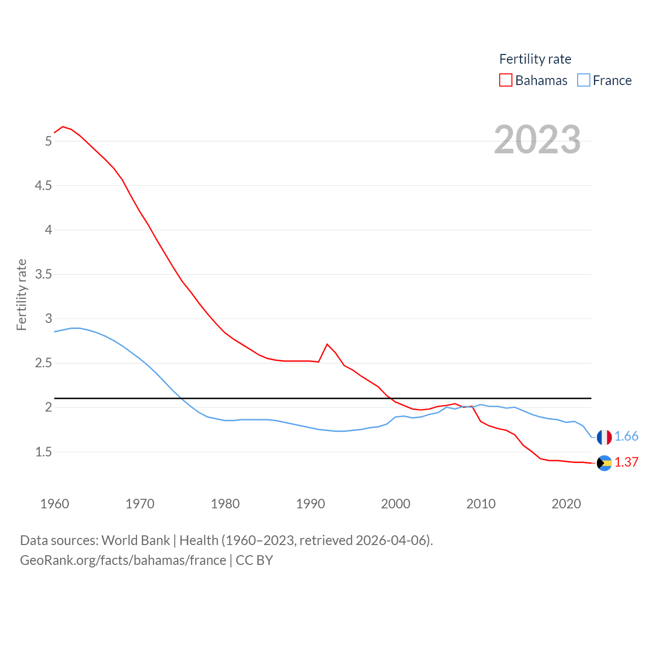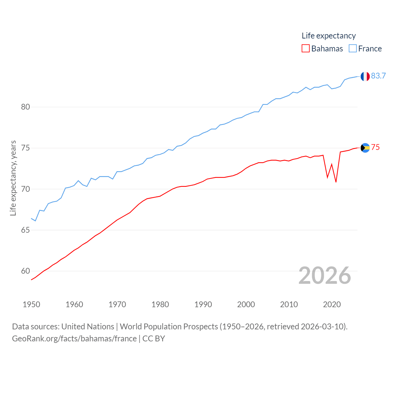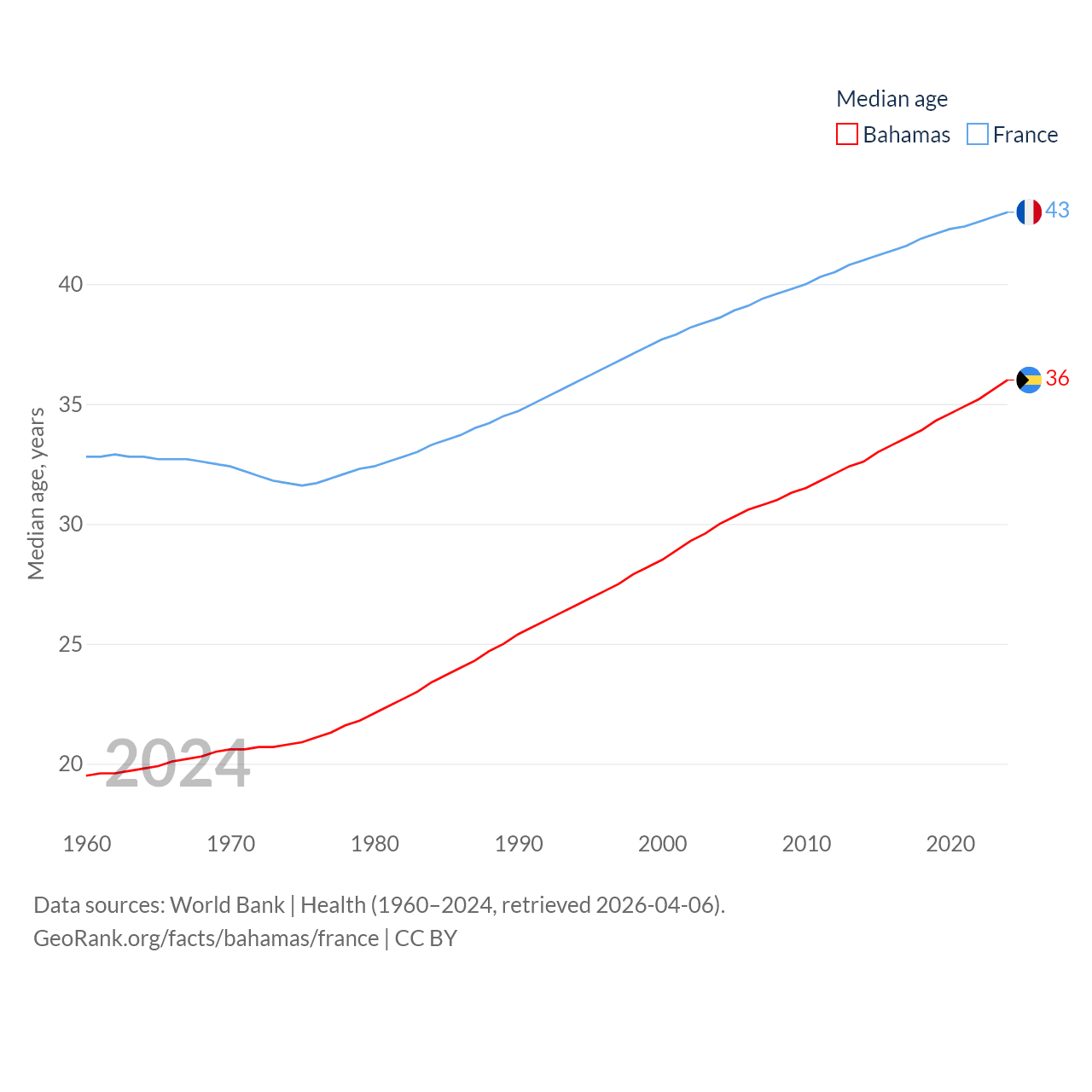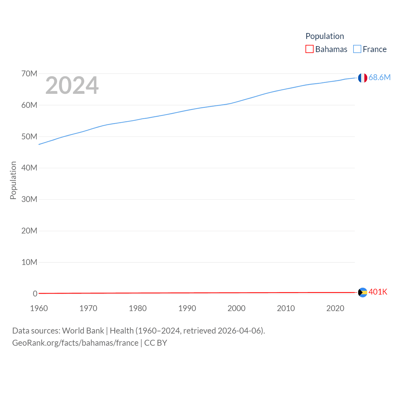 The Bahamas has a population of 401K (ranked 172/197), compared with 68.6M in France (ranked 23/197). The Bahamas' land area is 3,865 sq mi versus 208,090 sq mi for France (ranked 162nd vs. 48th).
