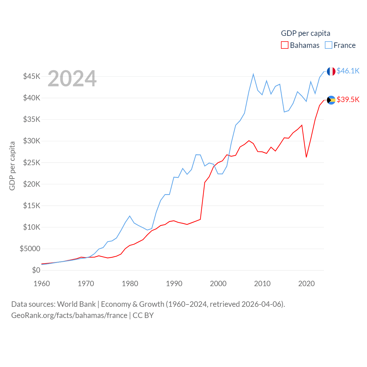 By GDP, The Bahamas ranks 140/197 ($15.8B) and France ranks 7/197 ($3.16T). By GDP per capita, The Bahamas ranks 30/197 ($39,455), while France ranks 27/197 ($46,103).