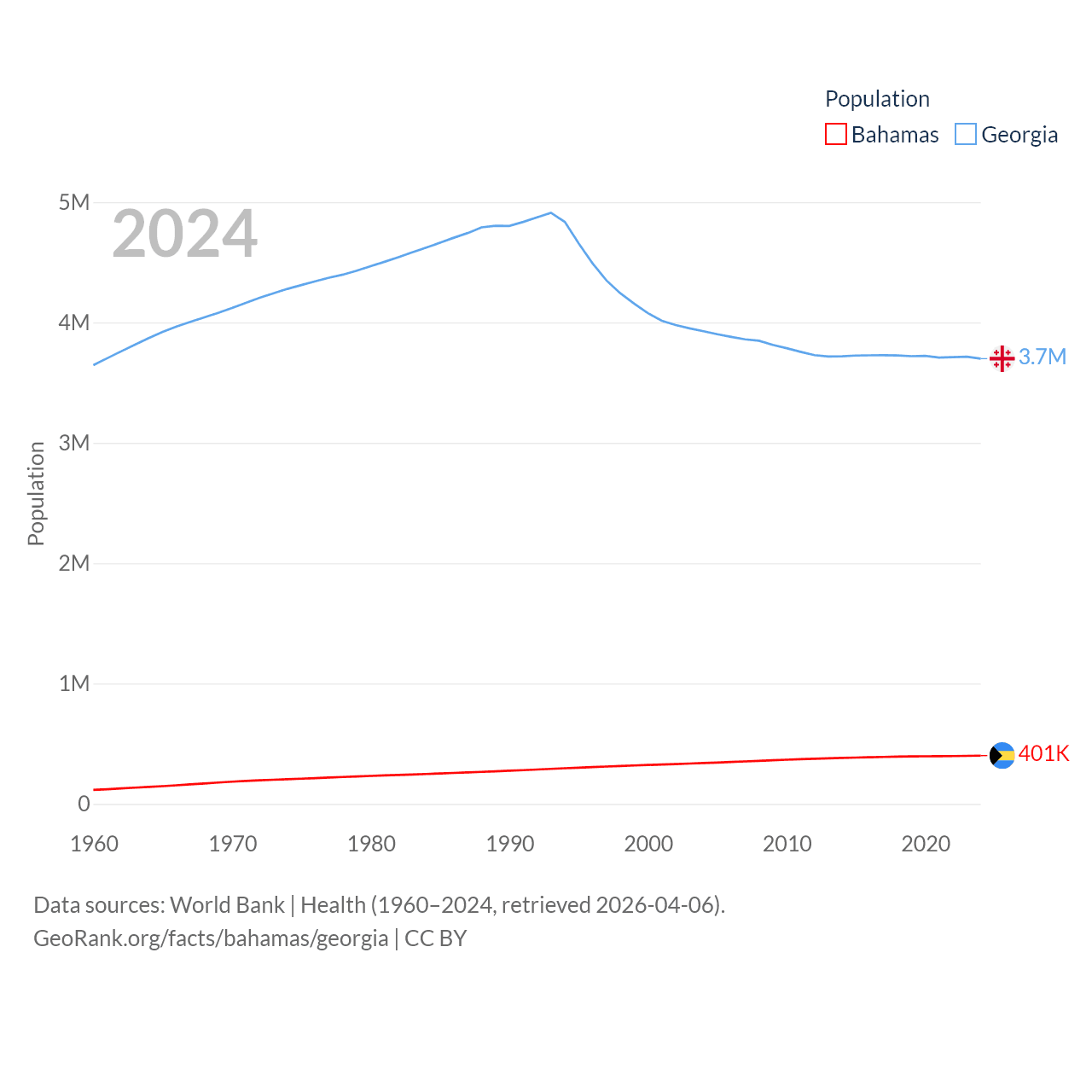 The Bahamas has a population of 401K (ranked 172/197), compared with 3.7M in Georgia (ranked 130/197). The Bahamas' land area is 3,865 sq mi versus 26,830 sq mi for Georgia (ranked 162nd vs. 118th).
