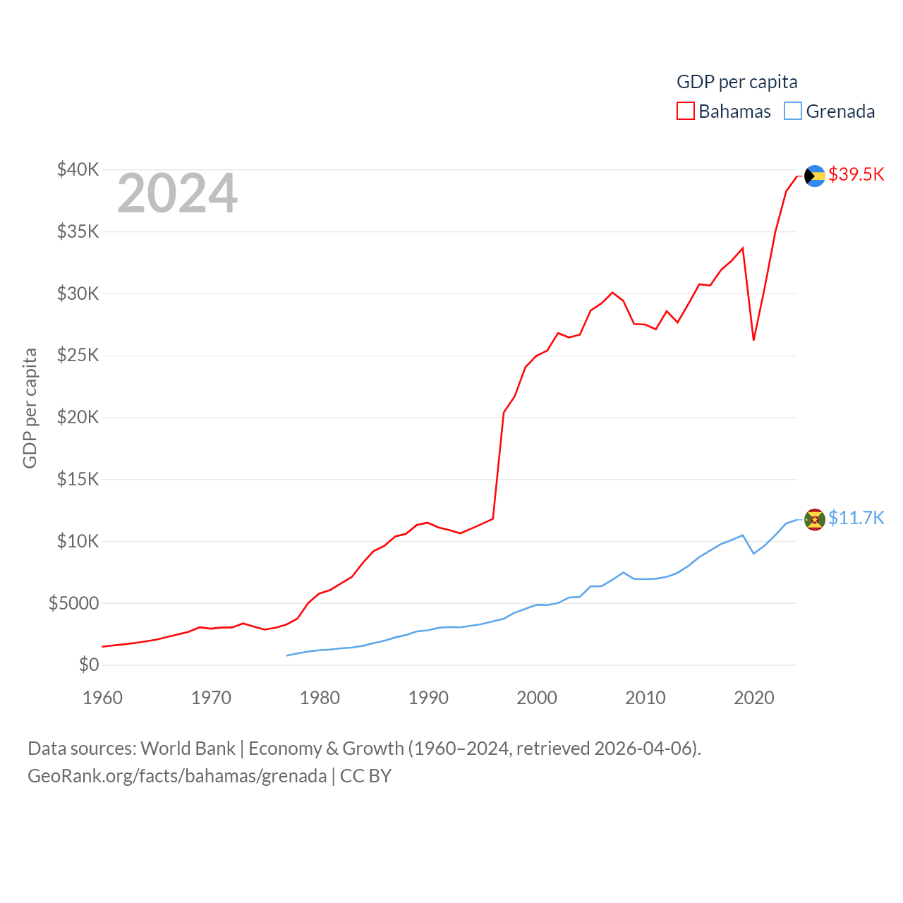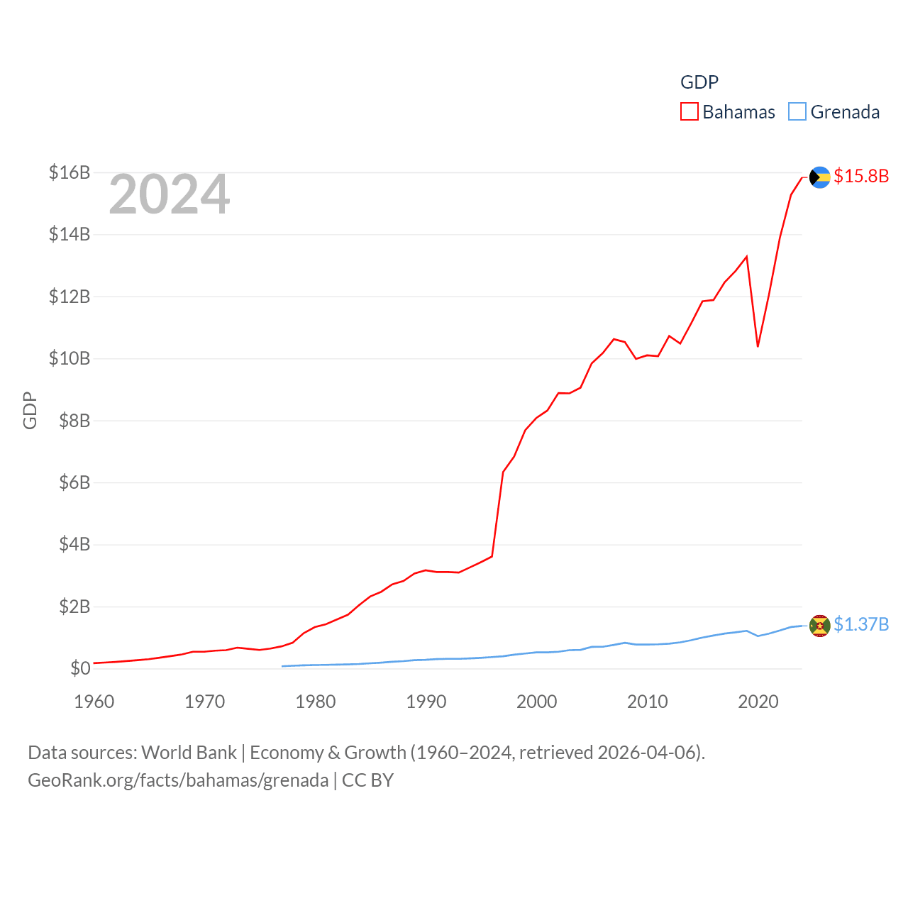 By GDP, The Bahamas ranks 140/197 ($15.8B) and Grenada ranks 184/197 ($1.37B). By GDP per capita, The Bahamas ranks 30/197 ($39,455), while Grenada ranks 80/197 ($11,705).