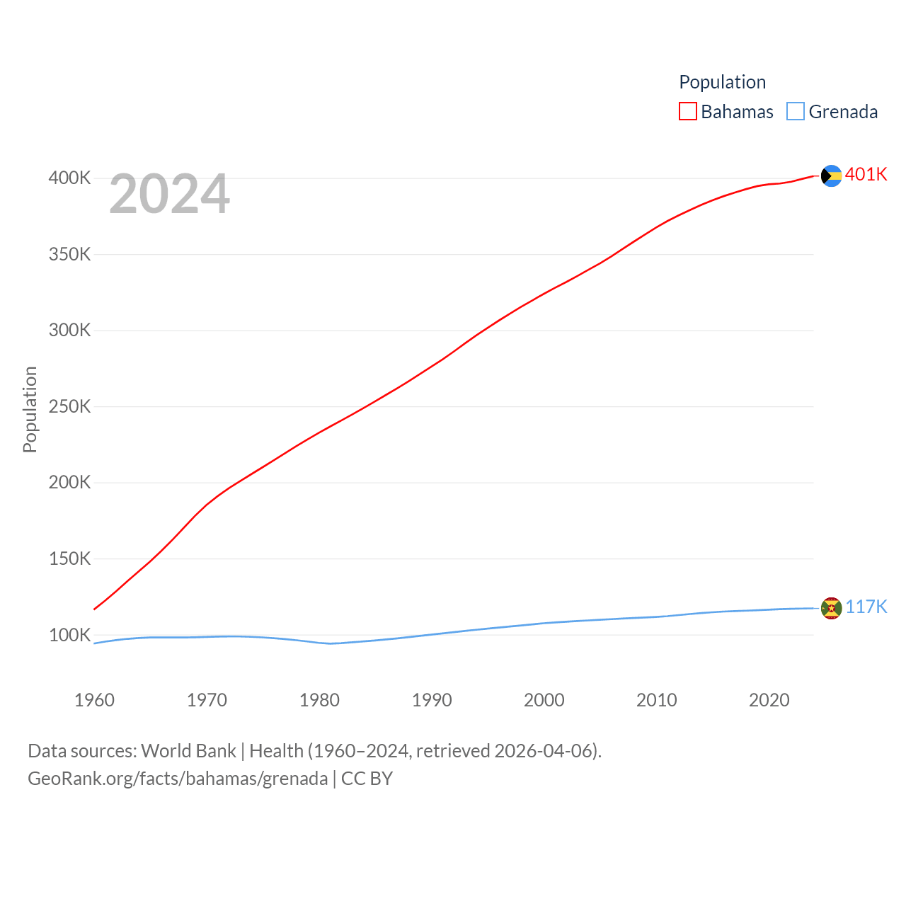 The Bahamas has a population of 401K (ranked 172/197), compared with 117K in Grenada (ranked 182/197). The Bahamas' land area is 3,865 sq mi versus 131.3 sq mi for Grenada (ranked 162nd vs. 186th).