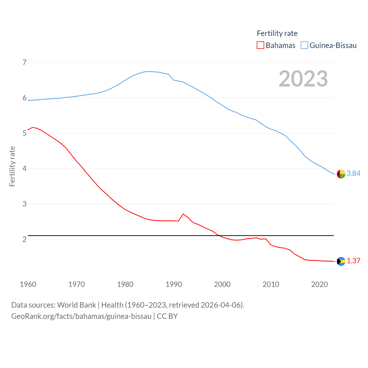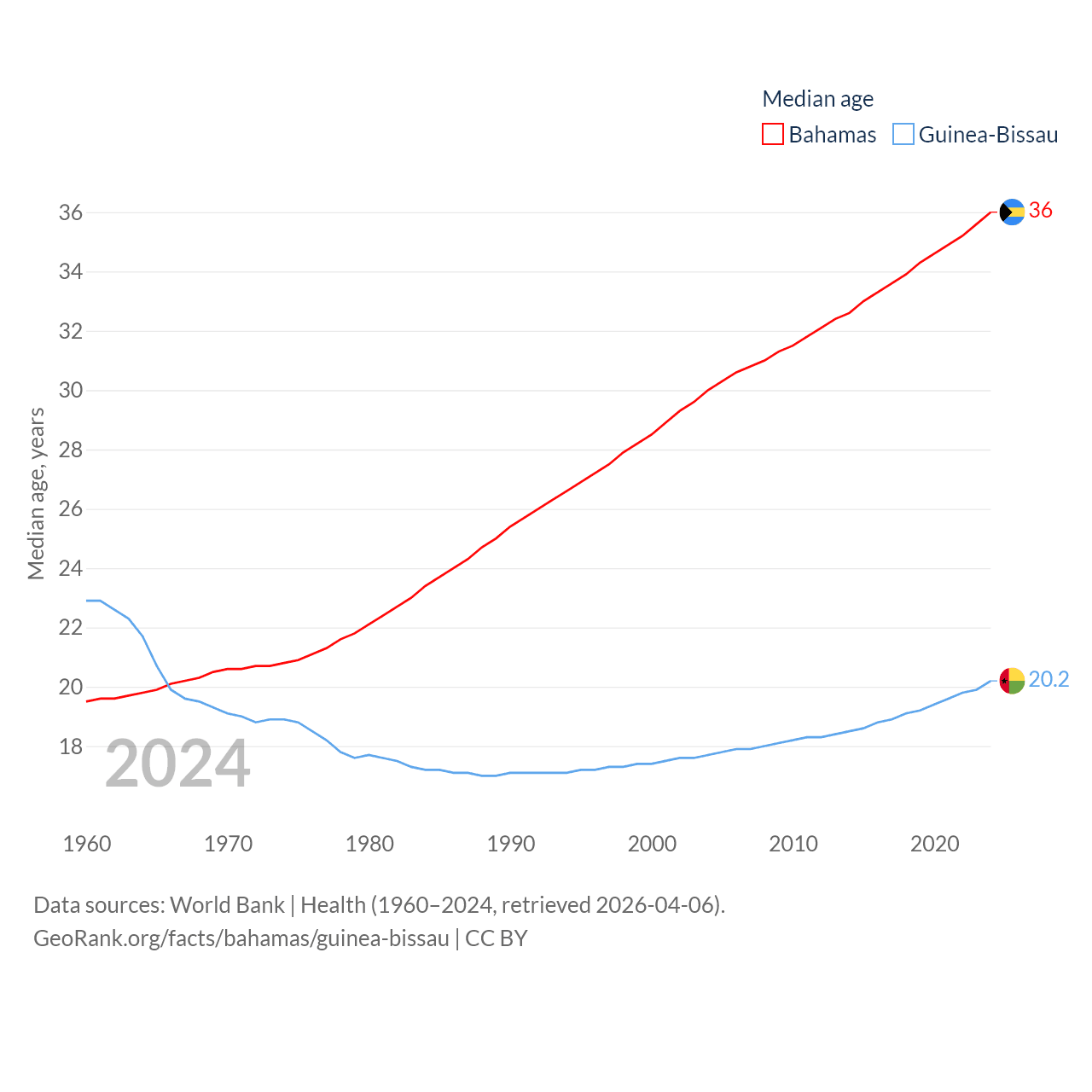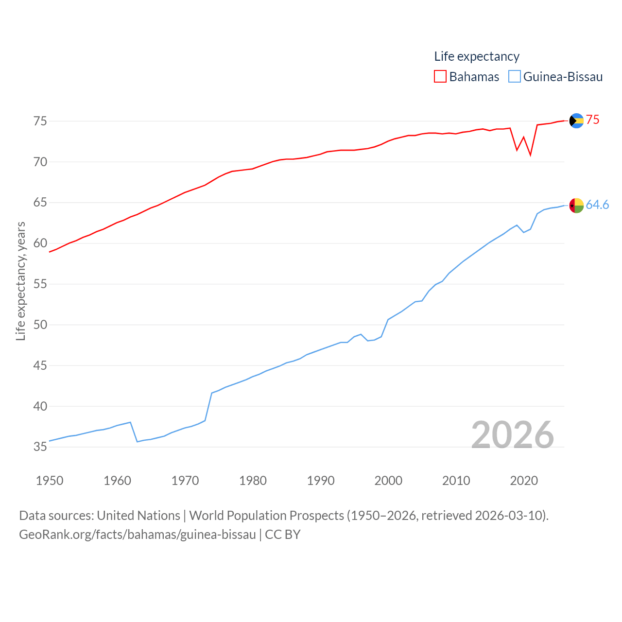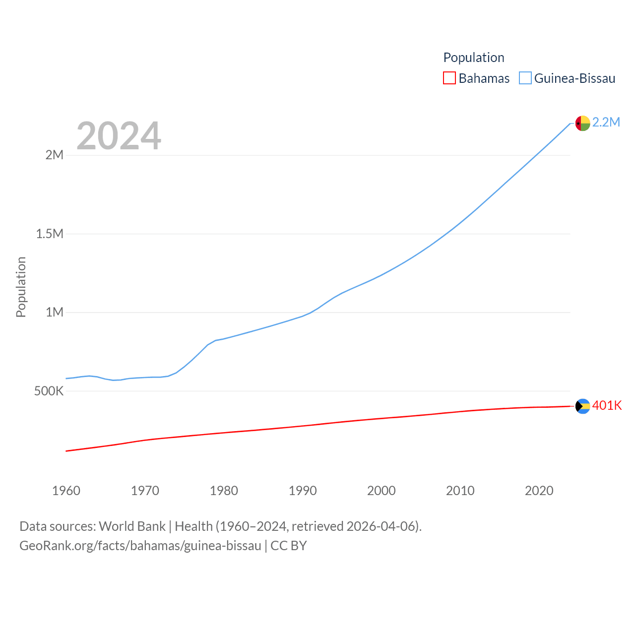 The Bahamas has a population of 401K (ranked 172/197), compared with 2.2M in Guinea-Bissau (ranked 146/197). The Bahamas' land area is 3,865 sq mi versus 10,857 sq mi for Guinea-Bissau (ranked 162nd vs. 139th).