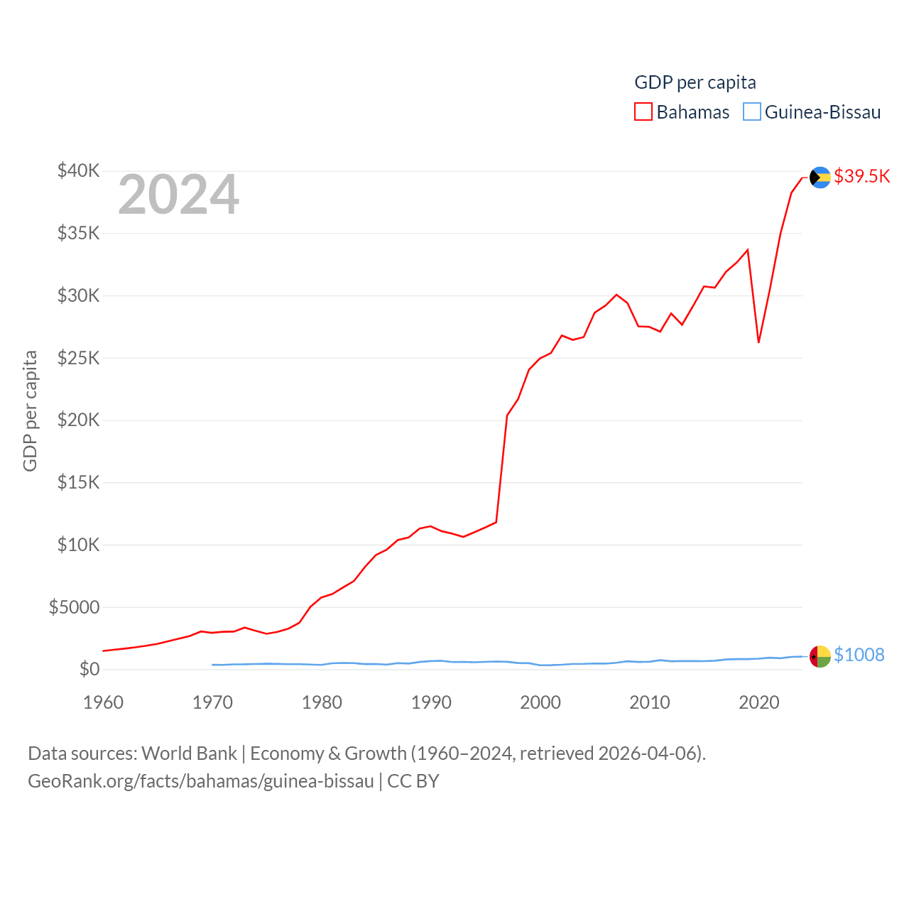 By GDP, The Bahamas ranks 140/197 ($15.8B) and Guinea-Bissau ranks 176/197 ($2.22B). By GDP per capita, The Bahamas ranks 30/197 ($39,455), while Guinea-Bissau ranks 177/197 ($1,008).