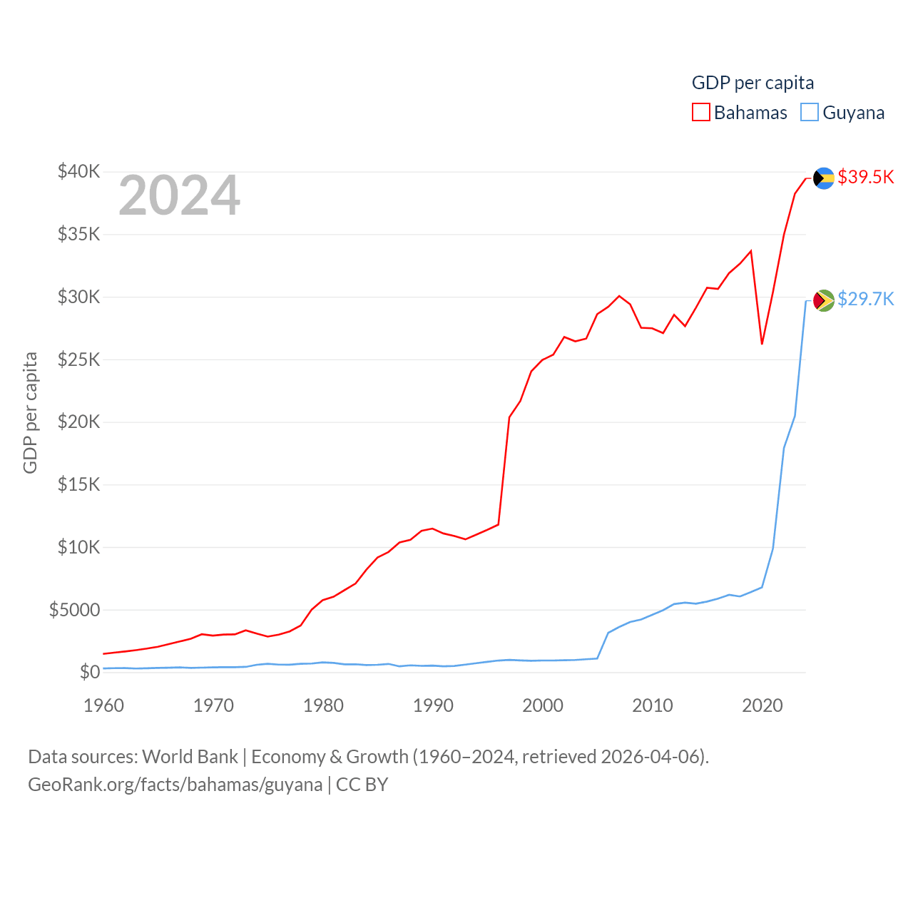 By GDP, The Bahamas ranks 140/197 ($15.8B) and Guyana ranks 120/197 ($24.7B). By GDP per capita, The Bahamas ranks 30/197 ($39,455), while Guyana ranks 41/197 ($29,675).
