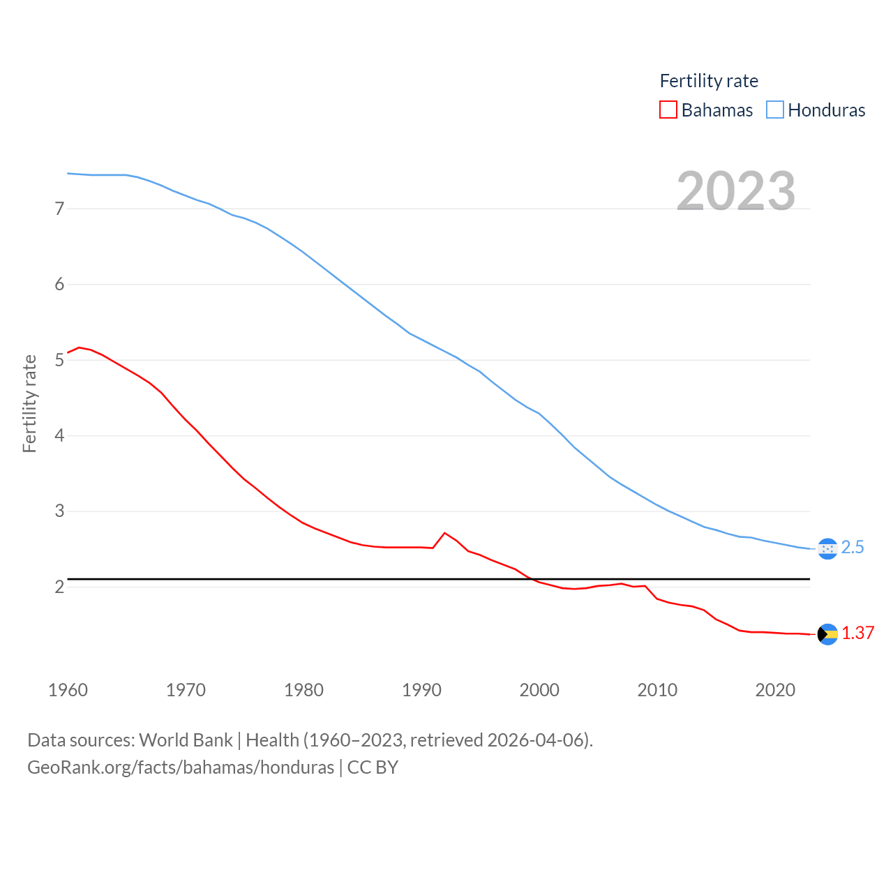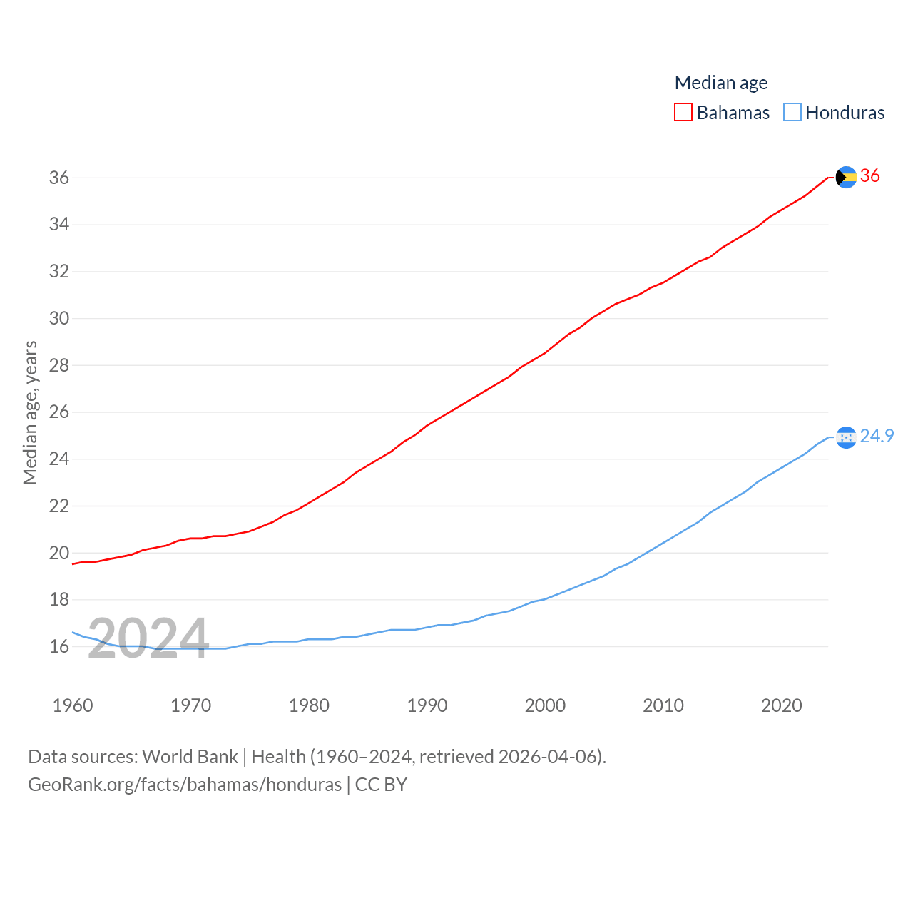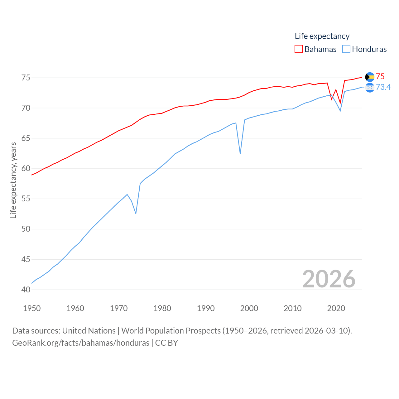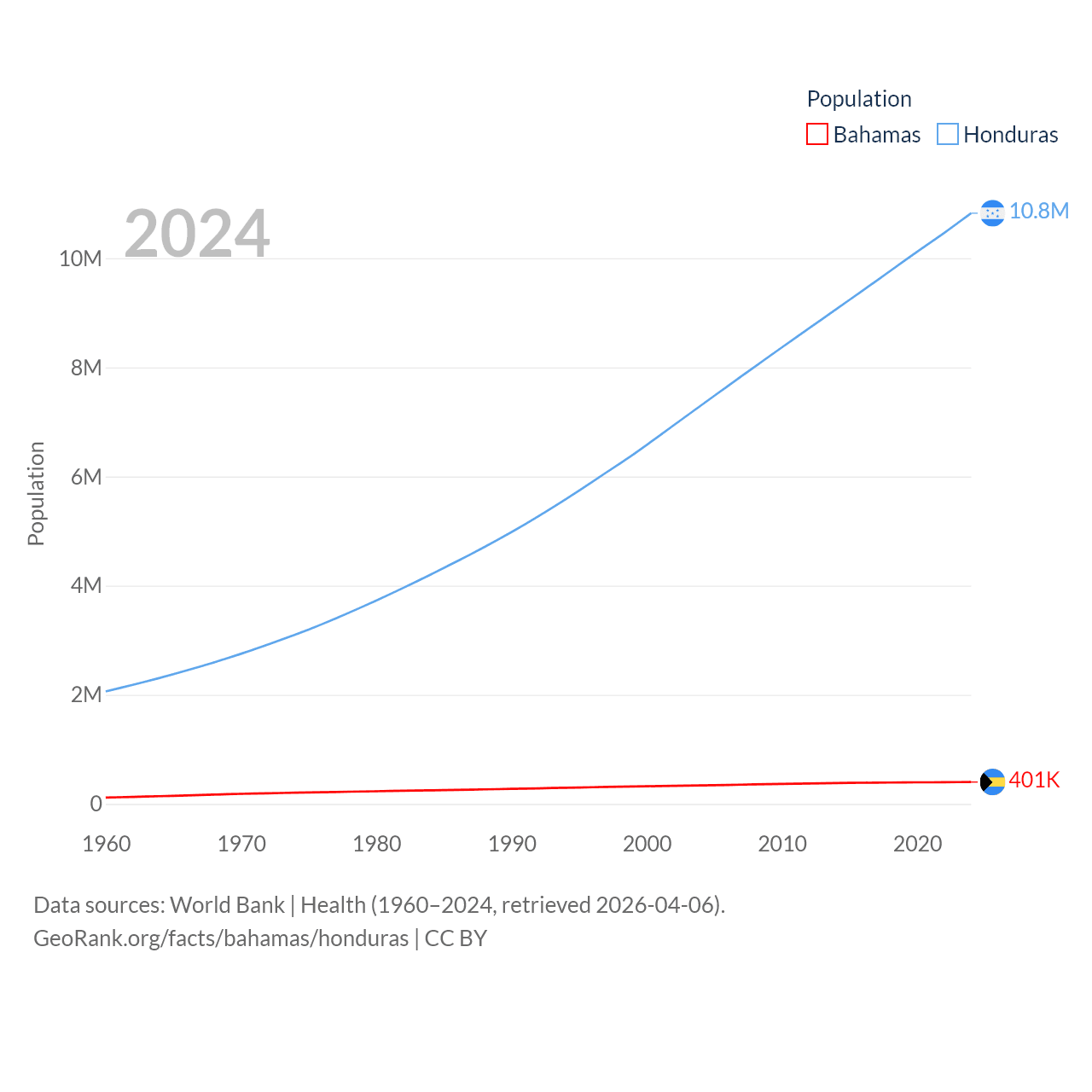 The Bahamas has a population of 401K (ranked 172/197), compared with 10.8M in Honduras (ranked 89/197). The Bahamas' land area is 3,865 sq mi versus 43,201 sq mi for Honduras (ranked 162nd vs. 100th).
