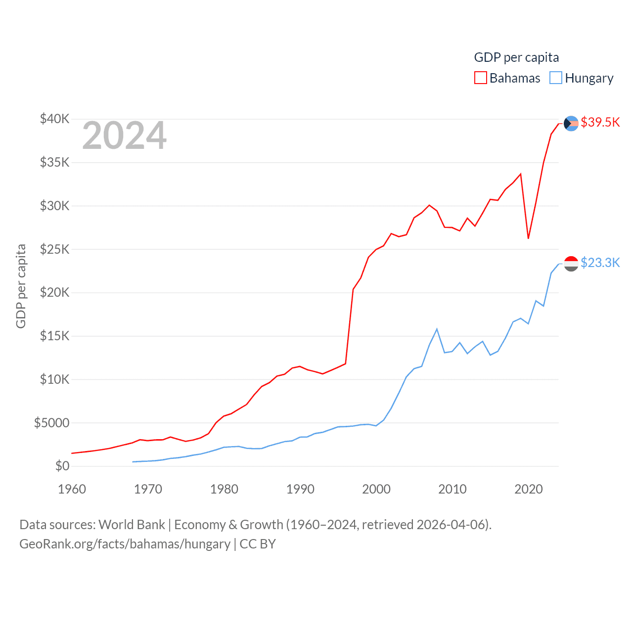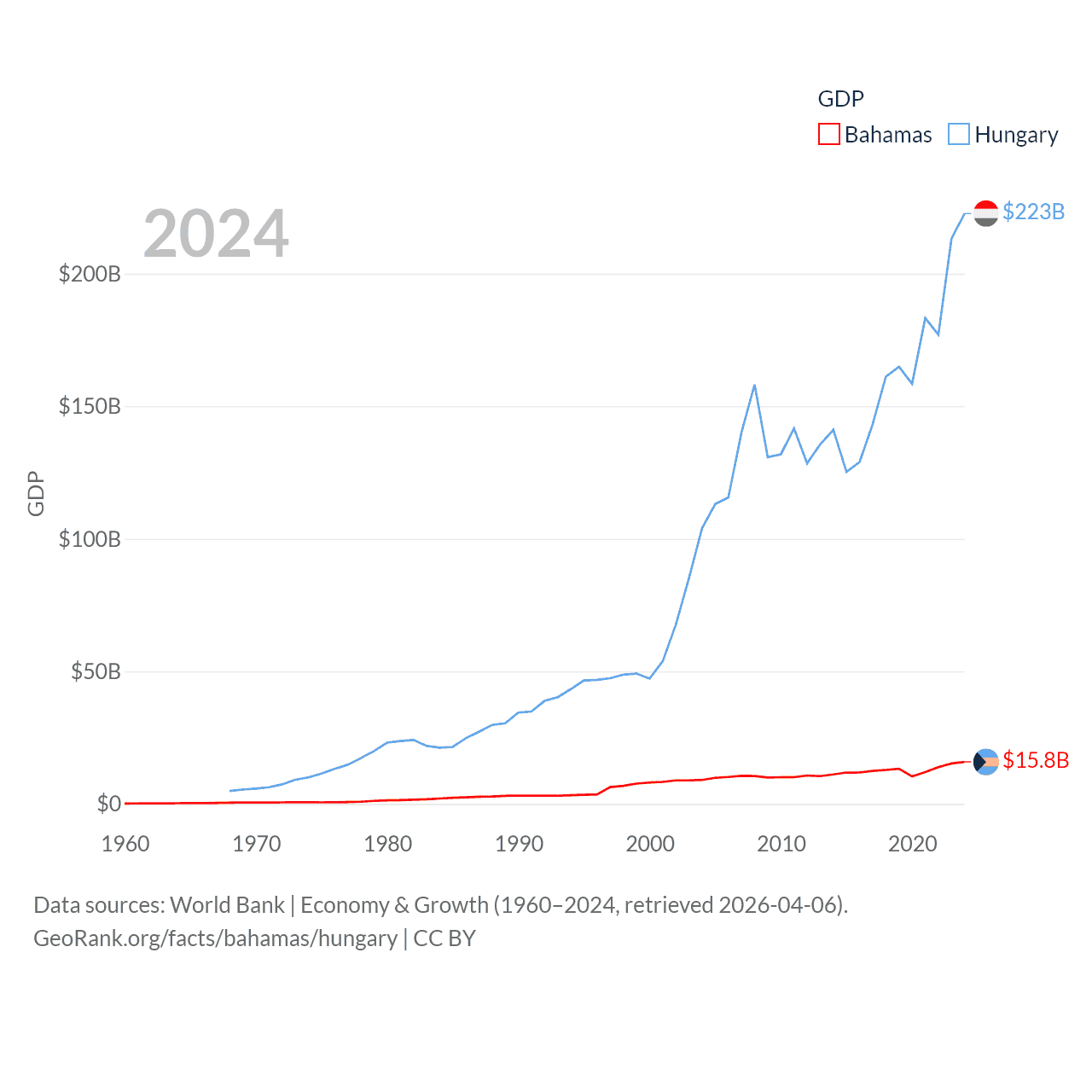 By GDP, The Bahamas ranks 140/197 ($15.8B) and Hungary ranks 55/197 ($223B). By GDP per capita, The Bahamas ranks 30/197 ($39,455), while Hungary ranks 55/197 ($23,292).