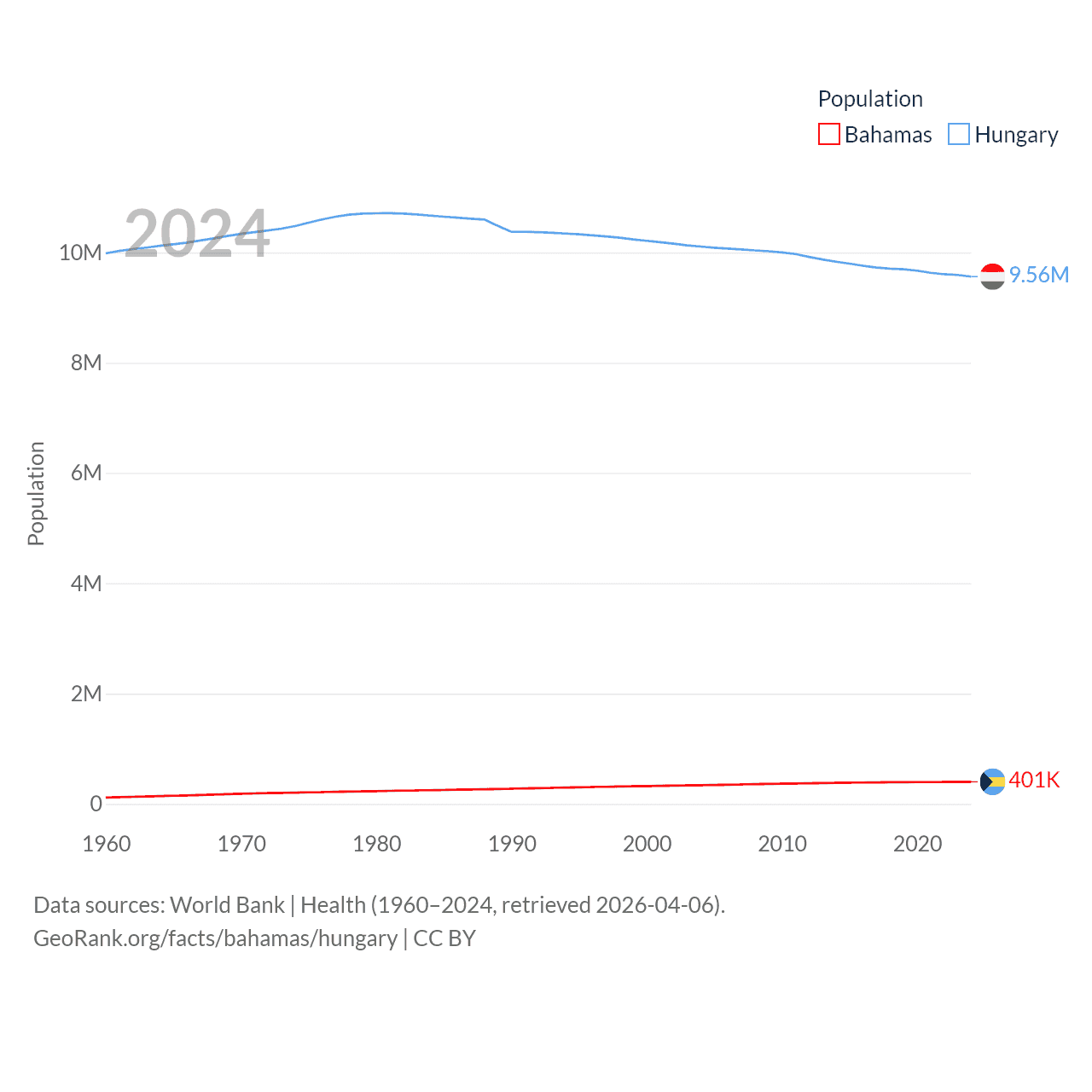 The Bahamas has a population of 401K (ranked 172/197), compared with 9.56M in Hungary (ranked 97/197). The Bahamas' land area is 3,865 sq mi versus 35,236 sq mi for Hungary (ranked 162nd vs. 109th).