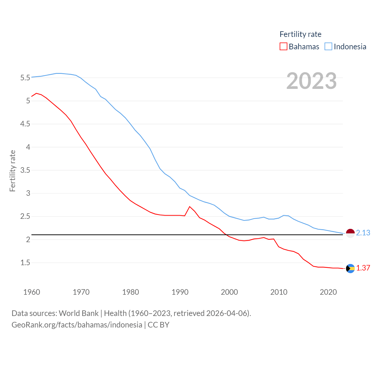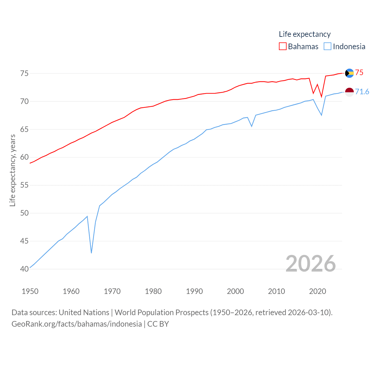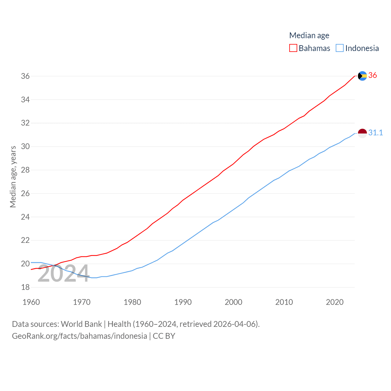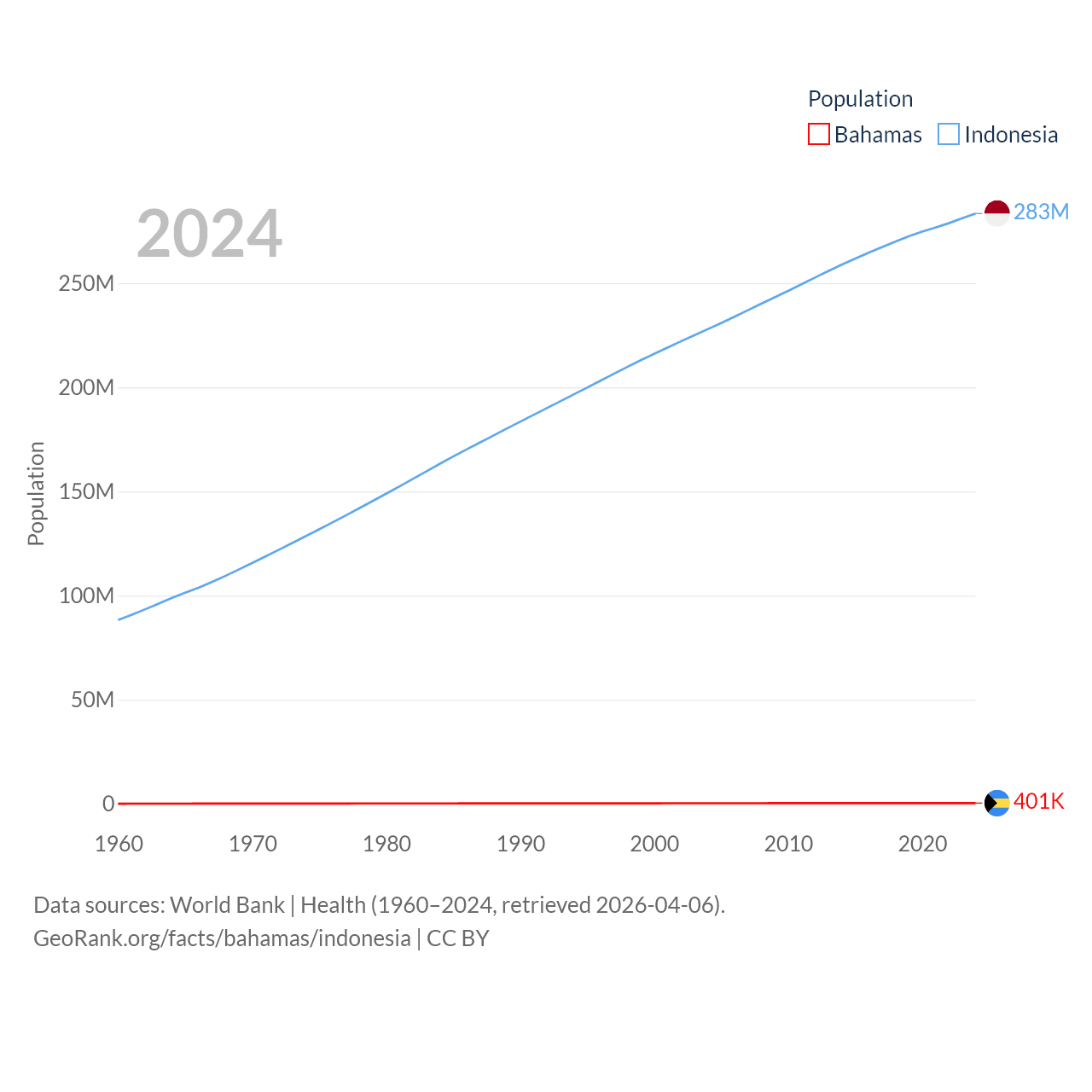 The Bahamas has a population of 401K (ranked 172/197), compared with 283M in Indonesia (ranked 4/197). The Bahamas' land area is 3,865 sq mi versus 730,720 sq mi for Indonesia (ranked 162nd vs. 14th).