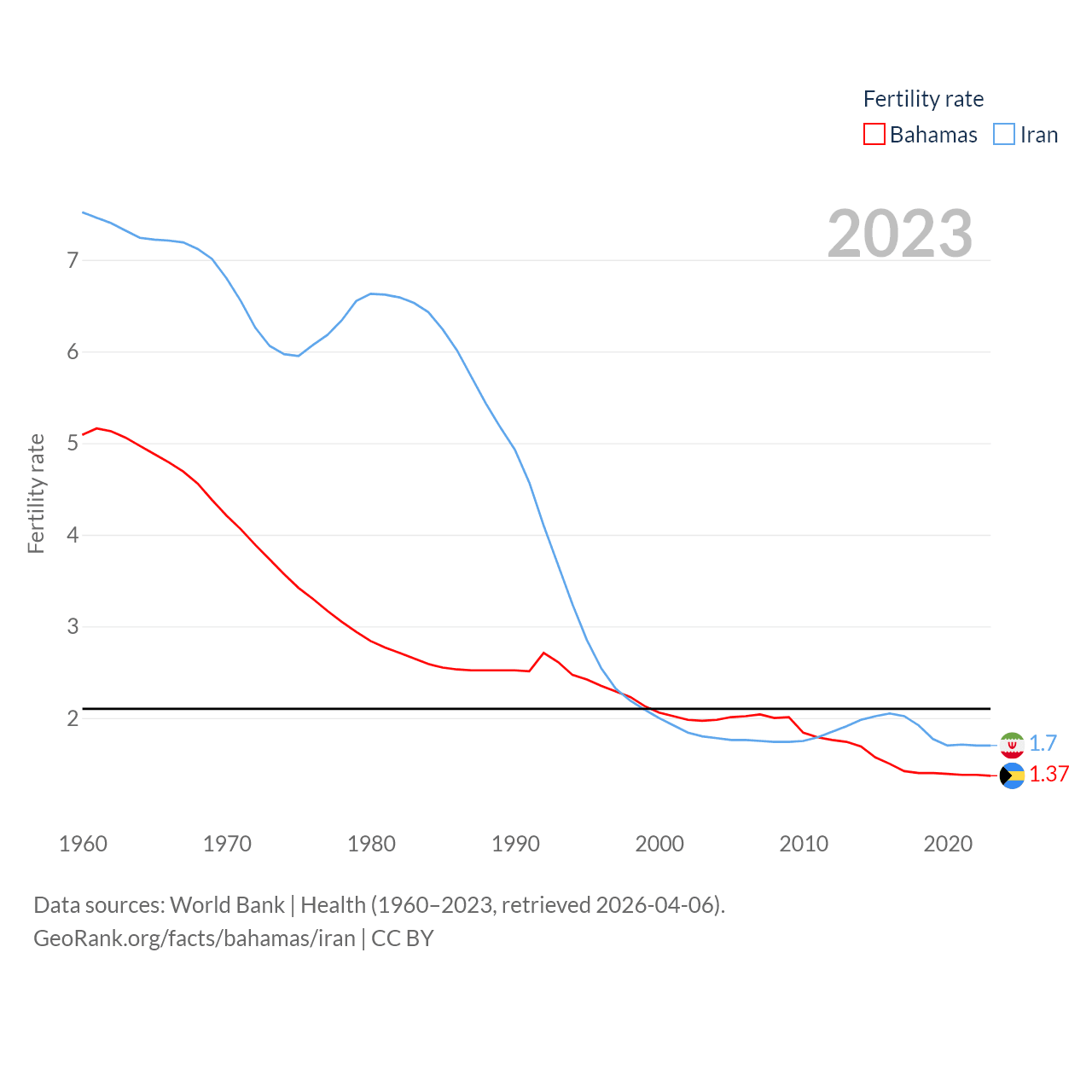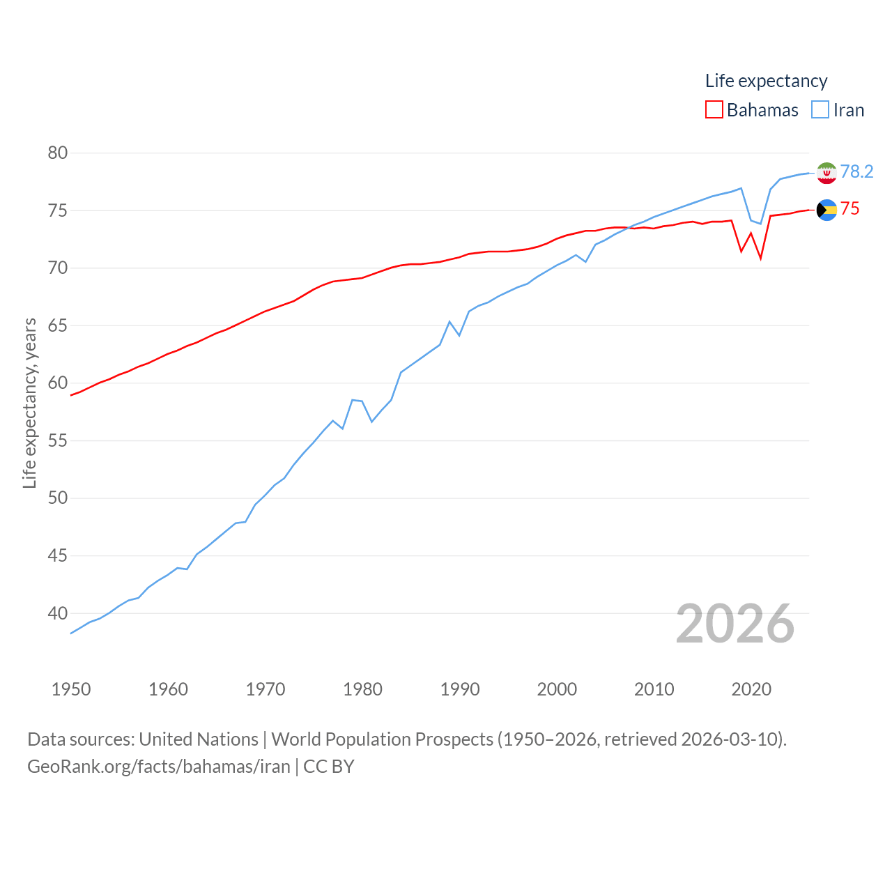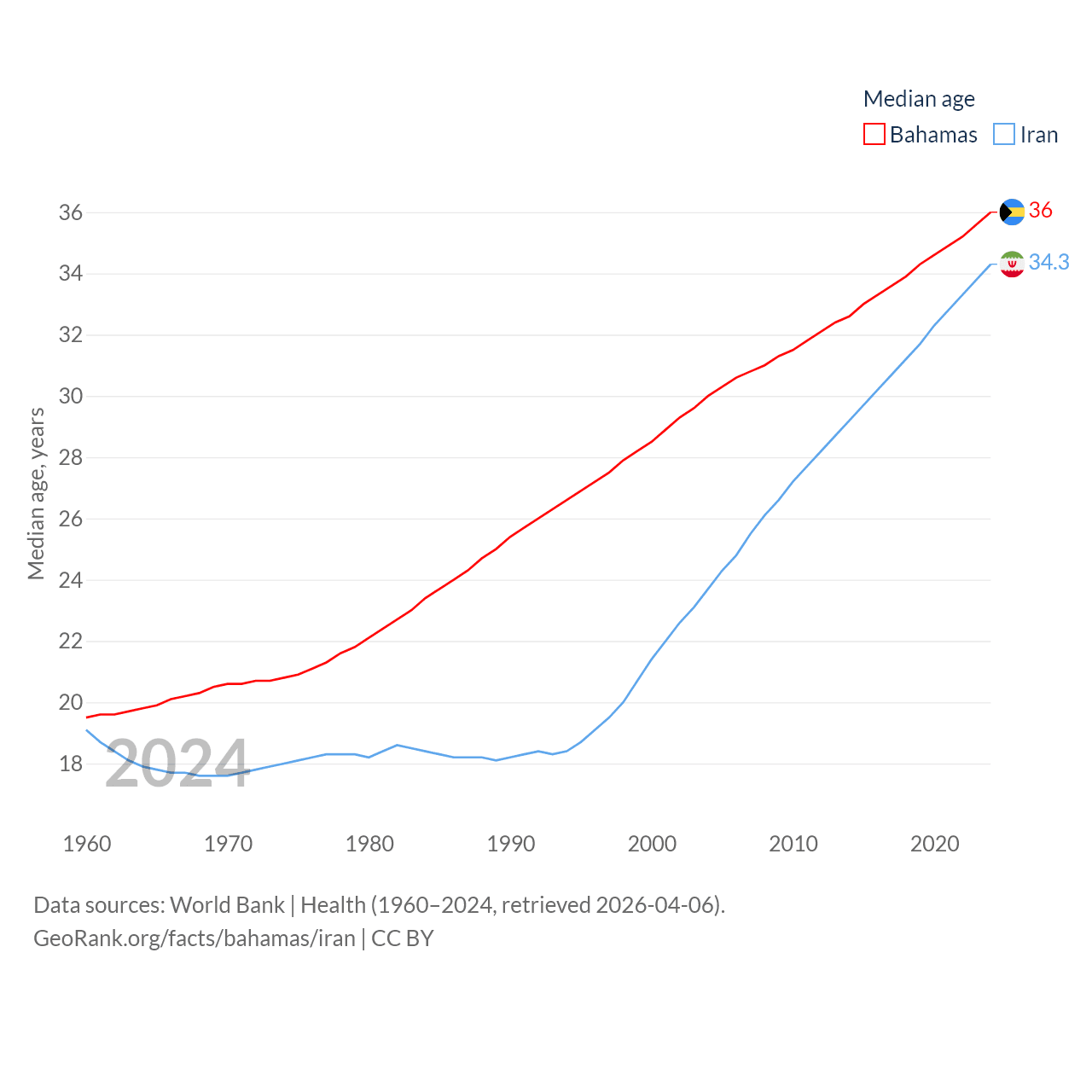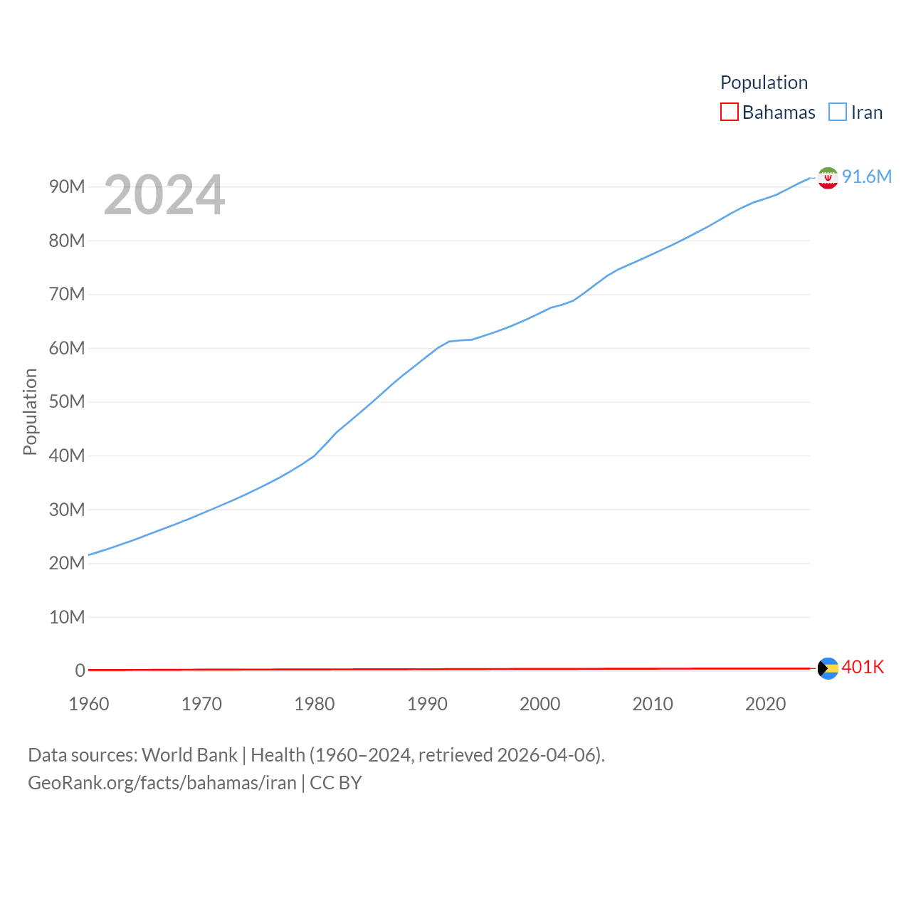 The Bahamas has a population of 401K (ranked 172/197), compared with 91.6M in Iran (ranked 17/197). The Bahamas' land area is 3,865 sq mi versus 626,451 sq mi for Iran (ranked 162nd vs. 17th).