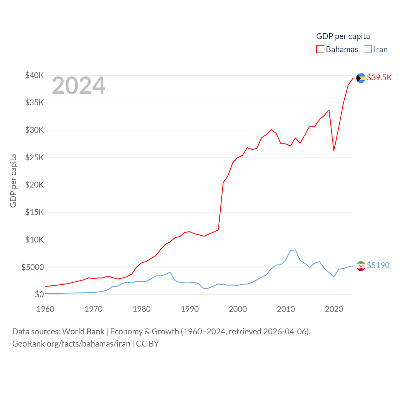 By GDP, The Bahamas ranks 140/197 ($15.8B) and Iran ranks 34/197 ($475B). By GDP per capita, The Bahamas ranks 30/197 ($39,455), while Iran ranks 119/197 ($5,190).
