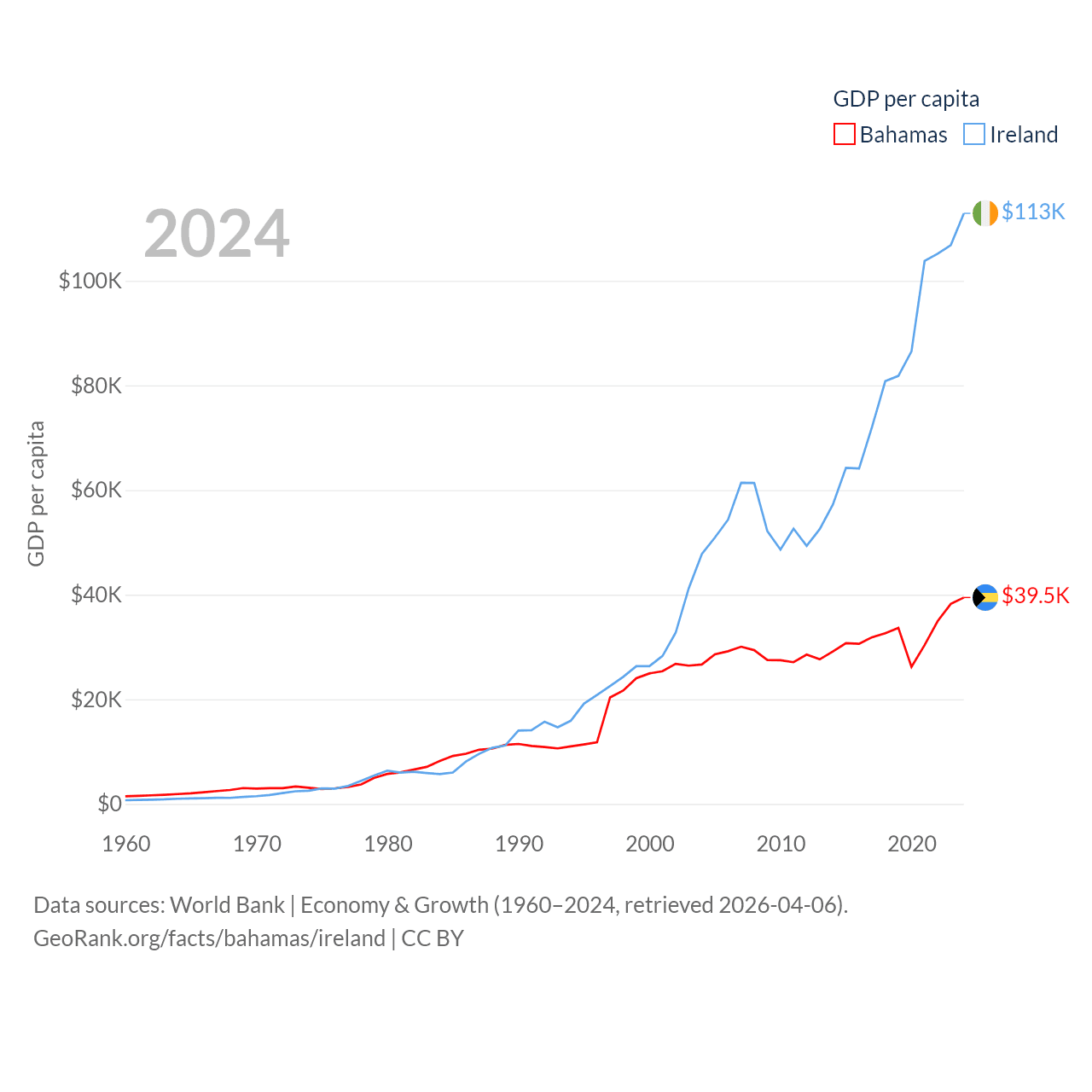 By GDP, The Bahamas ranks 140/197 ($15.8B) and Ireland ranks 25/197 ($609B). By GDP per capita, The Bahamas ranks 30/197 ($39,455), while Ireland ranks 4/197 ($112,895).