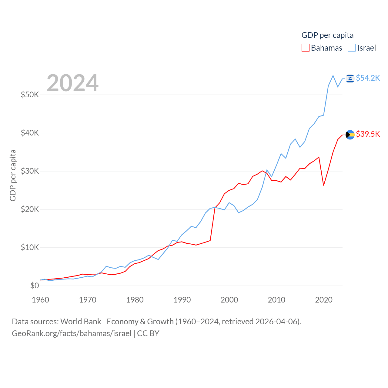 By GDP, The Bahamas ranks 140/197 ($15.8B) and Israel ranks 29/197 ($540B). By GDP per capita, The Bahamas ranks 30/197 ($39,455), while Israel ranks 21/197 ($54,177).