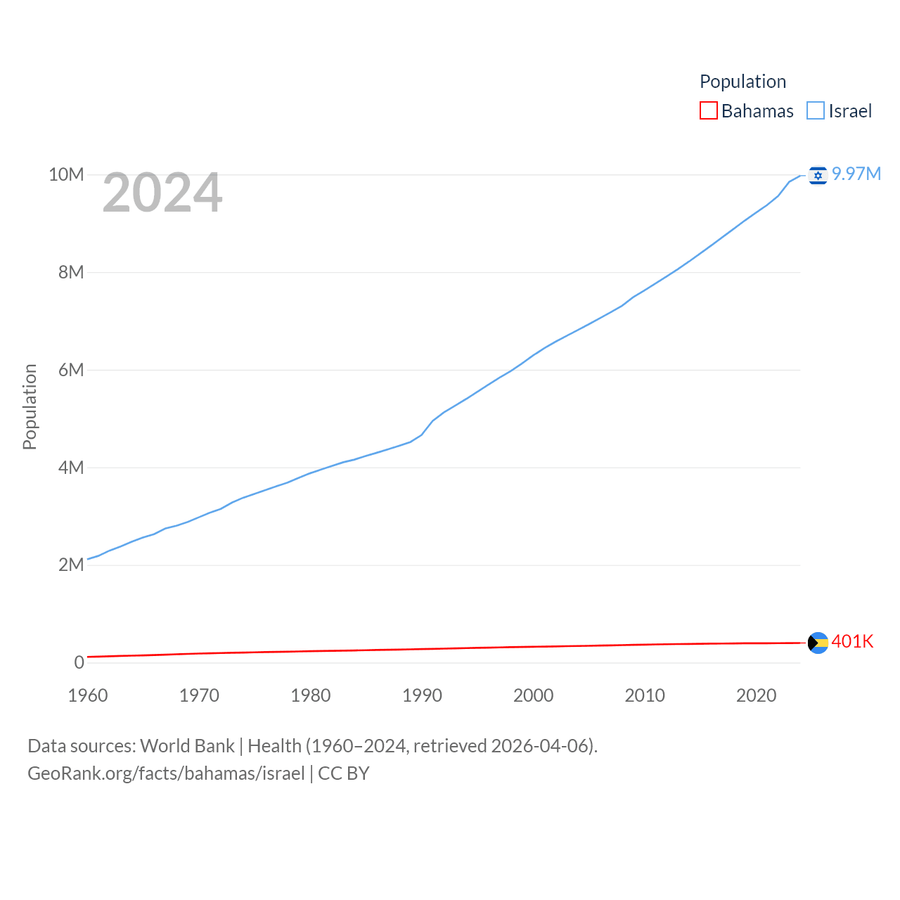 The Bahamas has a population of 401K (ranked 172/197), compared with 9.97M in Israel (ranked 96/197). The Bahamas' land area is 3,865 sq mi versus 8,355 sq mi for Israel (ranked 162nd vs. 149th).