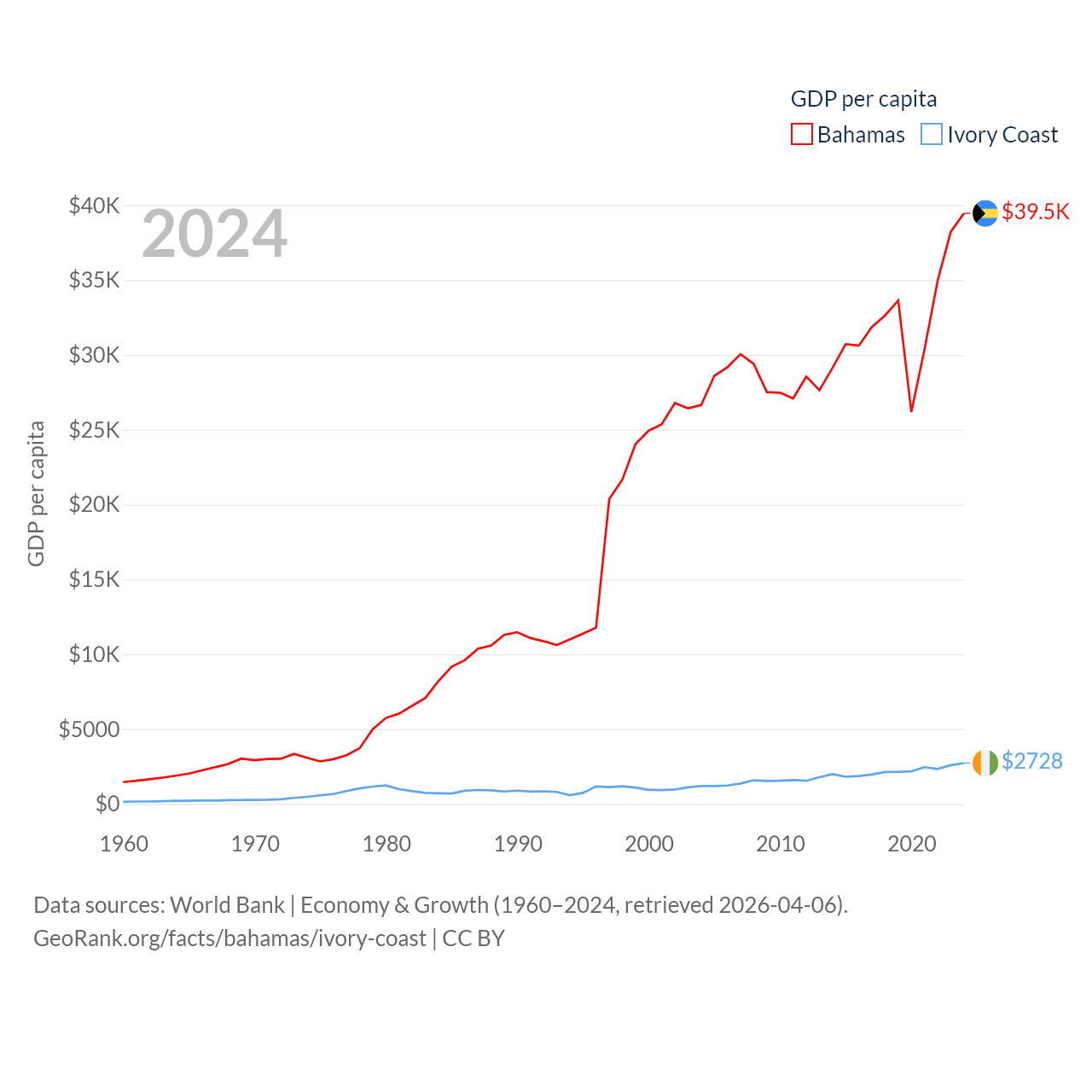 By GDP, The Bahamas ranks 140/197 ($15.8B) and Ivory Coast ranks 77/197 ($87.1B). By GDP per capita, The Bahamas ranks 30/197 ($39,455), while Ivory Coast ranks 142/197 ($2,728).