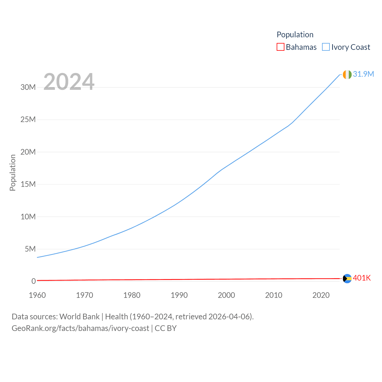 The Bahamas has a population of 401K (ranked 172/197), compared with 31.9M in Ivory Coast (ranked 50/197). The Bahamas' land area is 3,865 sq mi versus 122,780 sq mi for Ivory Coast (ranked 162nd vs. 66th).