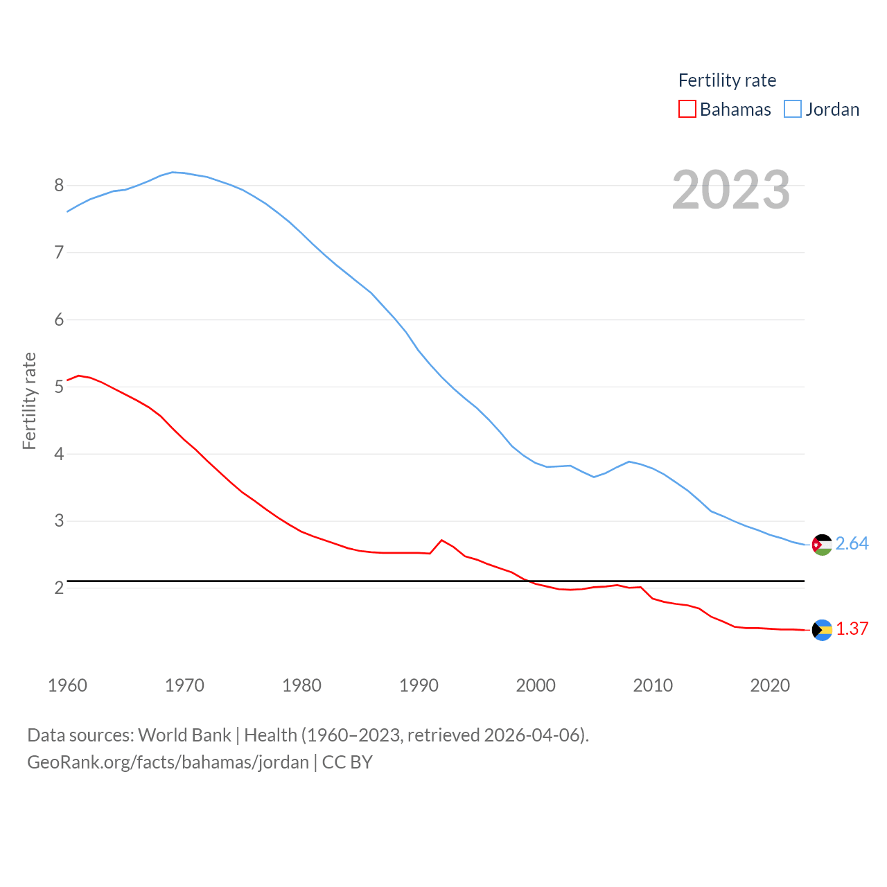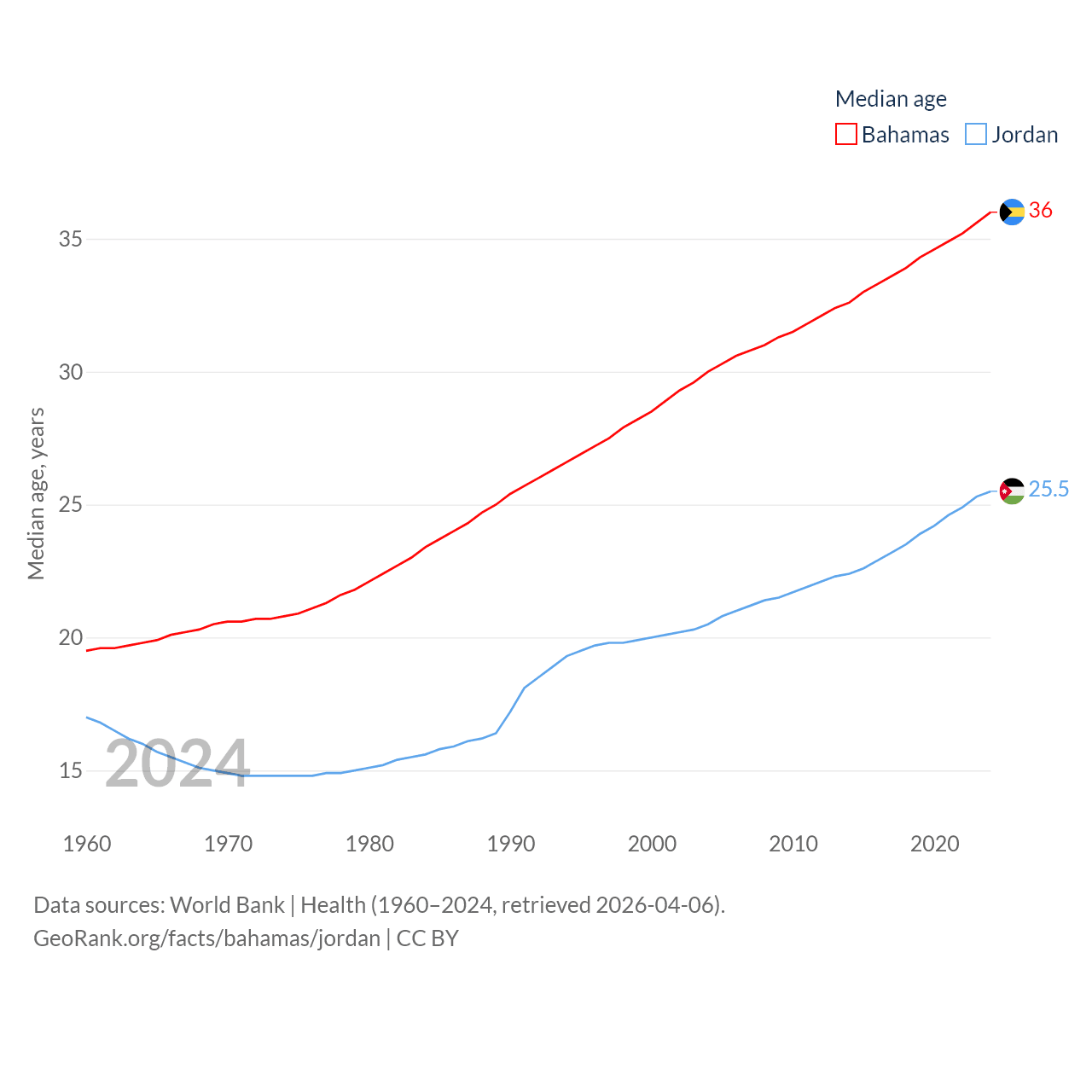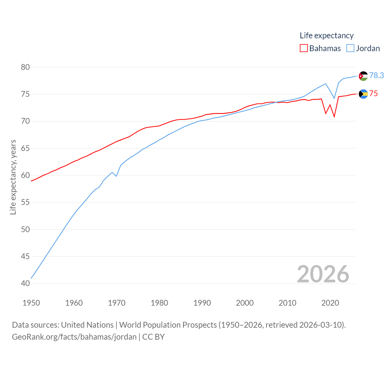 The Bahamas has a population of 401K (ranked 172/197), compared with 11.6M in Jordan (ranked 84/197). The Bahamas' land area is 3,865 sq mi versus 34,284 sq mi for Jordan (ranked 162nd vs. 110th).
