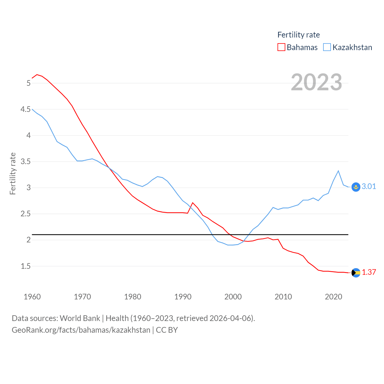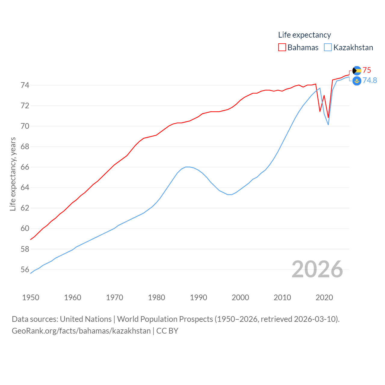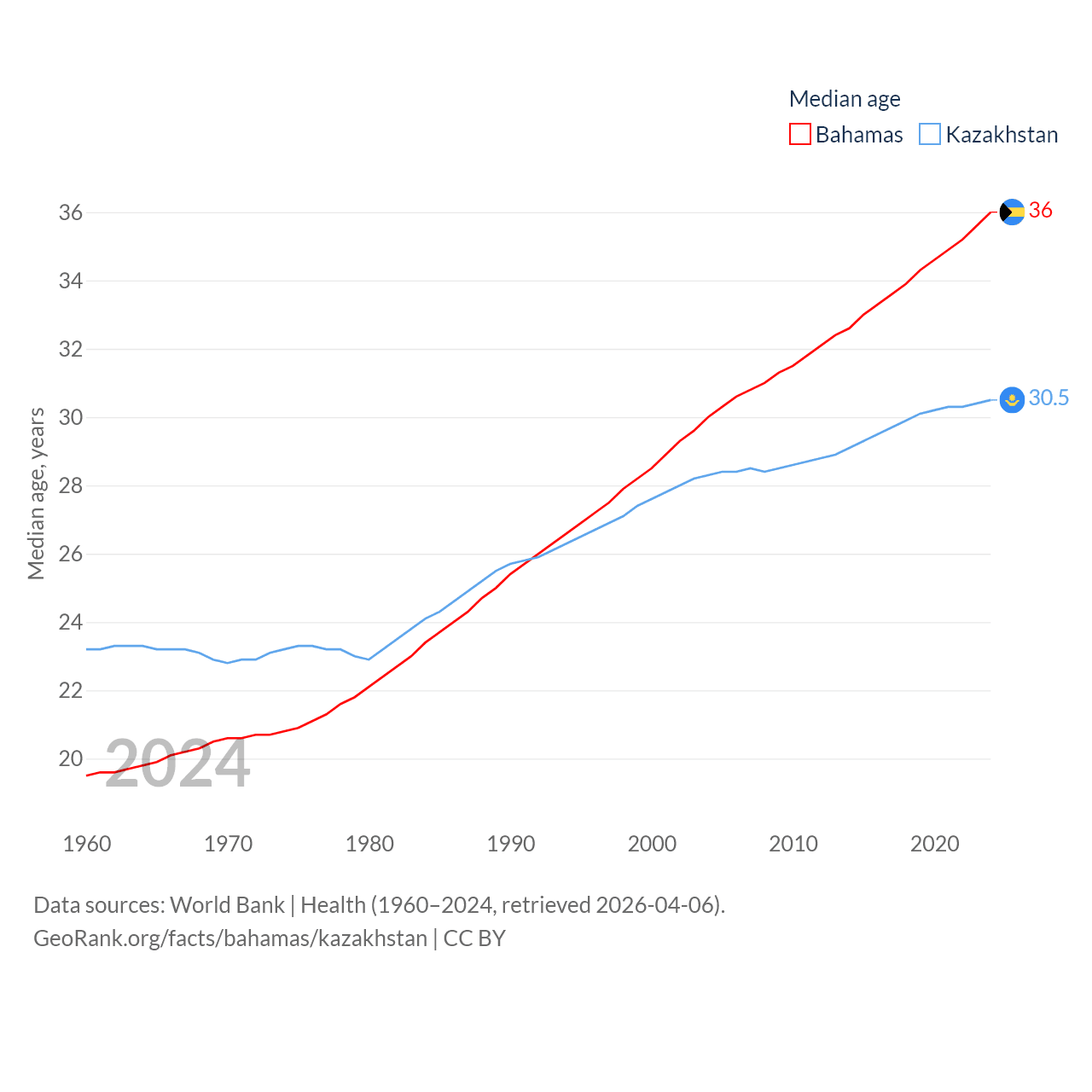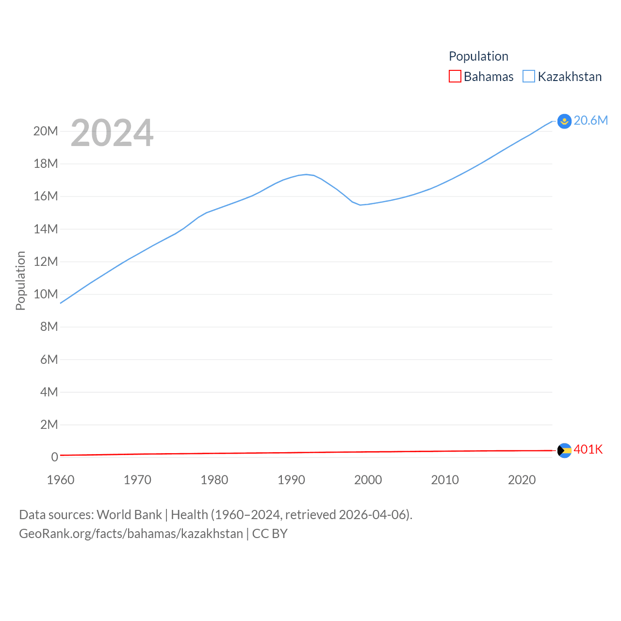 The Bahamas has a population of 401K (ranked 172/197), compared with 20.6M in Kazakhstan (ranked 64/197). The Bahamas' land area is 3,865 sq mi versus 1,042,360 sq mi for Kazakhstan (ranked 162nd vs. 9th).