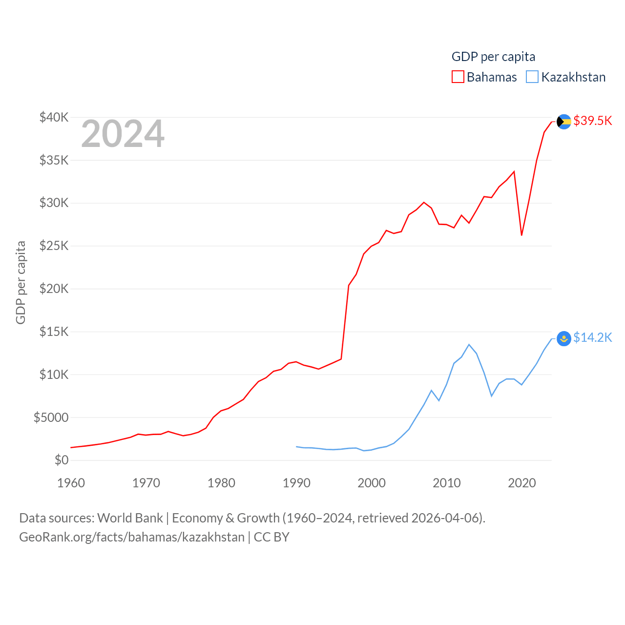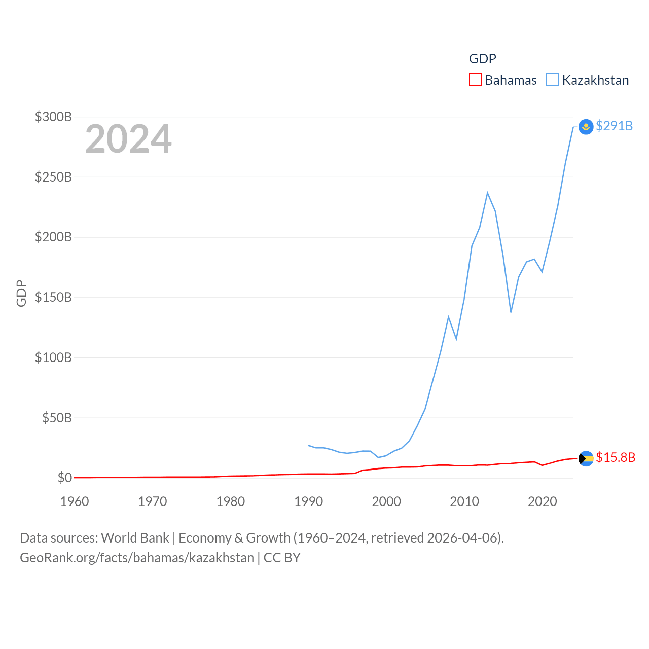 By GDP, The Bahamas ranks 140/197 ($15.8B) and Kazakhstan ranks 48/197 ($291B). By GDP per capita, The Bahamas ranks 30/197 ($39,455), while Kazakhstan ranks 71/197 ($14,155).