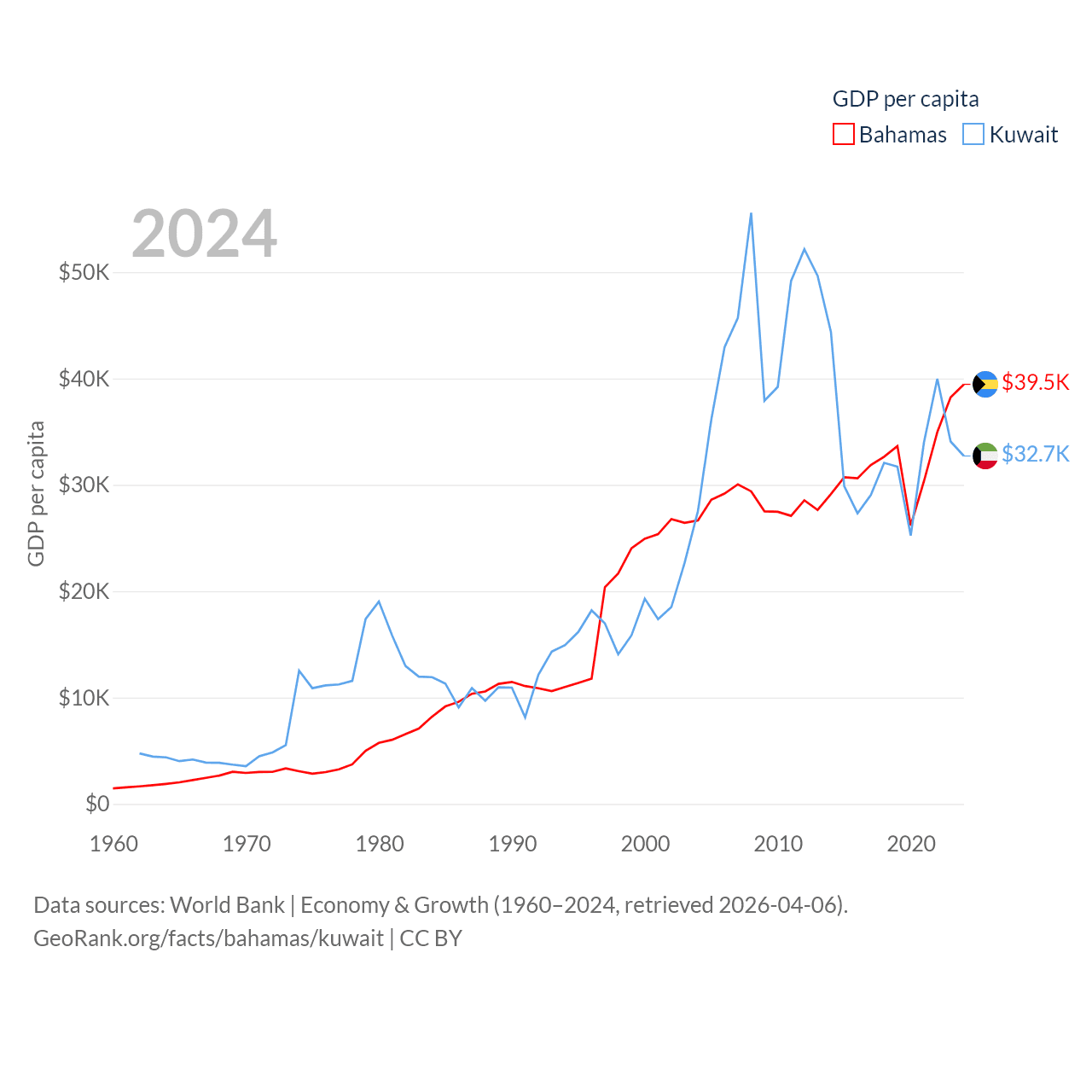 By GDP, The Bahamas ranks 140/197 ($15.8B) and Kuwait ranks 59/197 ($160B). By GDP per capita, The Bahamas ranks 30/197 ($39,455), while Kuwait ranks 37/197 ($32,718).