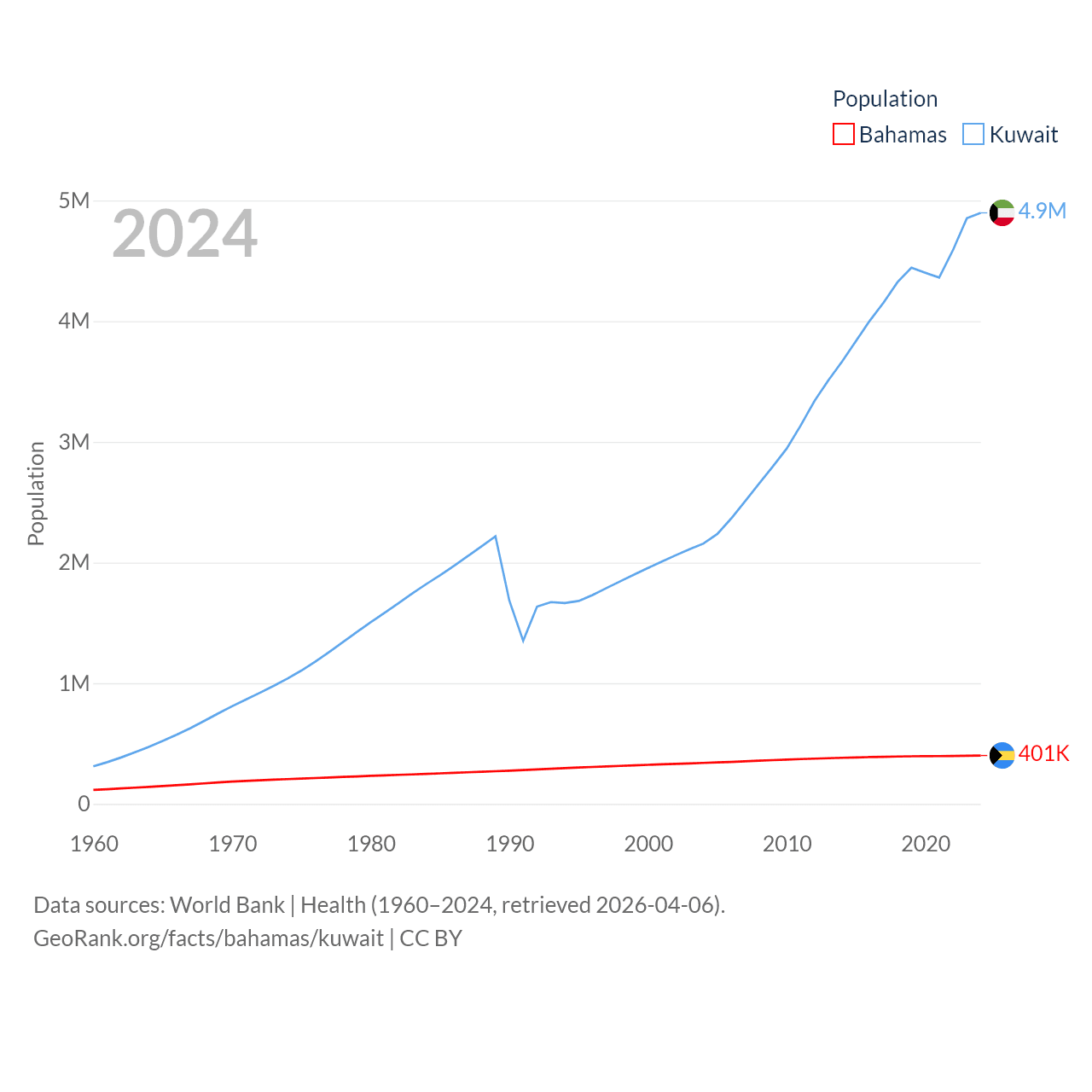 The Bahamas has a population of 401K (ranked 172/197), compared with 4.9M in Kuwait (ranked 127/197). The Bahamas' land area is 3,865 sq mi versus 6,880 sq mi for Kuwait (ranked 162nd vs. 153rd).