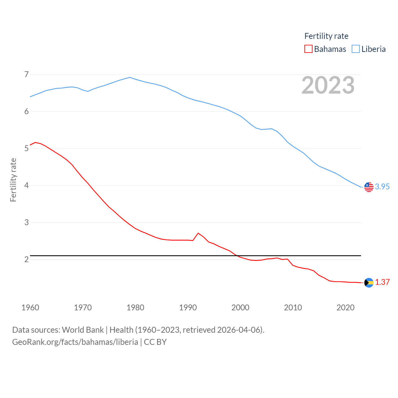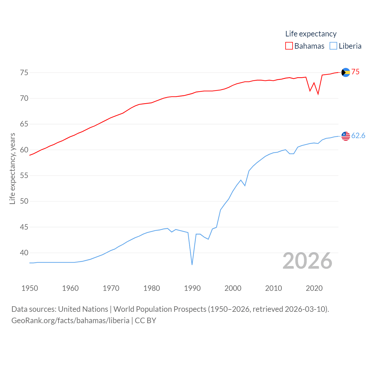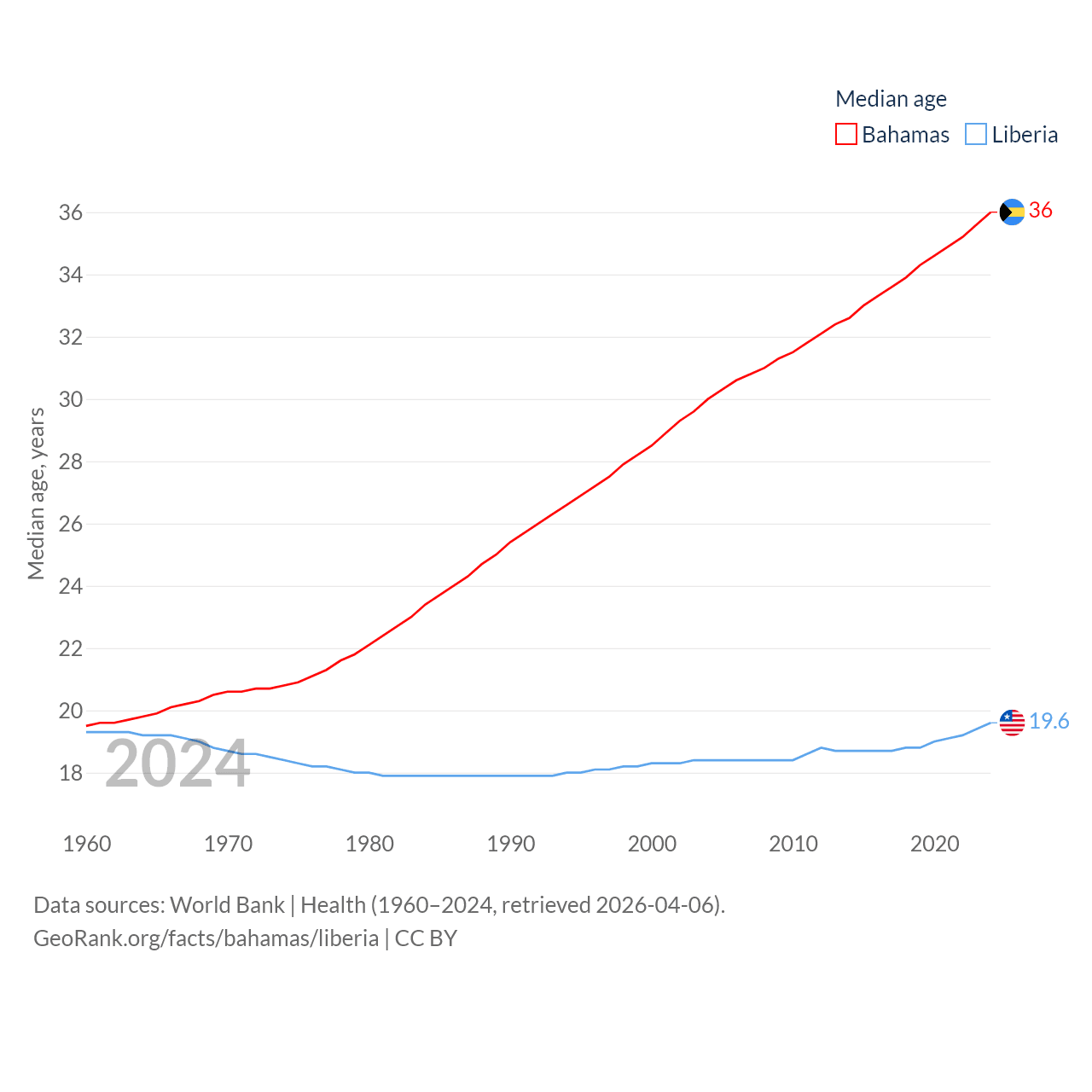 The Bahamas has a population of 401K (ranked 172/197), compared with 5.61M in Liberia (ranked 117/197). The Bahamas' land area is 3,865 sq mi versus 37,189 sq mi for Liberia (ranked 162nd vs. 106th).