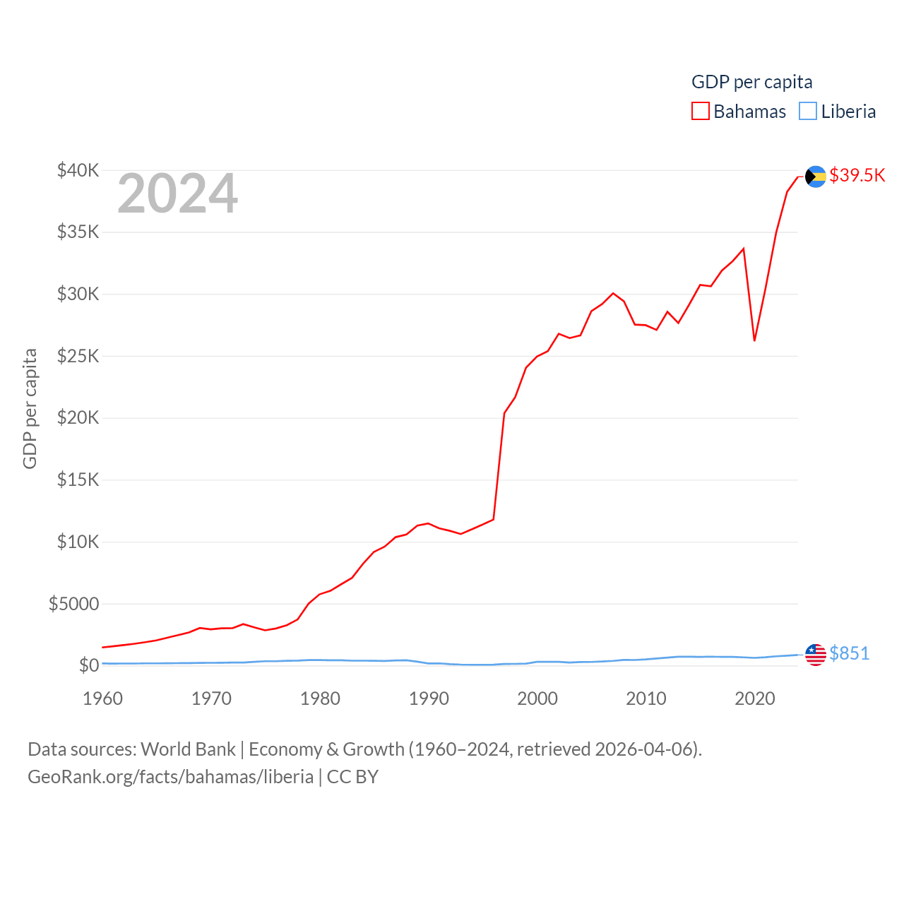 By GDP, The Bahamas ranks 140/197 ($15.8B) and Liberia ranks 163/197 ($4.78B). By GDP per capita, The Bahamas ranks 30/197 ($39,455), while Liberia ranks 184/197 ($851).