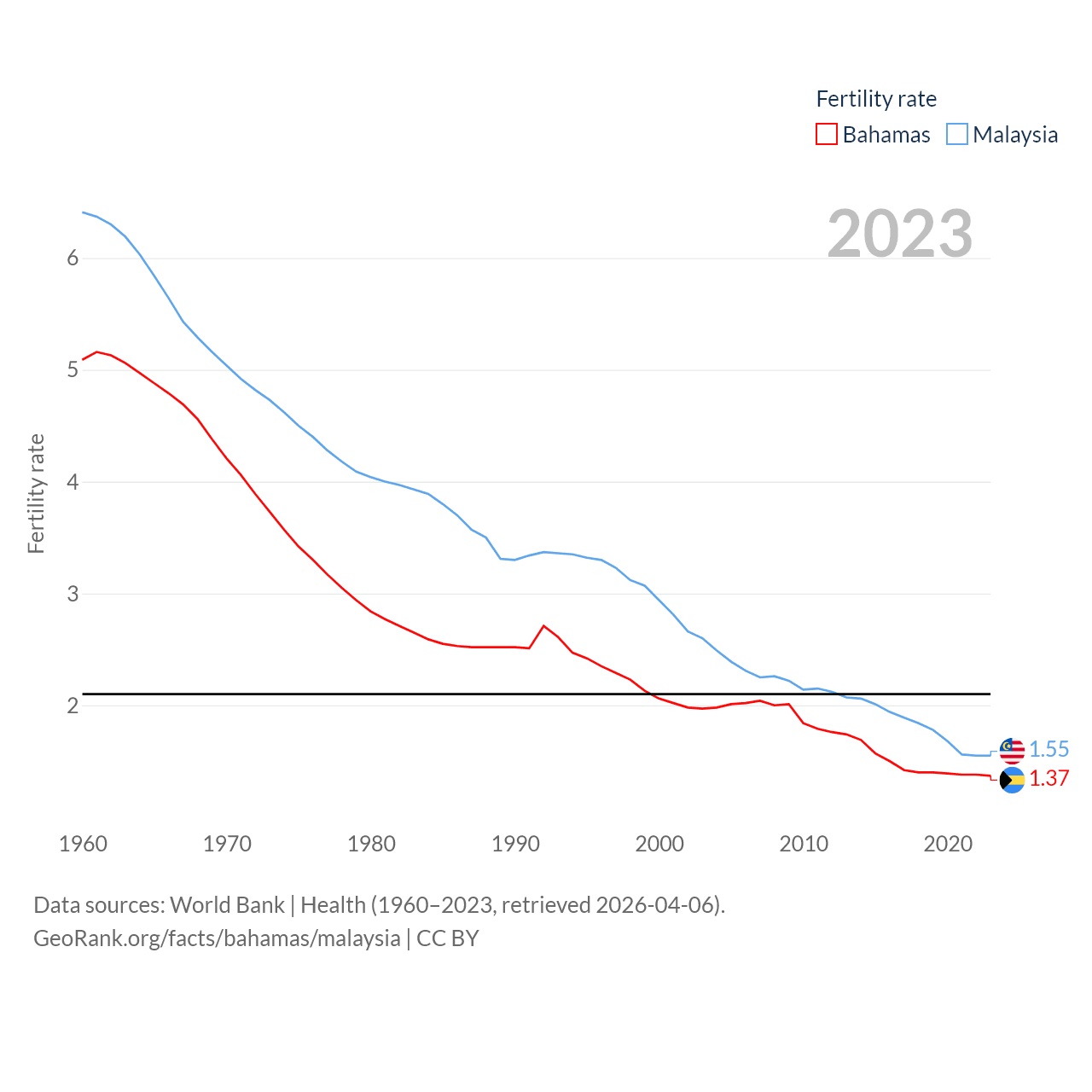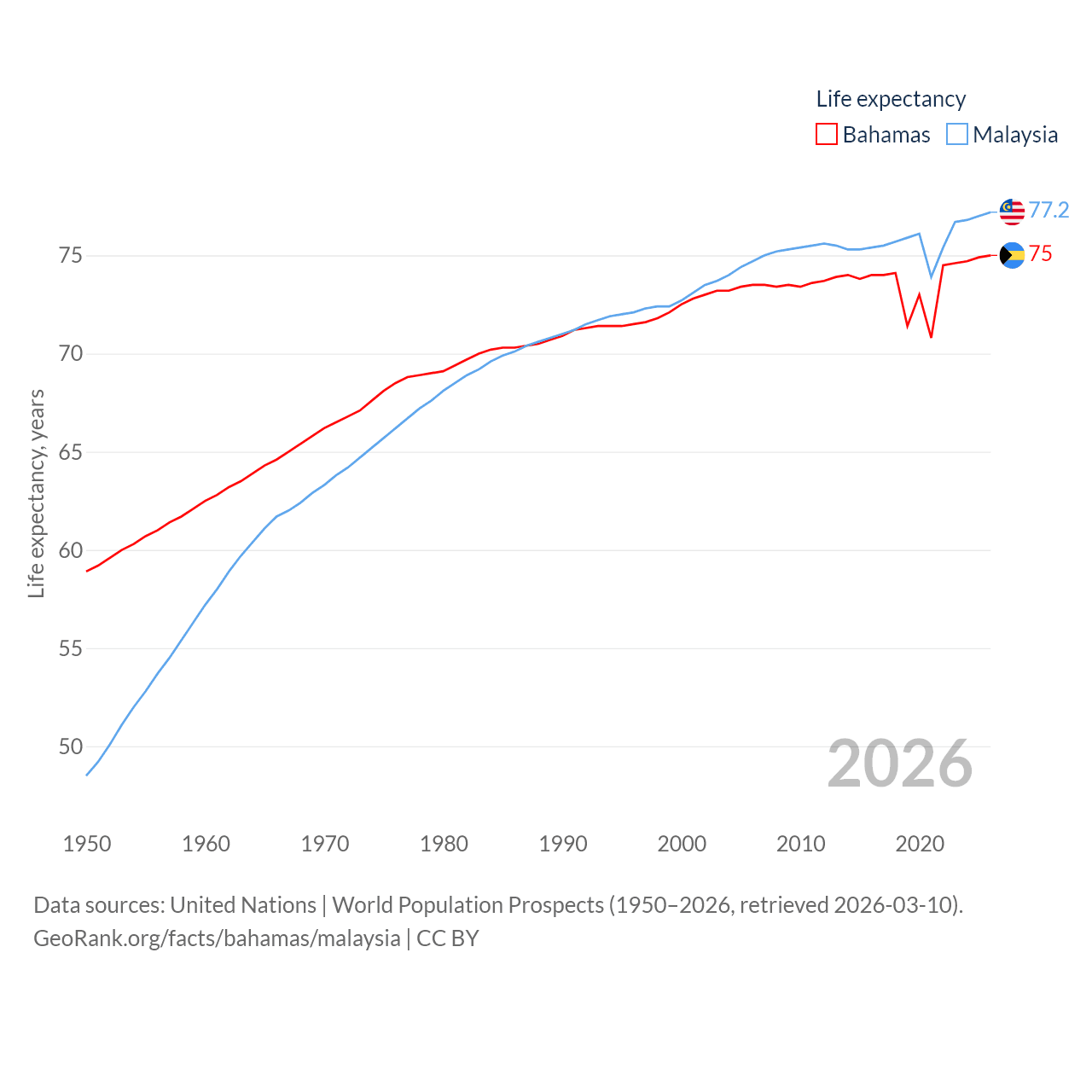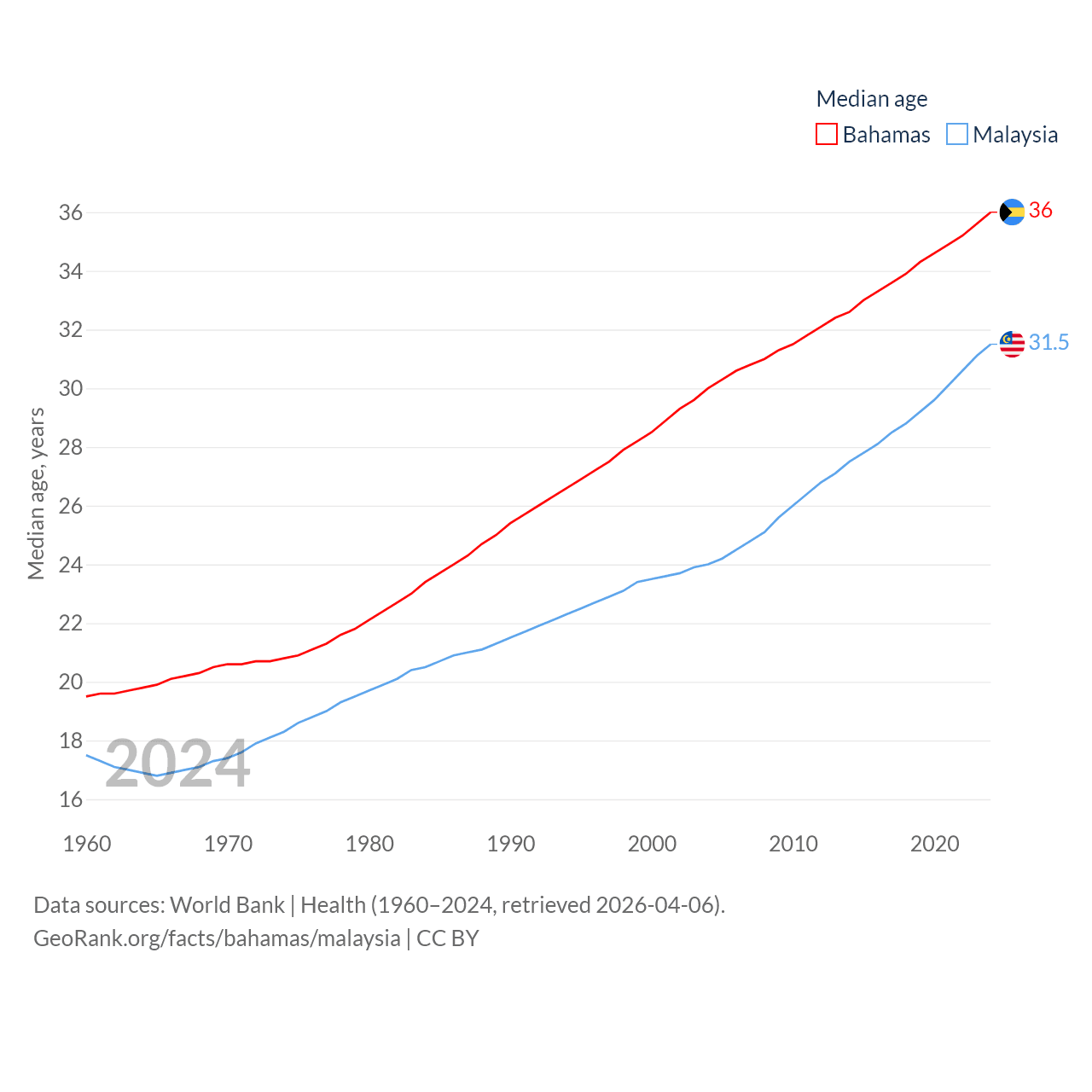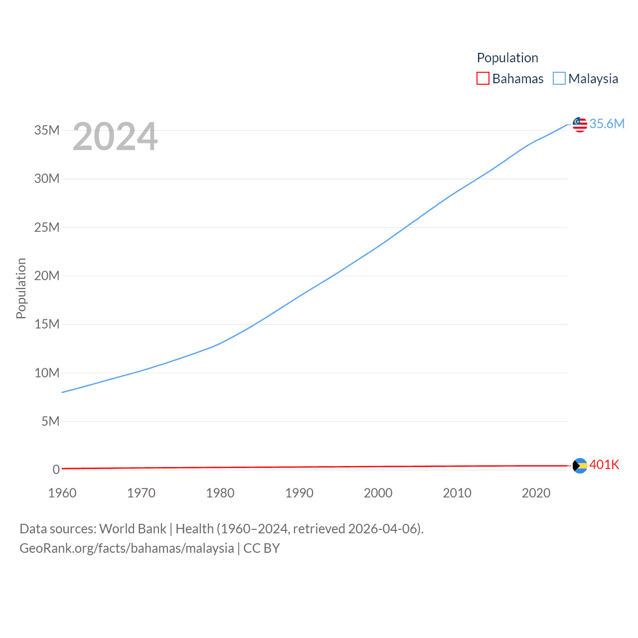 The Bahamas has a population of 401K (ranked 172/197), compared with 35.6M in Malaysia (ranked 44/197). The Bahamas' land area is 3,865 sq mi versus 126,854 sq mi for Malaysia (ranked 162nd vs. 65th).