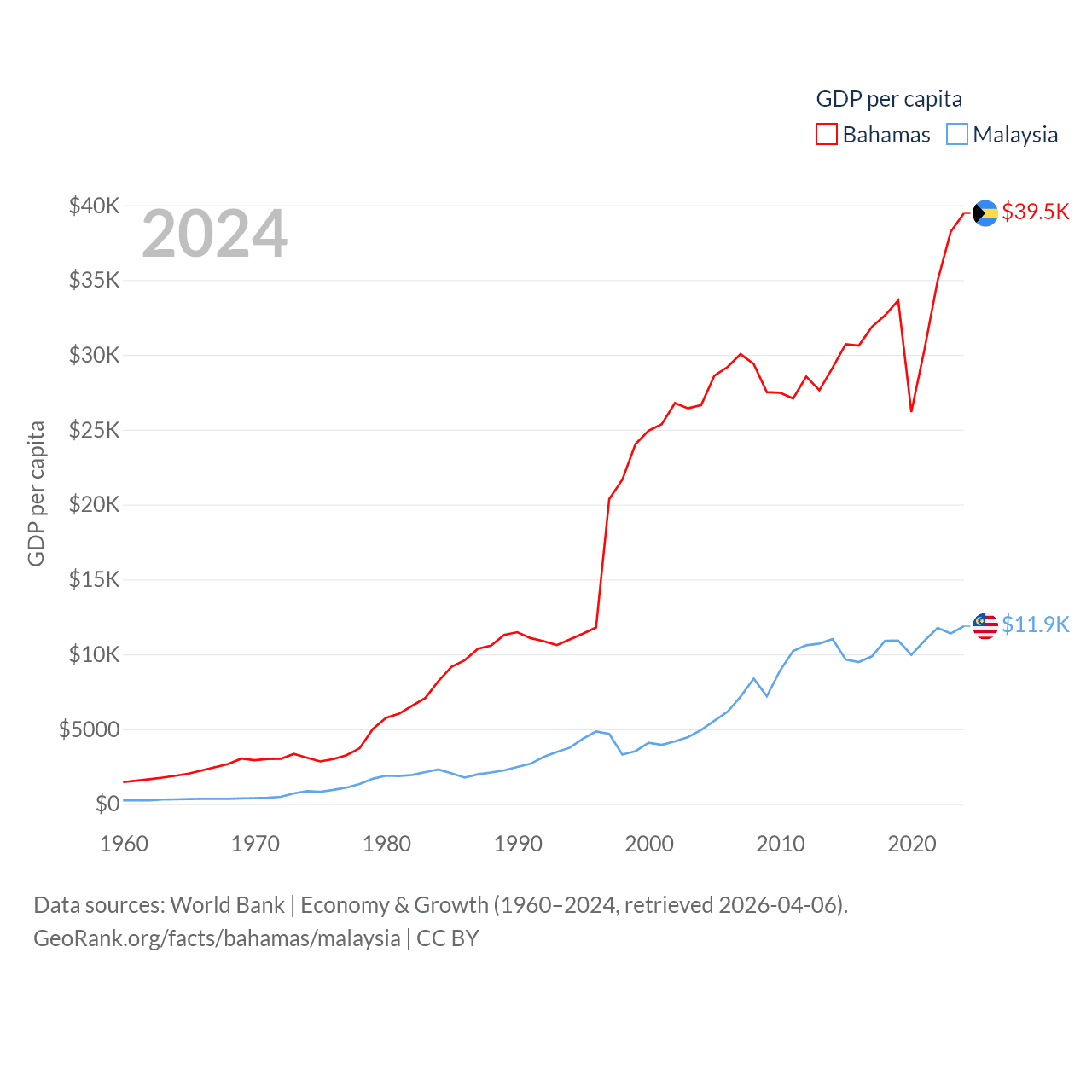 By GDP, The Bahamas ranks 140/197 ($15.8B) and Malaysia ranks 38/197 ($422B). By GDP per capita, The Bahamas ranks 30/197 ($39,455), while Malaysia ranks 79/197 ($11,874).