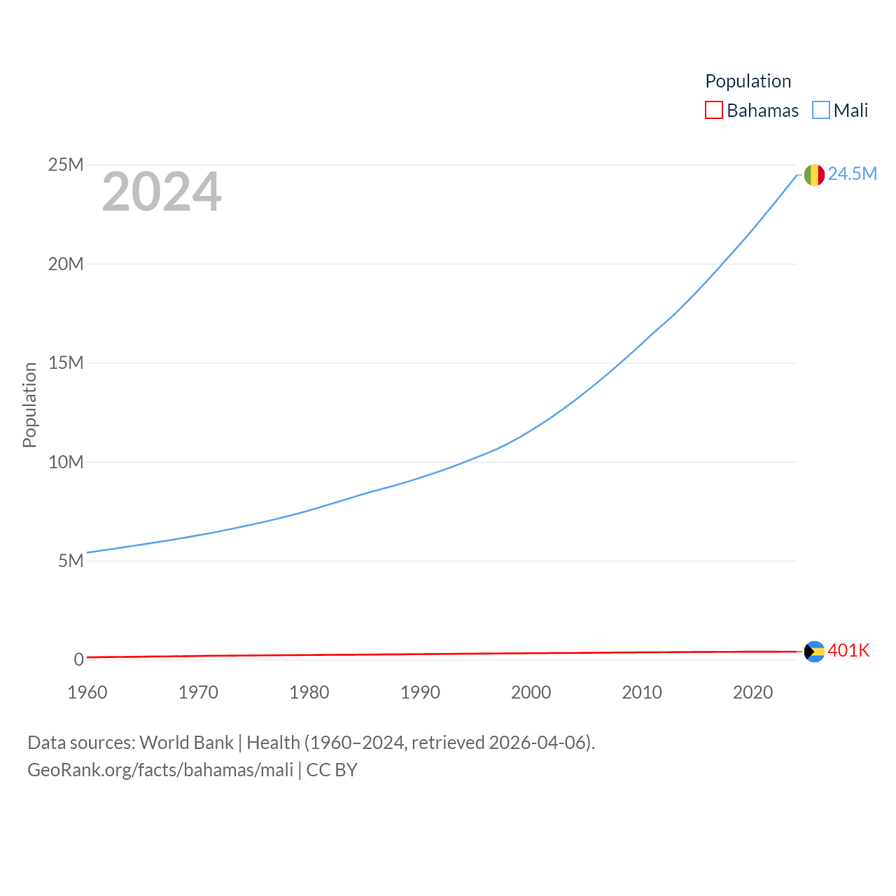 The Bahamas has a population of 401K (ranked 172/197), compared with 24.5M in Mali (ranked 58/197). The Bahamas' land area is 3,865 sq mi versus 471,118 sq mi for Mali (ranked 162nd vs. 23rd).