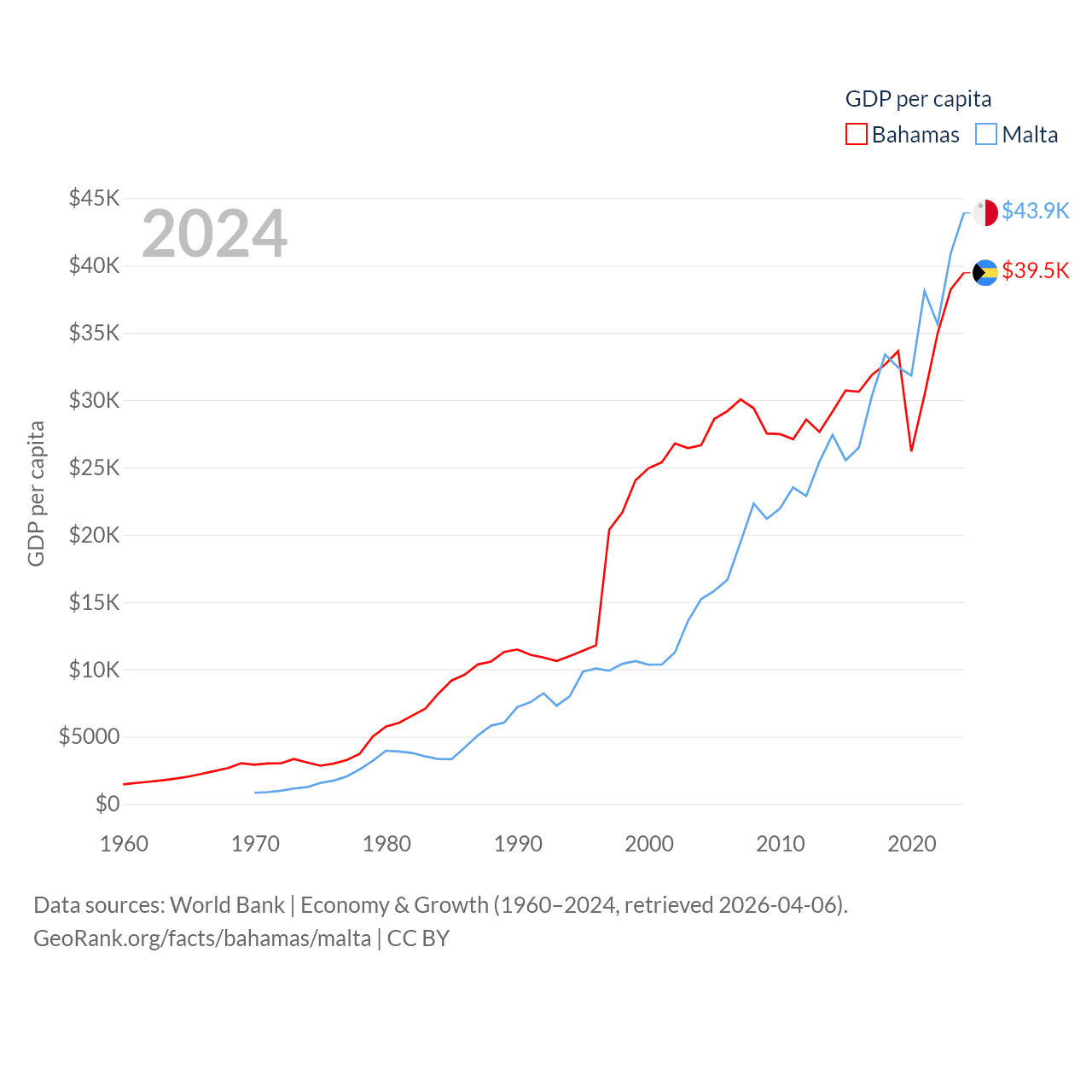 By GDP, The Bahamas ranks 140/197 ($15.8B) and Malta ranks 119/197 ($25B). By GDP per capita, The Bahamas ranks 30/197 ($39,455), while Malta ranks 28/197 ($43,899).