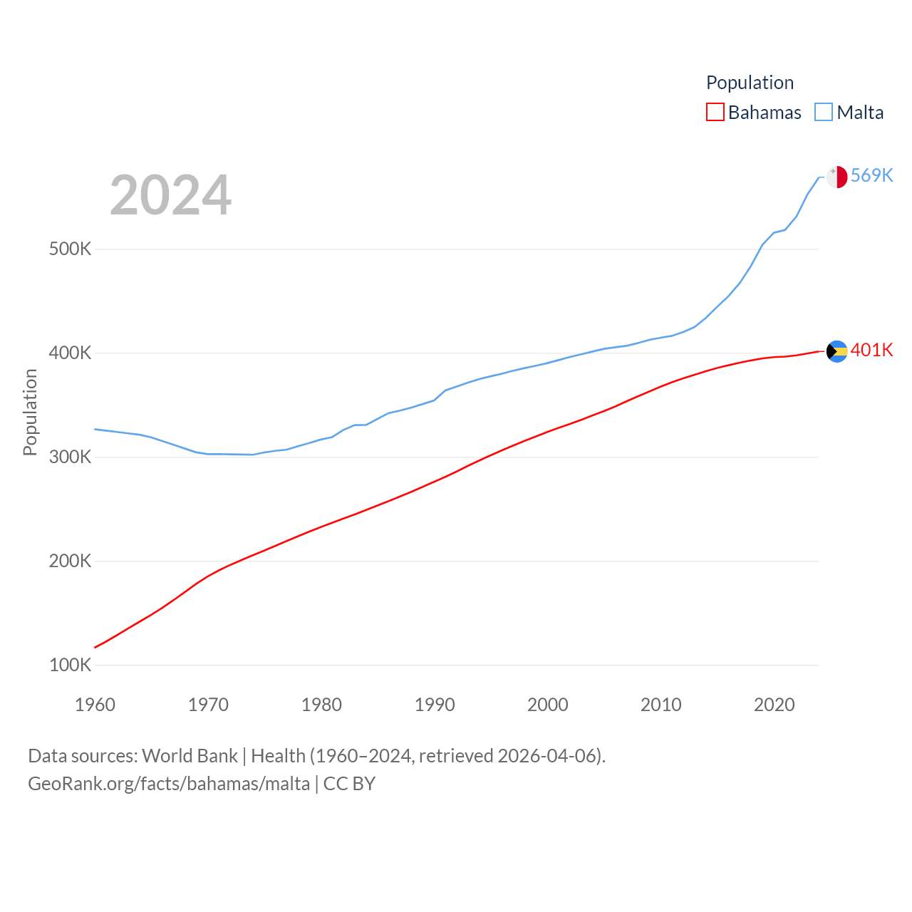 The Bahamas has a population of 401K (ranked 172/197), compared with 569K in Malta (ranked 167/197). The Bahamas' land area is 3,865 sq mi versus 123.6 sq mi for Malta (ranked 162nd vs. 187th).