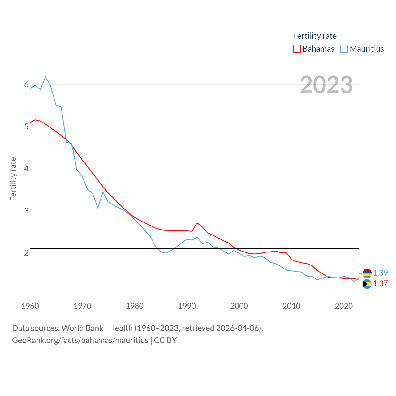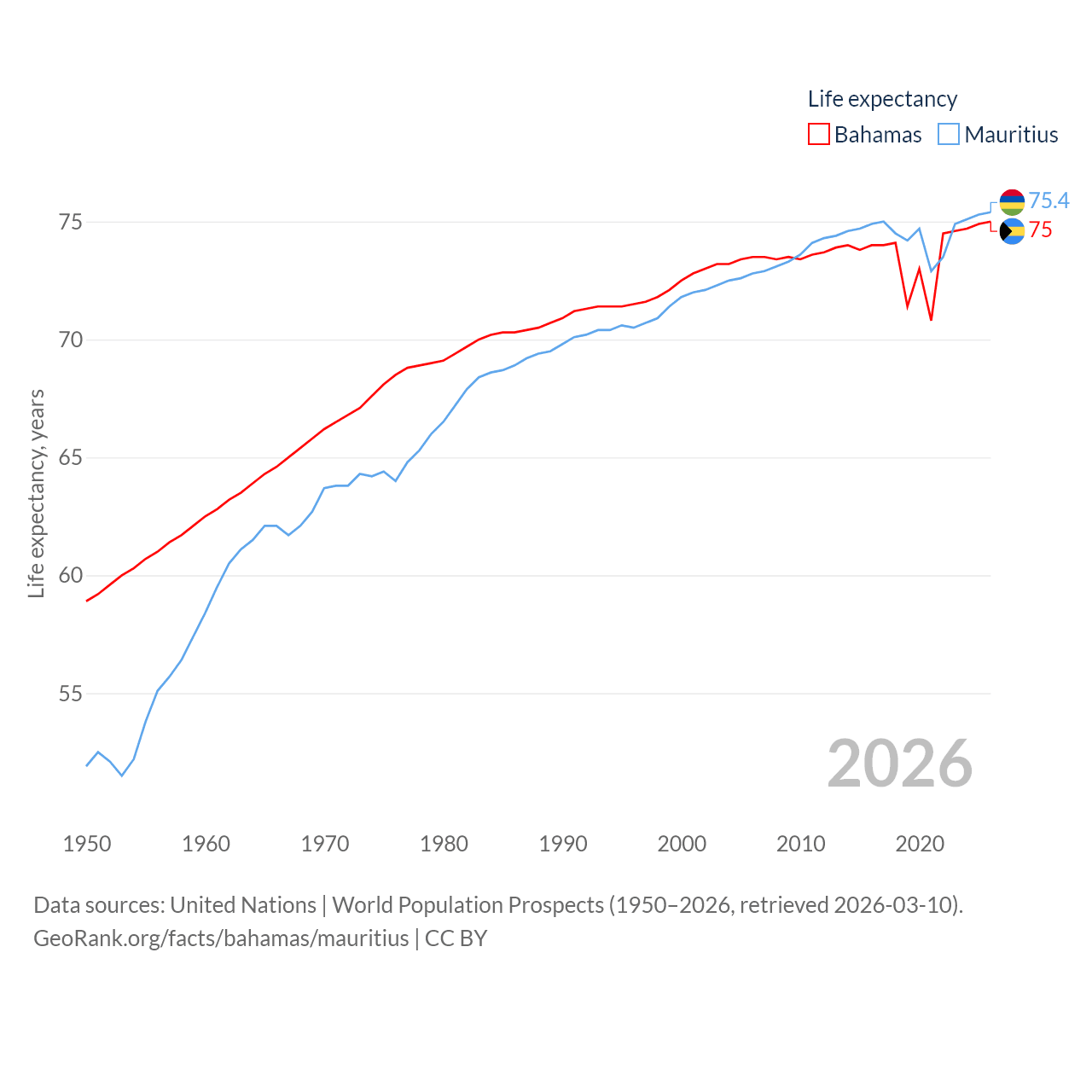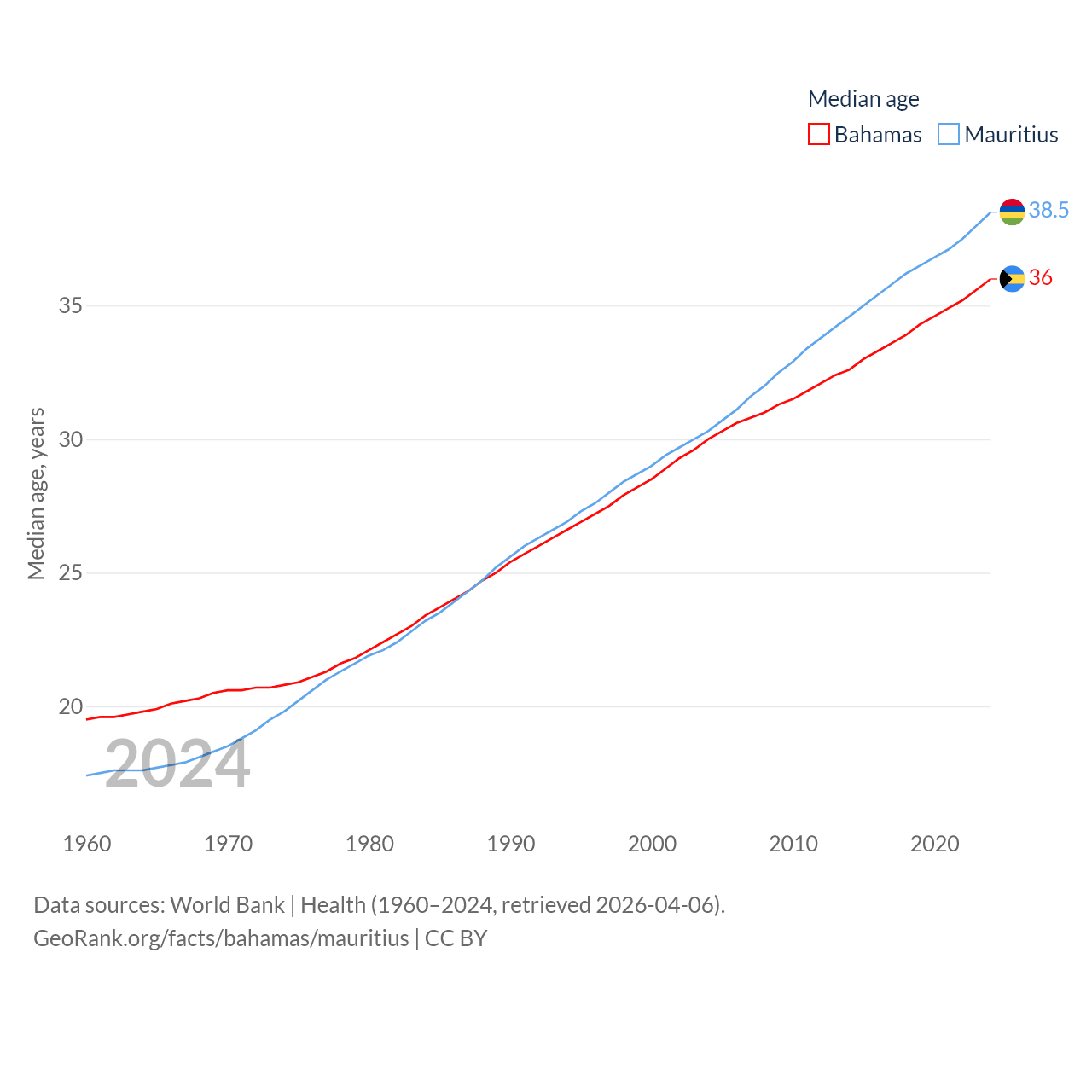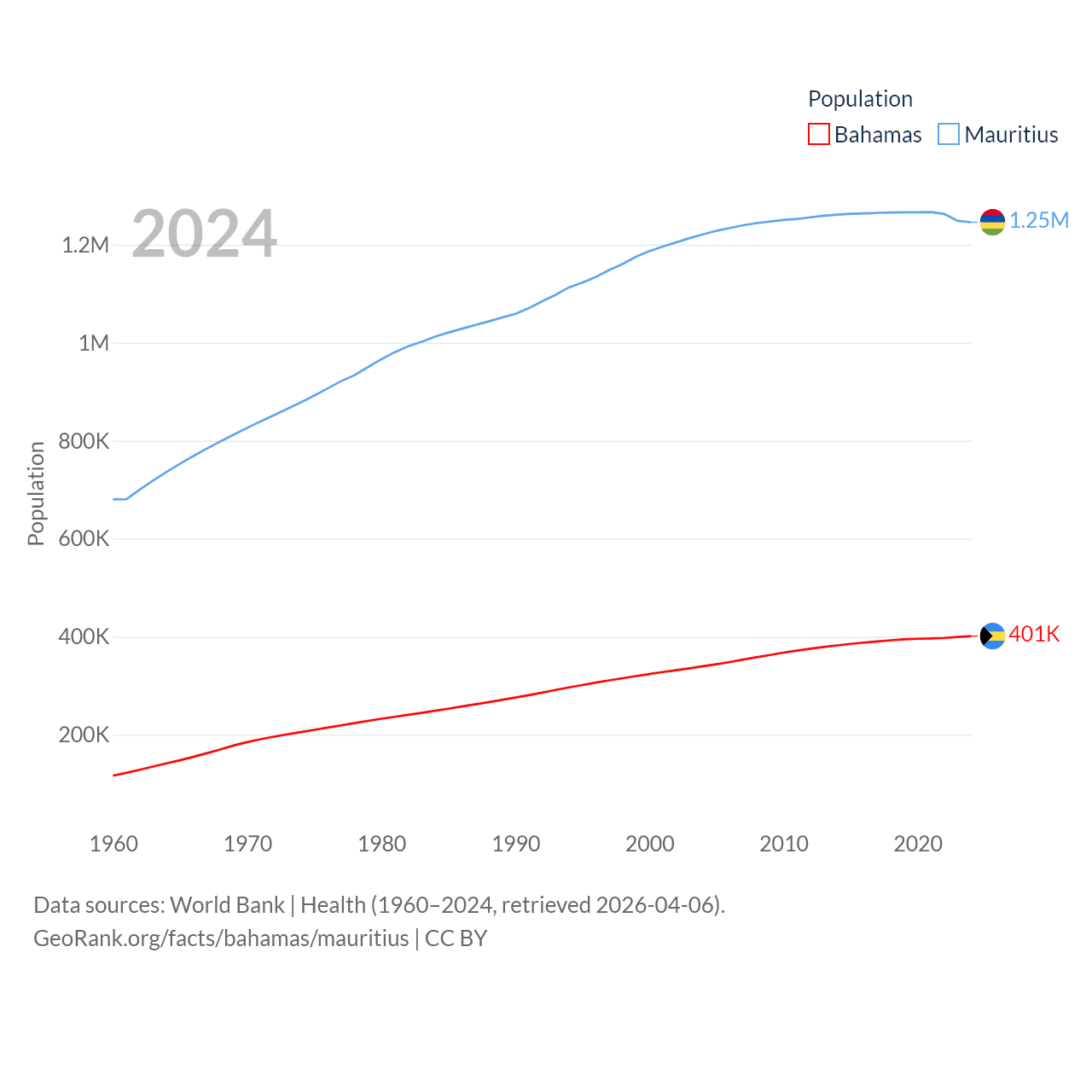 The Bahamas has a population of 401K (ranked 172/197), compared with 1.25M in Mauritius (ranked 156/197). The Bahamas' land area is 3,865 sq mi versus 771 sq mi for Mauritius (ranked 162nd vs. 170th).
